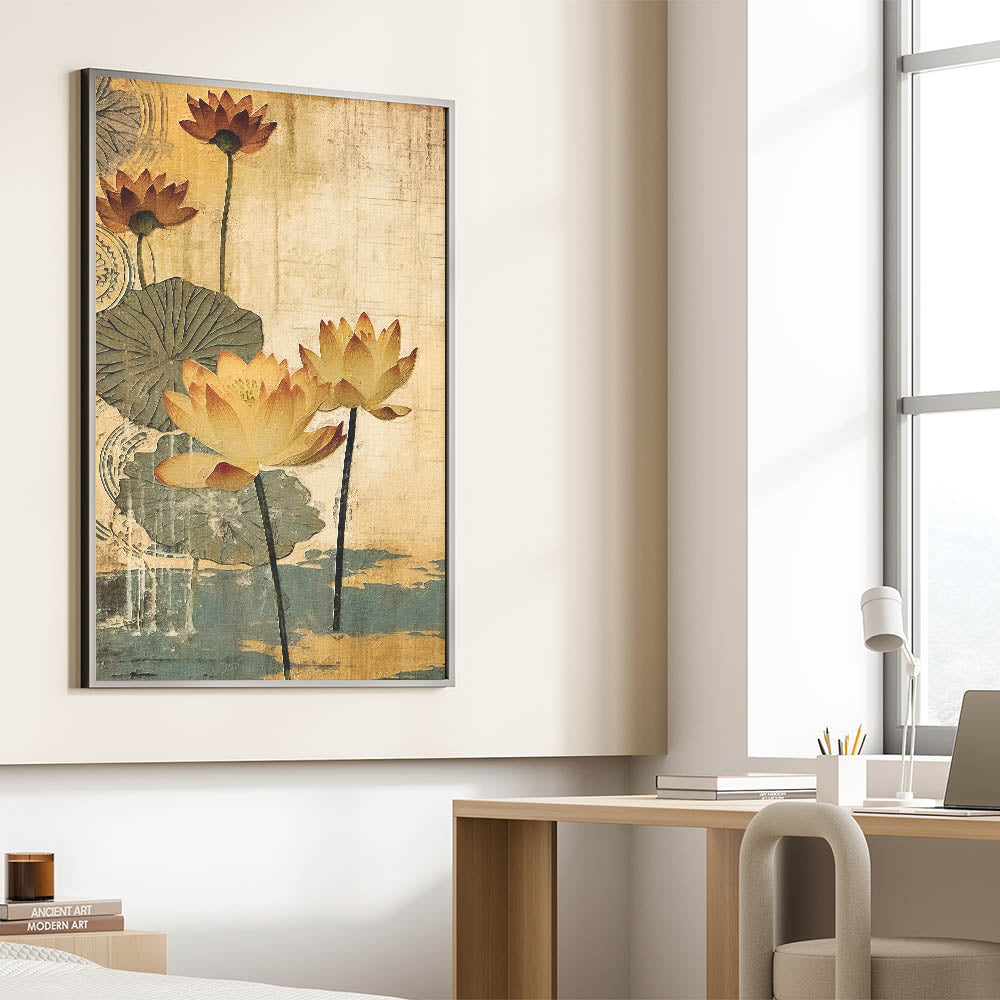 Embrace the serene beauty of nature with this abstract lotus floral art, inspired by traditional Eastern aesthetics. This artwork features vibrant lotus flowers in shades of warm yellow and orange, set against a textured, earthy background. The intricate details of the lotus leaves and subtle background patterns bring a sense of depth and tranquility to this piece, making it an ideal addition to any room.