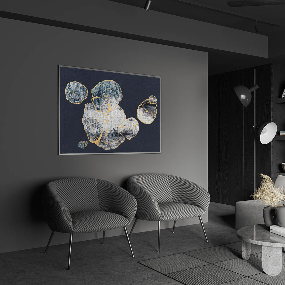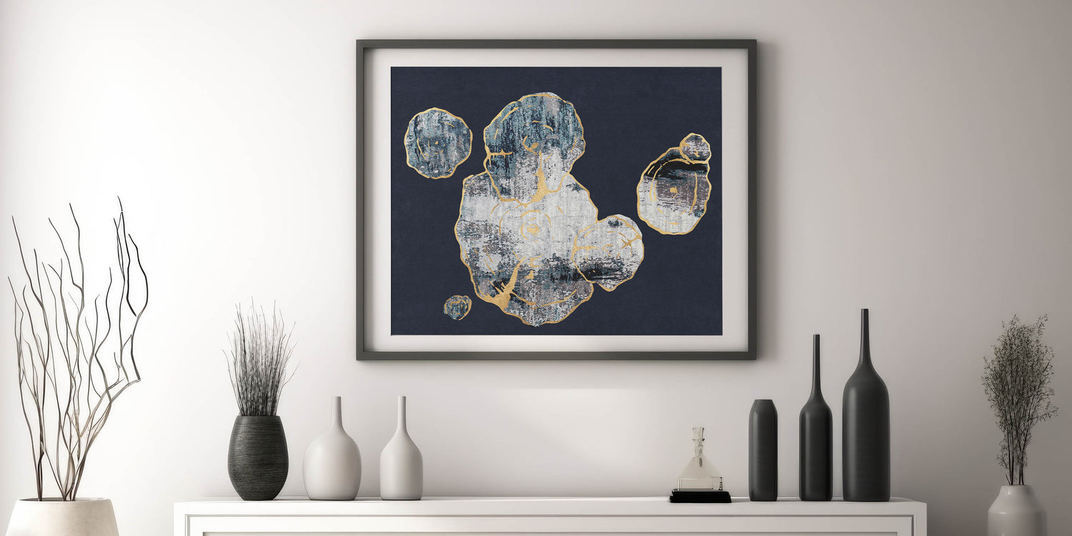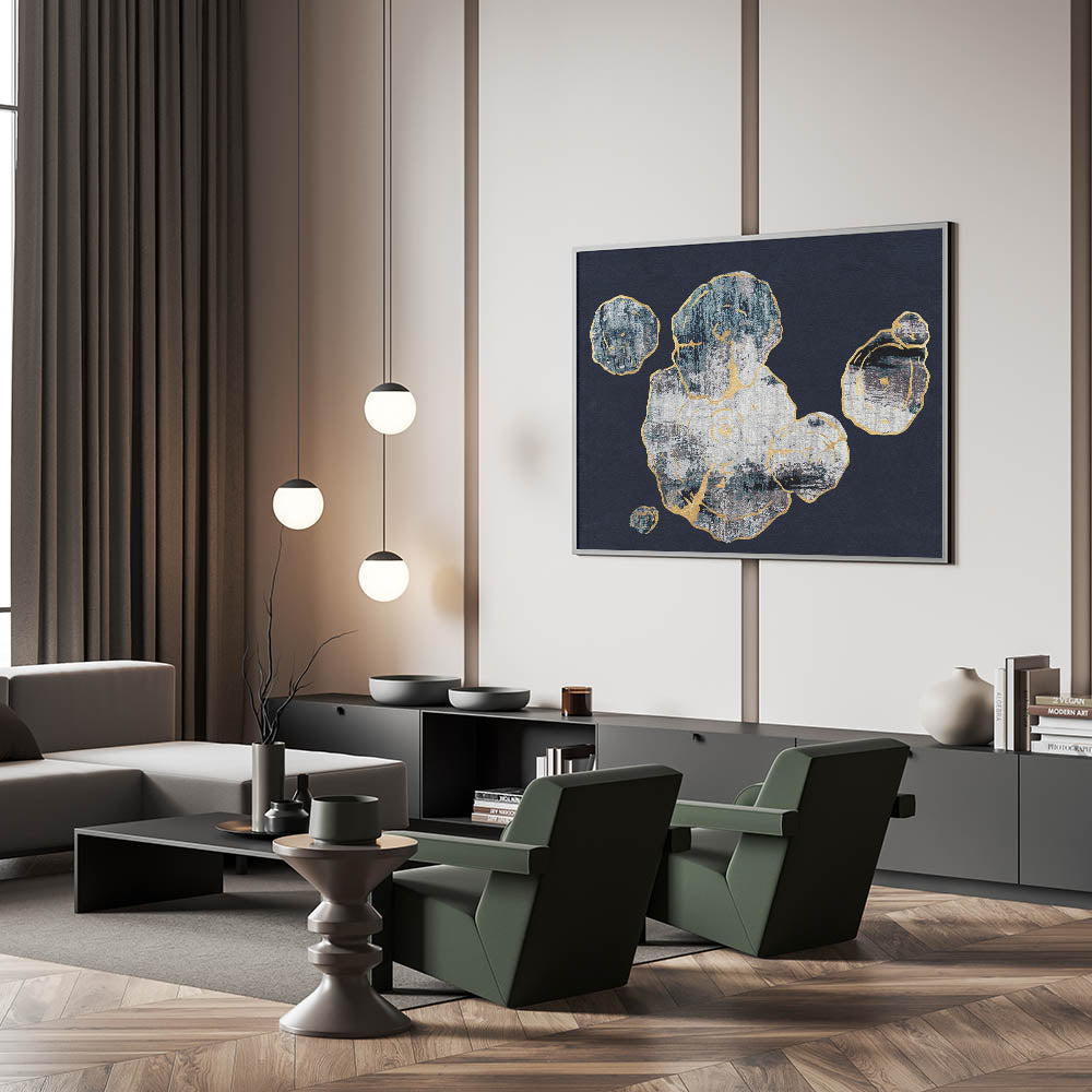 This Abstract Organic Shapes with Gold Highlights canvas captures the essence of natural forms through a contemporary lens. The design features a series of organic shapes, outlined with delicate gold highlights, set against a deep navy background. The texture and contrast between the gold accents and the dark backdrop create a captivating visual experience, making this piece a perfect addition to any modern or minimalist interior.