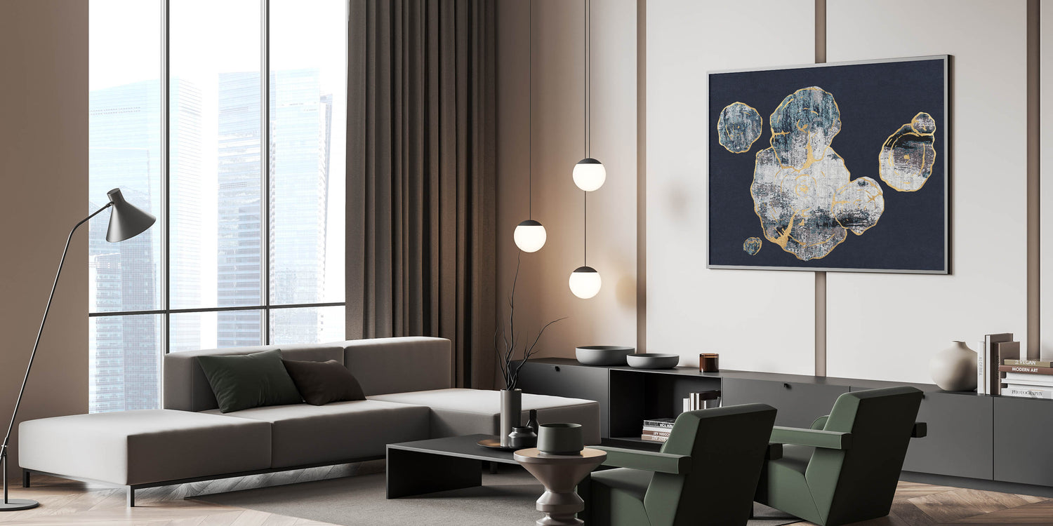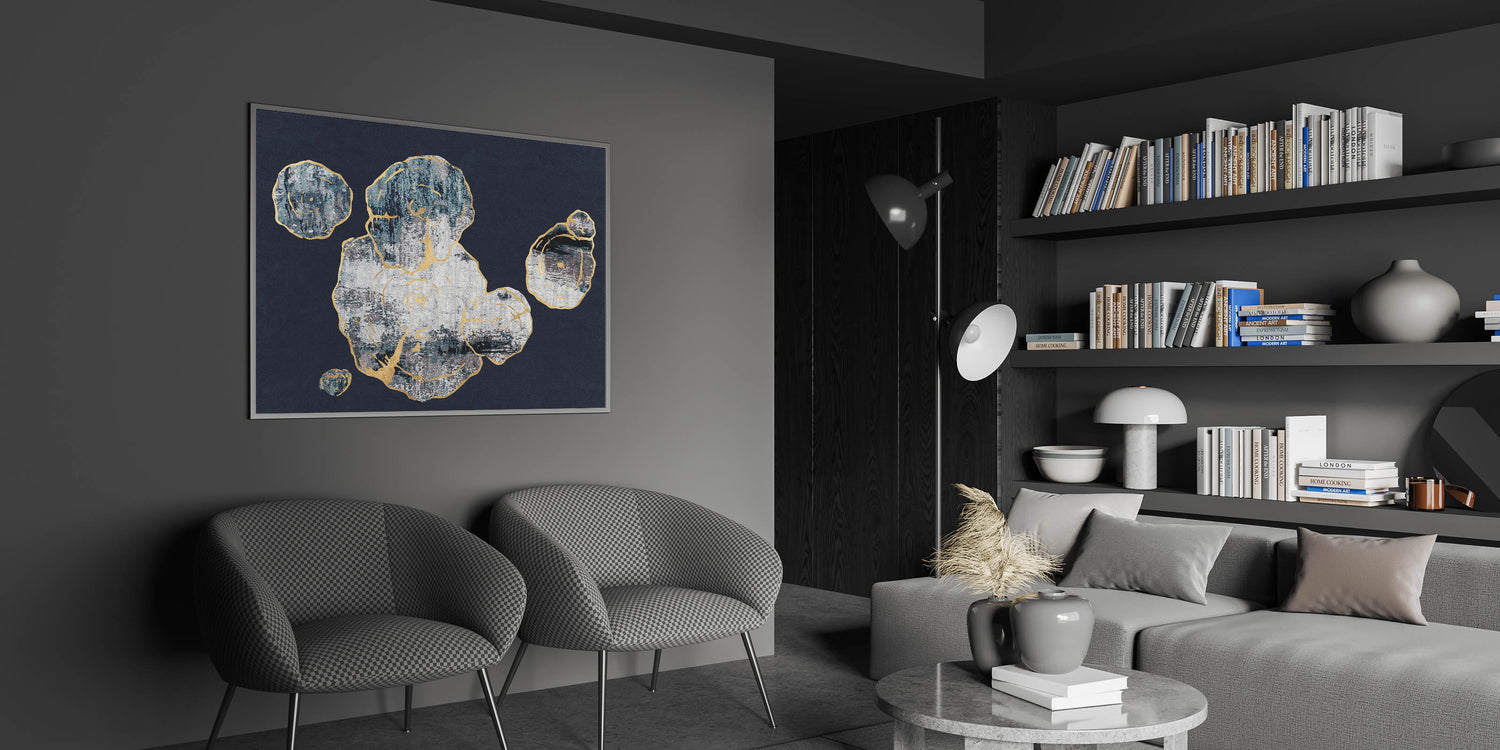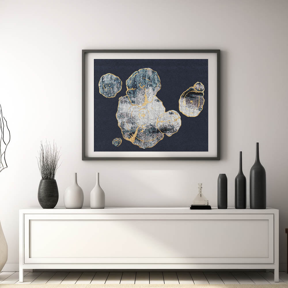 This Abstract Organic Shapes with Gold Highlights canvas captures the essence of natural forms through a contemporary lens. The design features a series of organic shapes, outlined with delicate gold highlights, set against a deep navy background. The texture and contrast between the gold accents and the dark backdrop create a captivating visual experience, making this piece a perfect addition to any modern or minimalist interior.