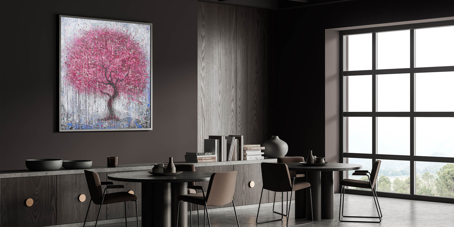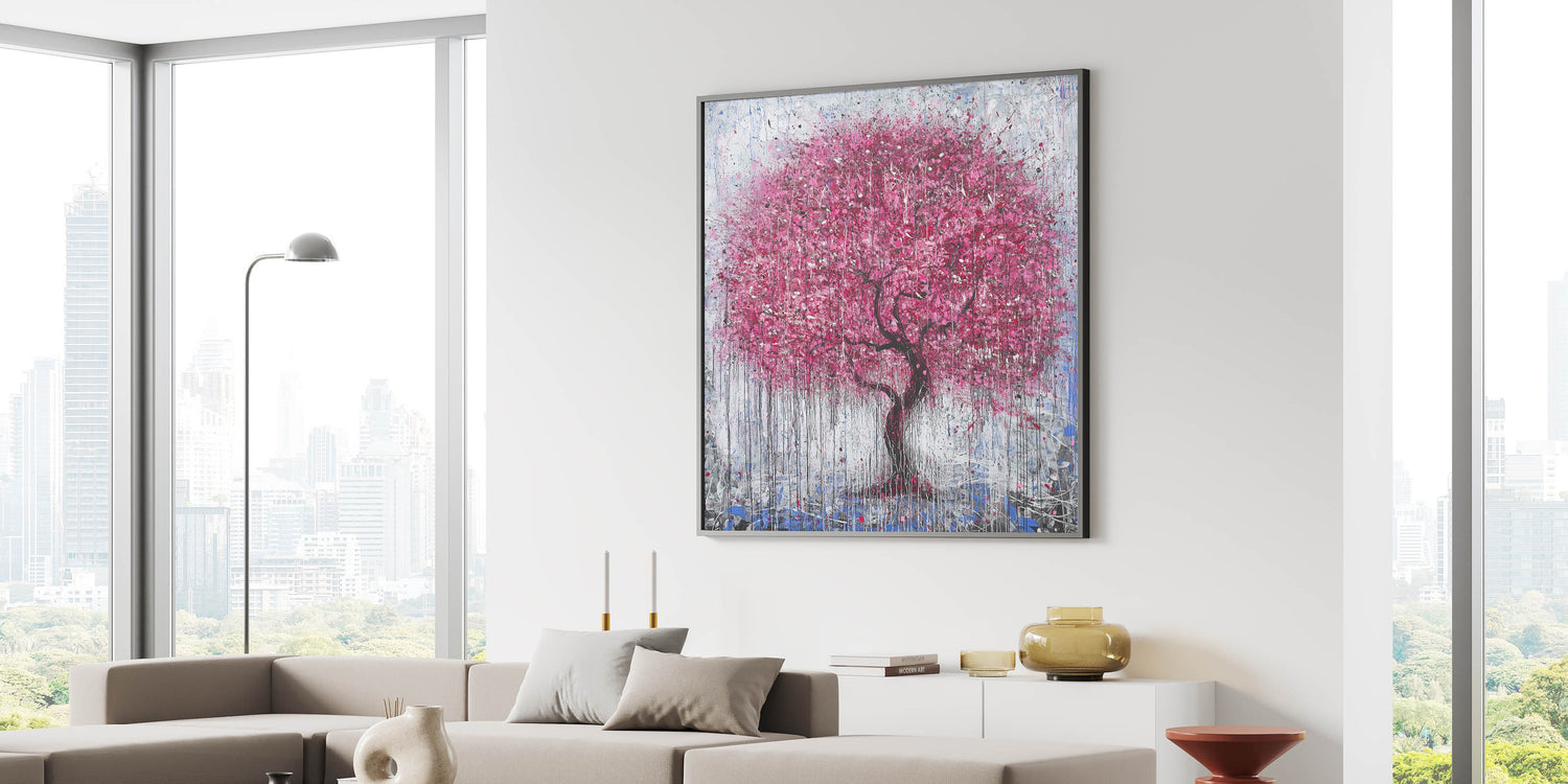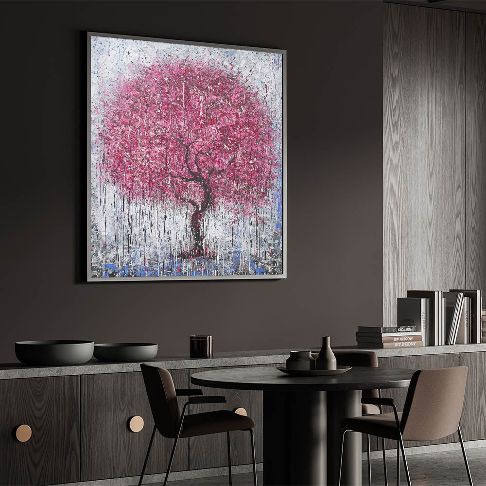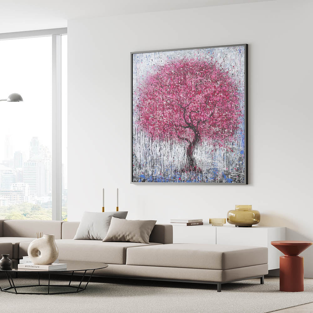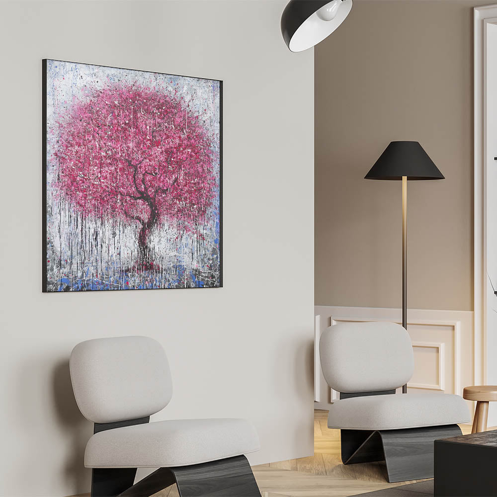Elevate your space with this Abstract Pink Floral Tree Canvas, a stunning blend of modern art and nature-inspired beauty. The centerpiece of this design is a vibrant pink tree with intricate branches, set against a textured gray and white backdrop. Accentuated by dripping paint details, this artwork brings a contemporary edge to any room. Subtle hints of blue at the base add a refreshing contrast, making this piece perfect for living rooms, bedrooms, or offices.