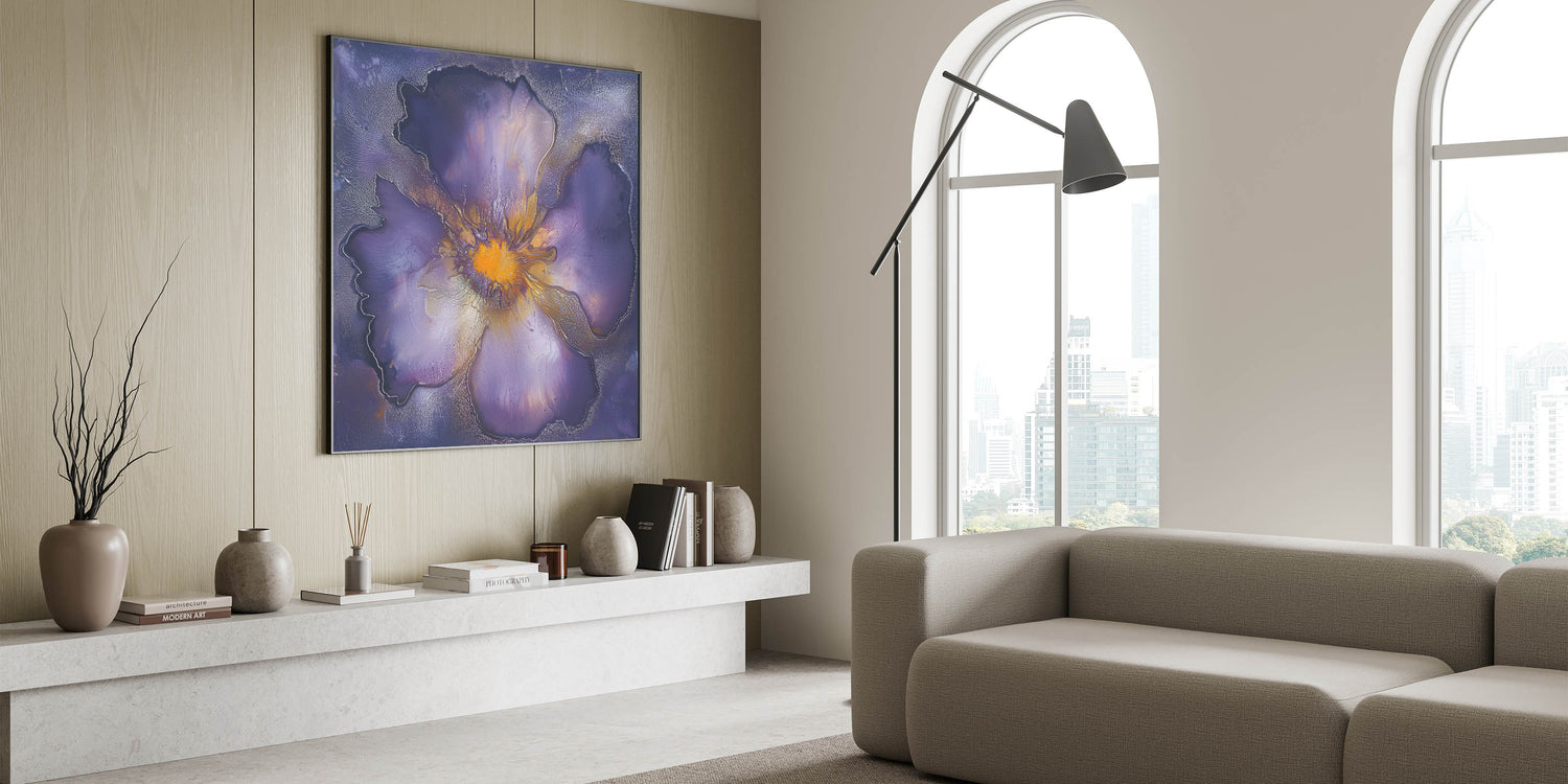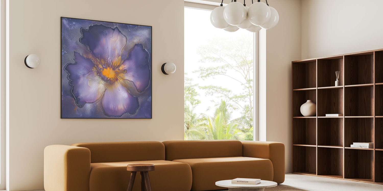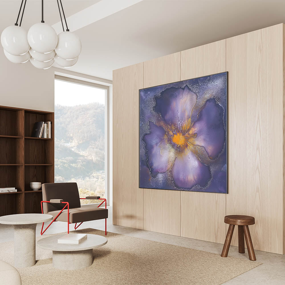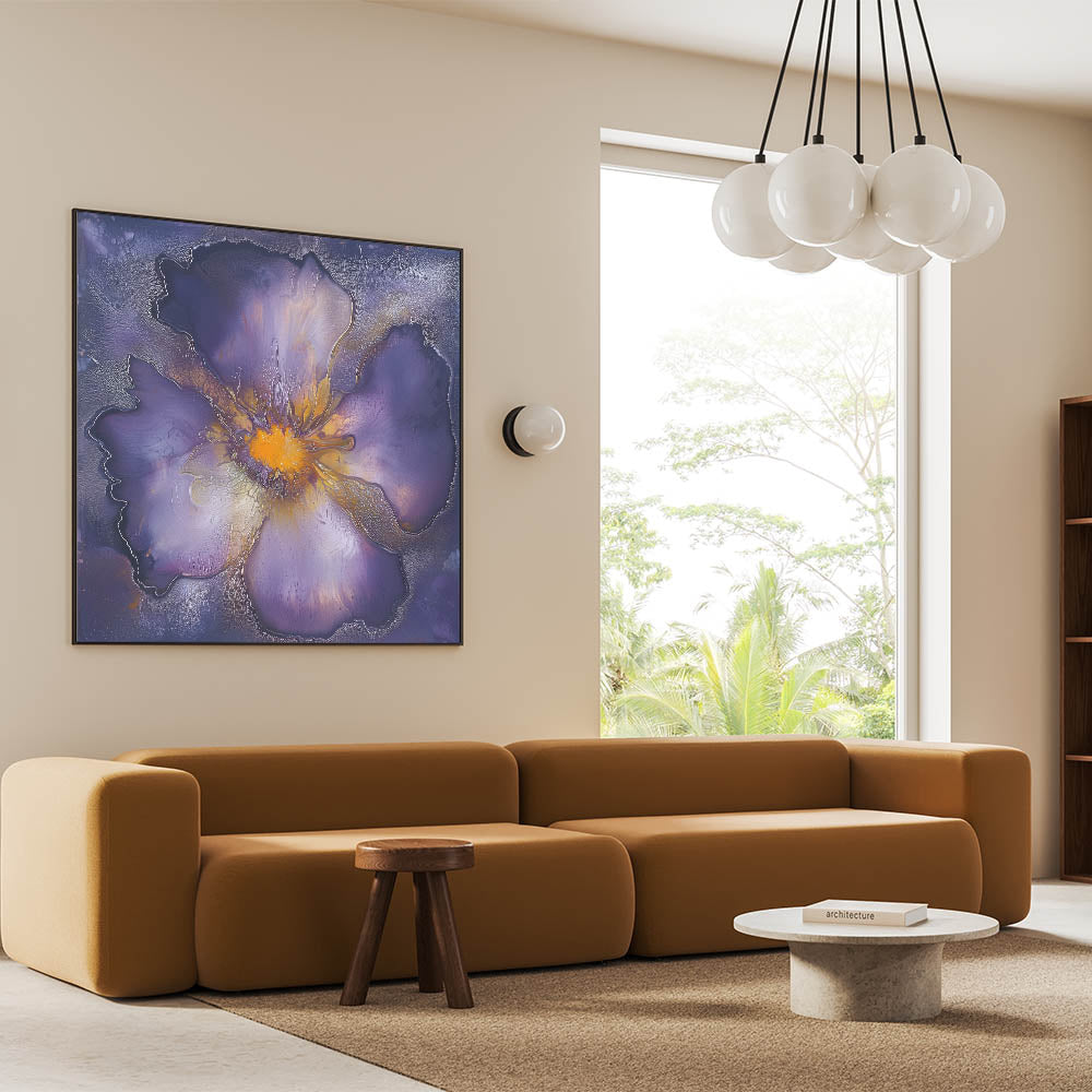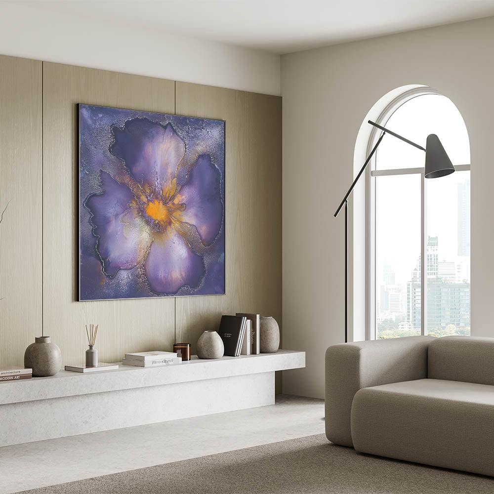 Elevate your space with this captivating abstract floral minimalist art. This artwork features a vibrant purple bloom with soft, flowing textures and a radiant golden center, symbolizing beauty and elegance. The blending of deep purples, gentle whites, and luminous gold creates a harmonious and enchanting composition, perfect for modern, transitional, or eclectic interiors.