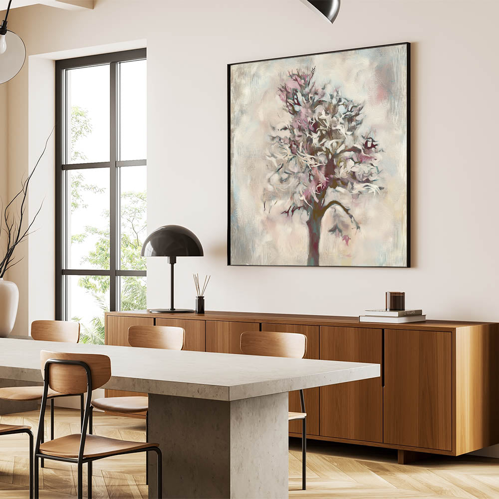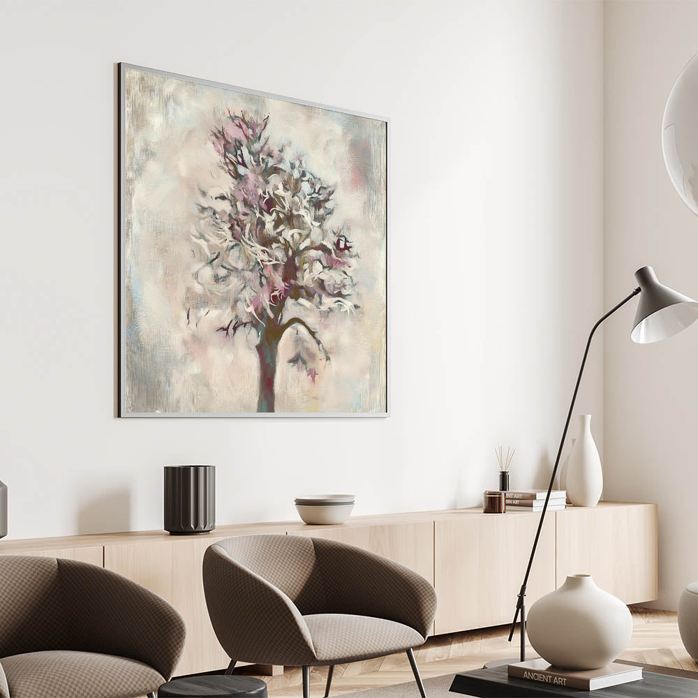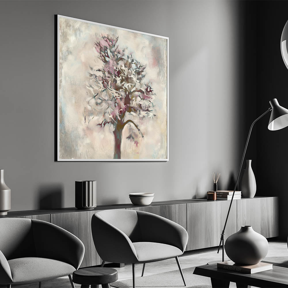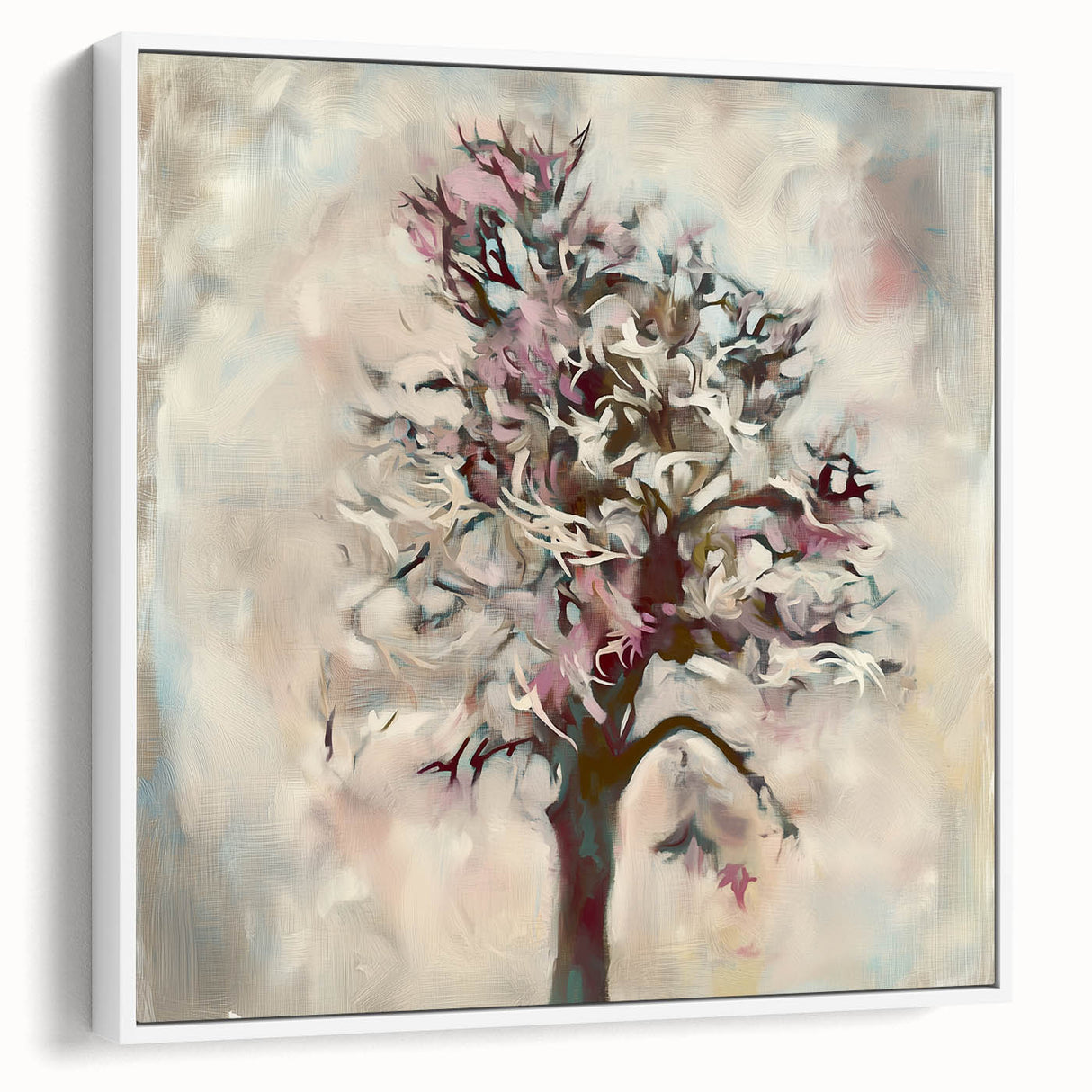 Introduce a serene and artistic element to your decor with this Abstract Tree Canvas Art, a minimalist yet captivating portrayal of nature’s elegance. This artwork features a single tree with flowing, delicate branches in soft tones of blush pink, white, and beige. The muted background enhances the tree's graceful details, creating a dreamy, ethereal aesthetic.