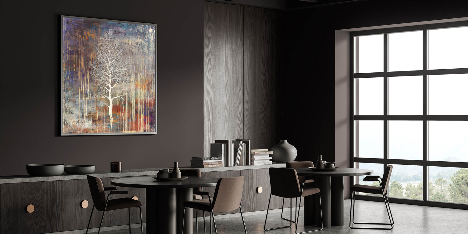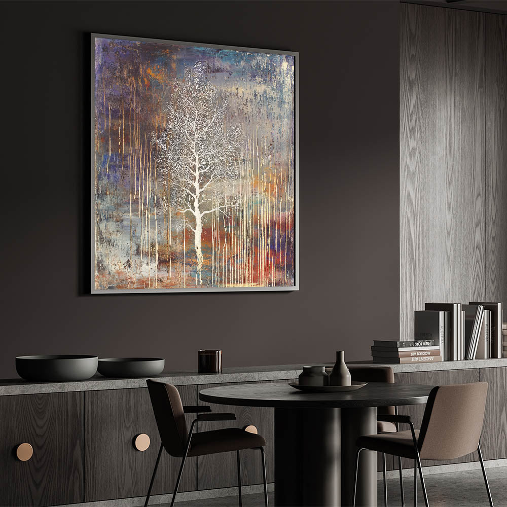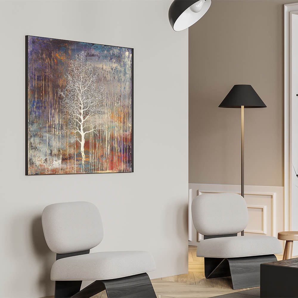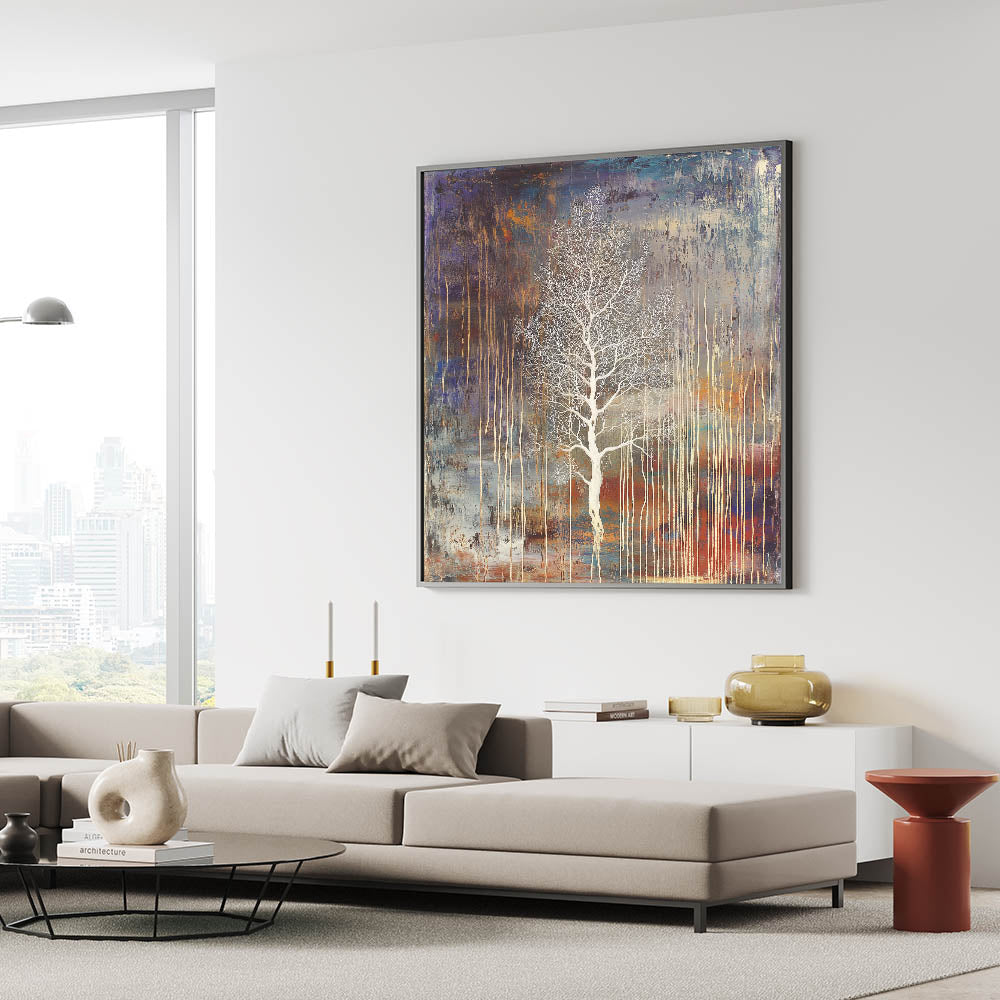 Bring bold energy into your home with this Abstract White Tree Canvas, a dynamic fusion of organic beauty and modern abstraction. The striking white tree, with its intricate branches, stands boldly against a backdrop of vibrant multicolors, including red, gold, and darker hues. The dripping paint effect adds a raw, expressive element to the design, creating a unique and contemporary aesthetic.