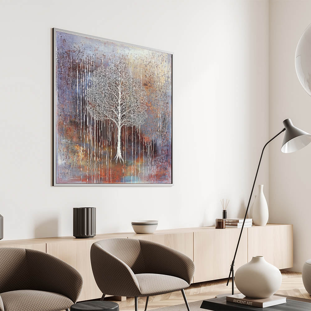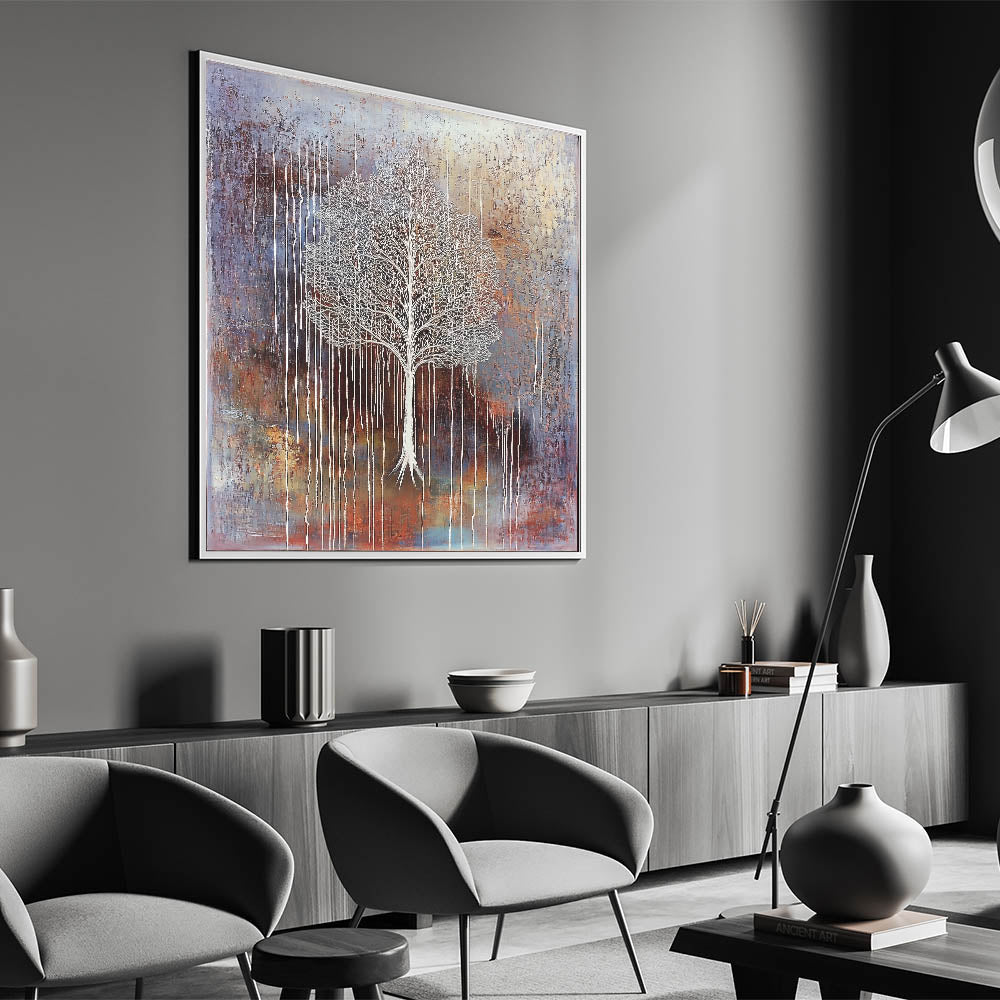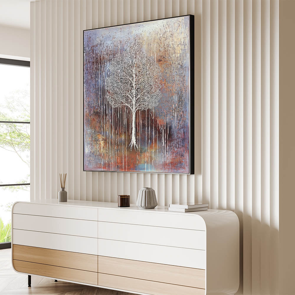 Bring natural elegance and artistic charm to your home with this Abstract White Tree Canvas. Featuring a finely detailed white tree with exposed roots and intricate branches, this artwork is set against a richly textured background of earthy browns, warm oranges, and accents of gold, blue, and purple. The dripping paint effect adds depth and a contemporary edge, making it a captivating centerpiece for any interior space.