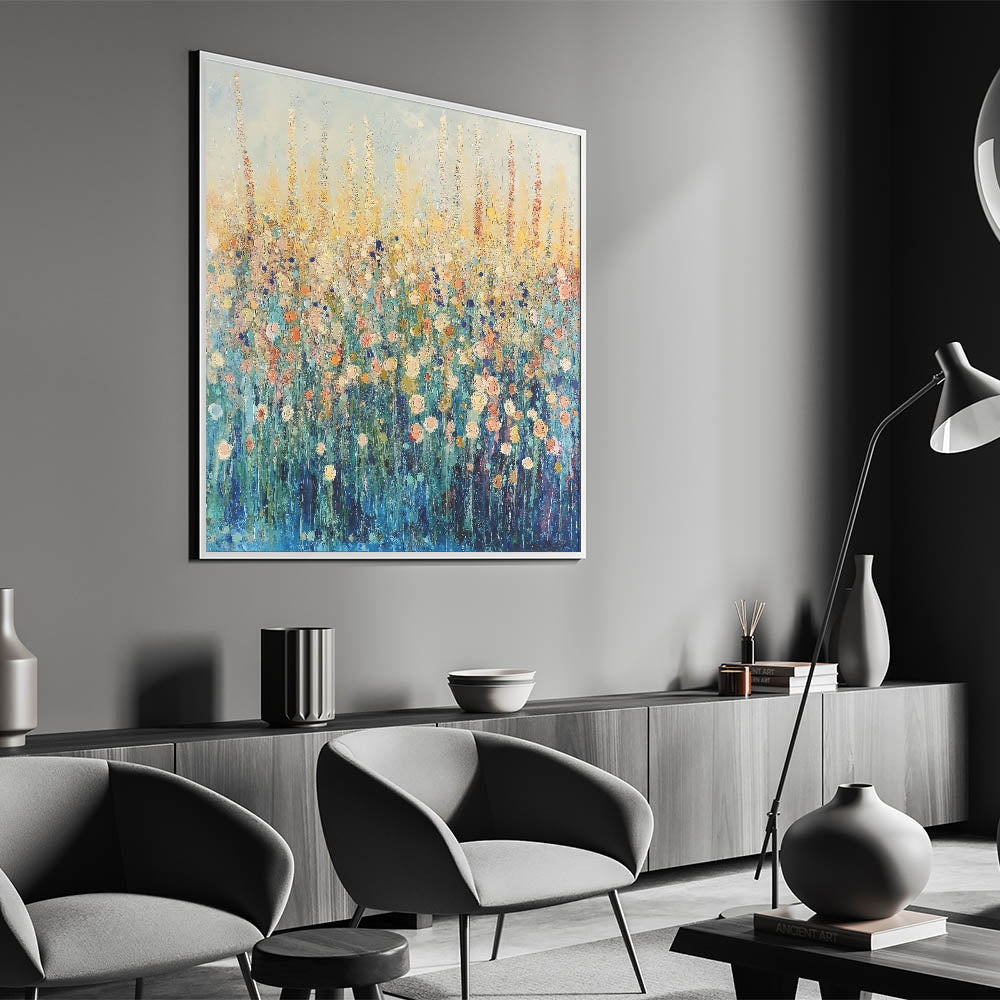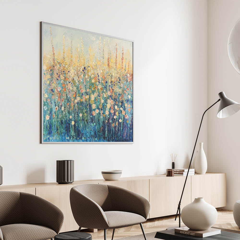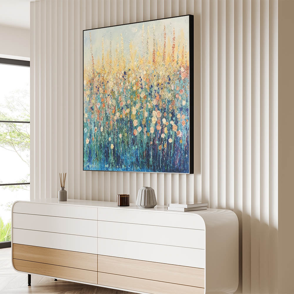 Bring the beauty of a wildflower meadow into your space with this abstract floral art featuring vibrant tones of blue, gold, and soft peach. The expressive brushstrokes and layered textures create depth and movement, evoking the feeling of a sunlit field in full bloom. Perfect for modern or rustic interiors, this artwork adds a refreshing and serene touch to any room.