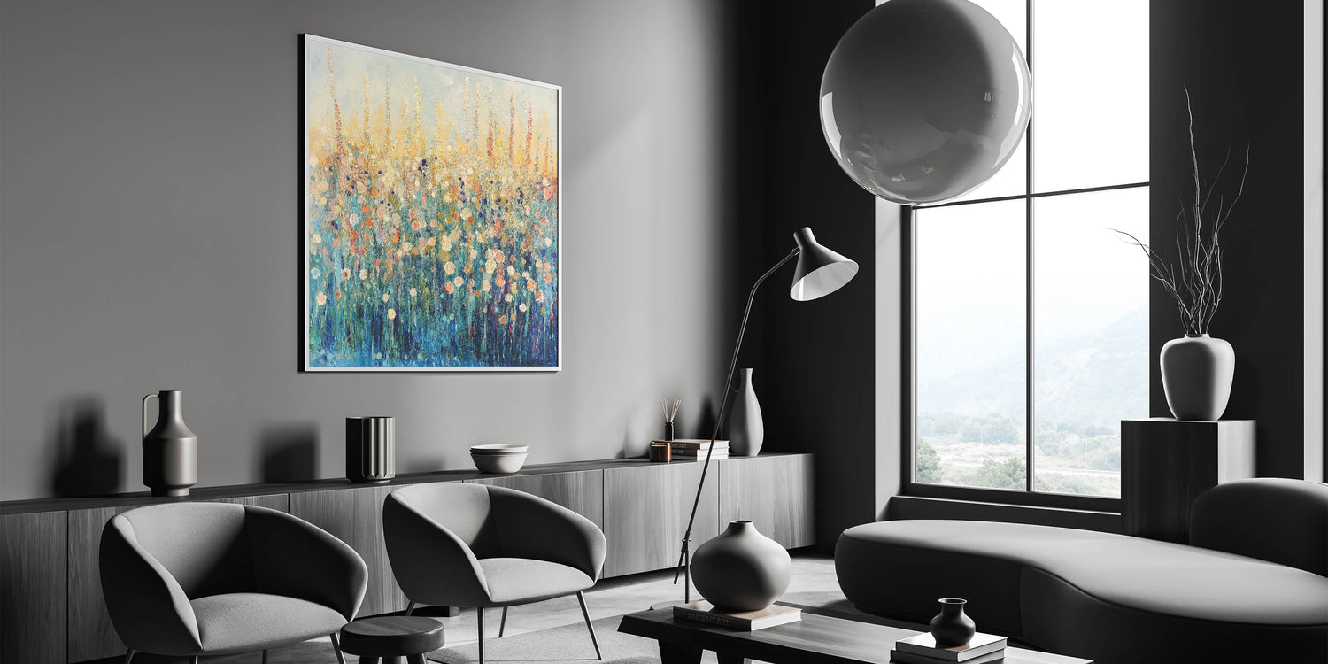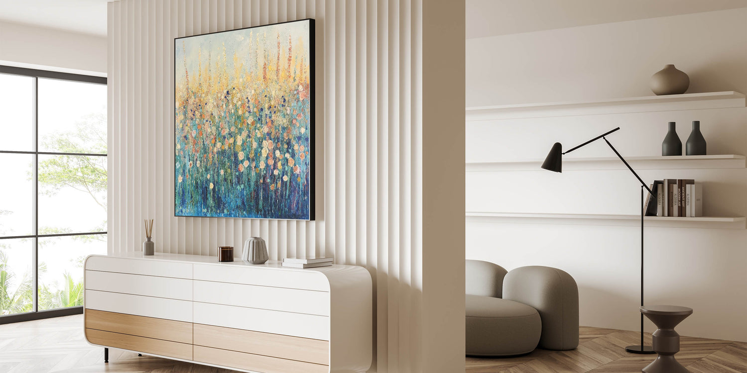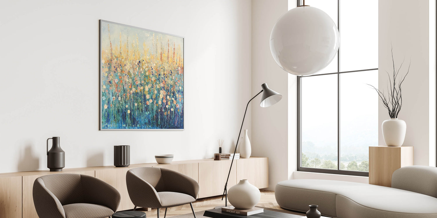 Bring the beauty of a wildflower meadow into your space with this abstract floral art featuring vibrant tones of blue, gold, and soft peach. The expressive brushstrokes and layered textures create depth and movement, evoking the feeling of a sunlit field in full bloom. Perfect for modern or rustic interiors, this artwork adds a refreshing and serene touch to any room.