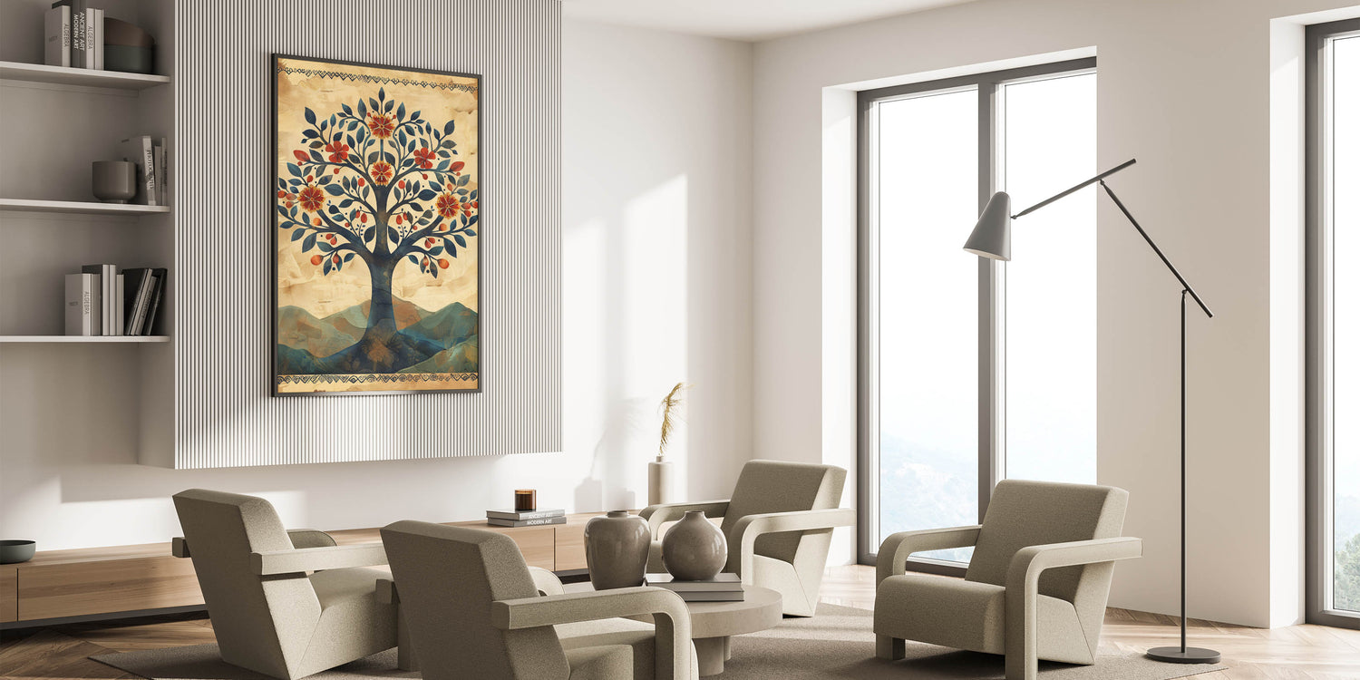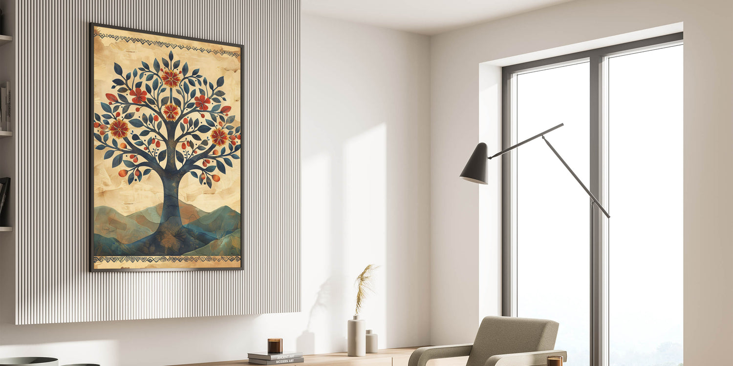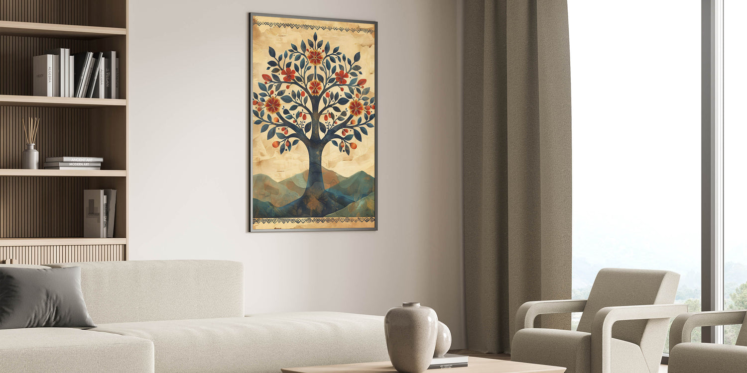Perfect for anyone who loves abstract botanical wall art with a cultural flair, this beautiful floral canvas print adds personality and warmth to your home. Let this artistic tree design inspire a sense of growth, resilience, and natural beauty in your space.