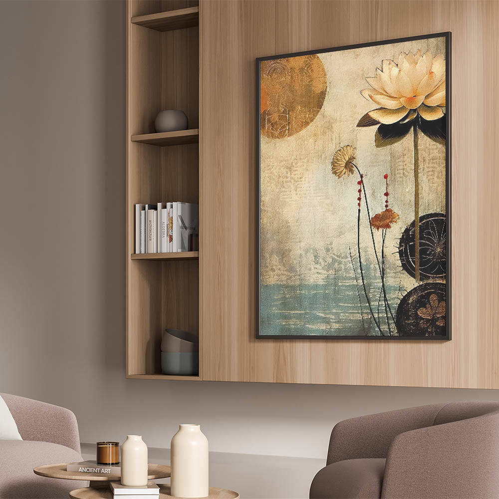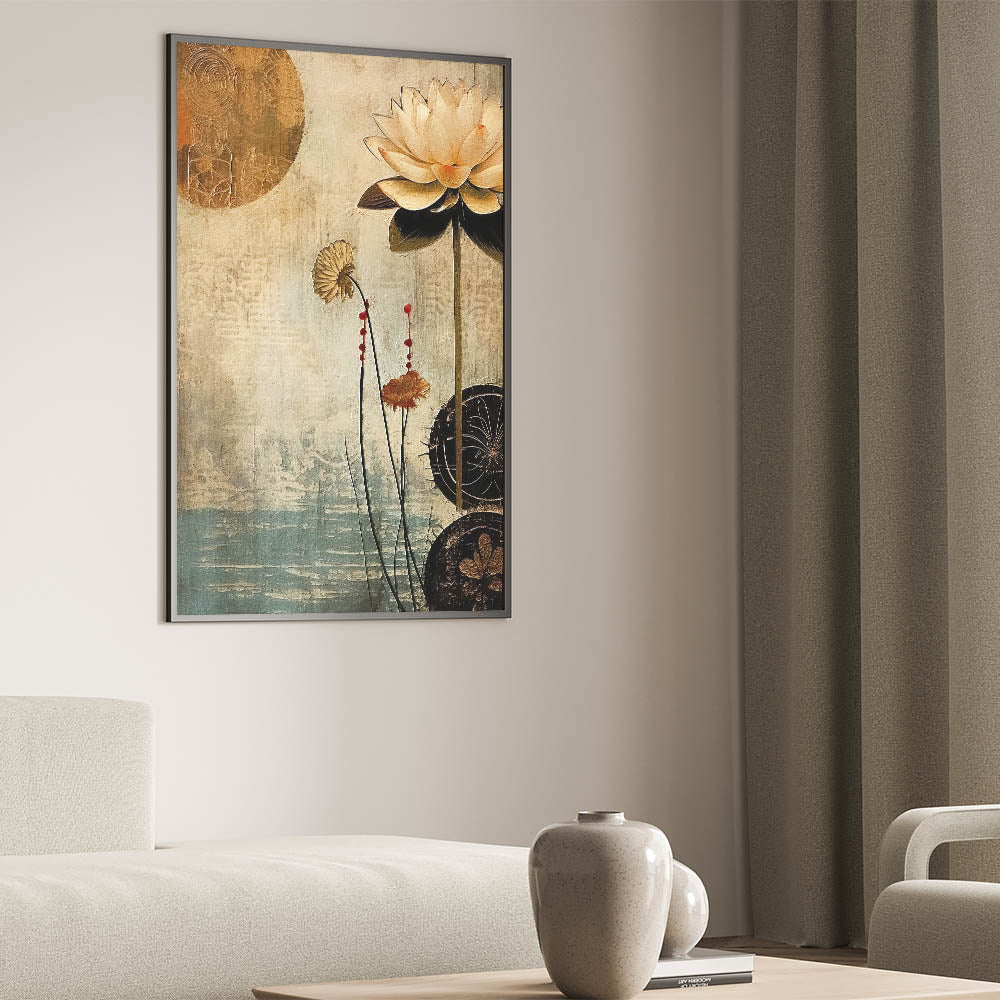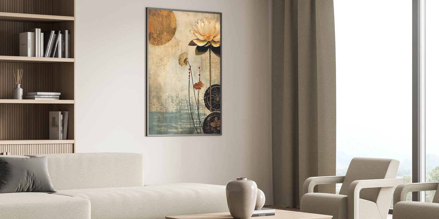 Embrace the elegance of vintage-inspired floral art with this serene lotus design, set against a background of calming beige and blue tones. Part of the Abstract Florals Collection, this piece captures the beauty of nature with a modern twist. The soft color palette and delicate detailing make it a versatile addition to any room, blending artistic expression with natural charm.
