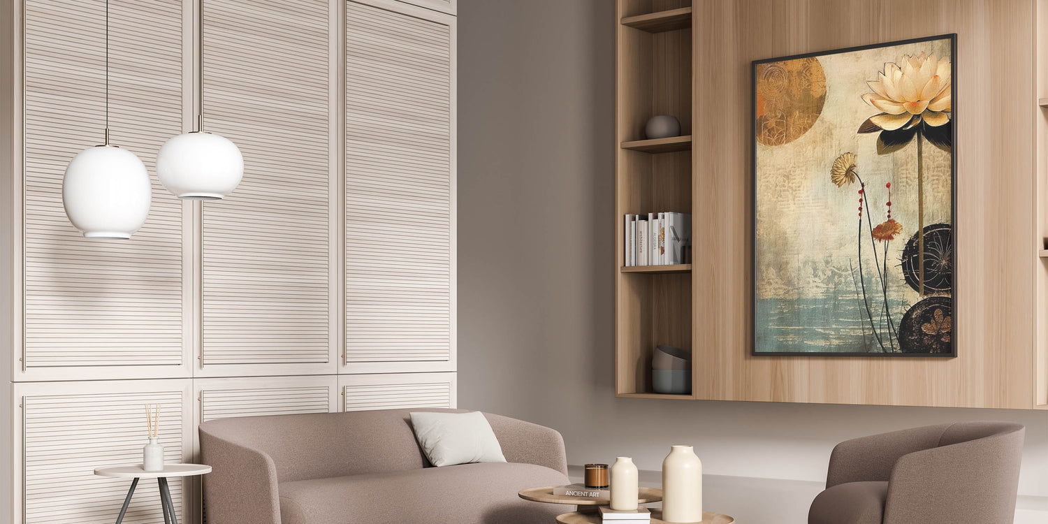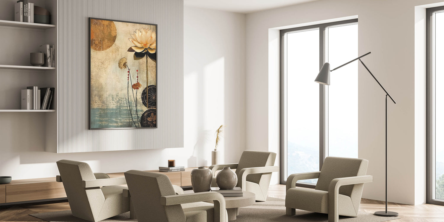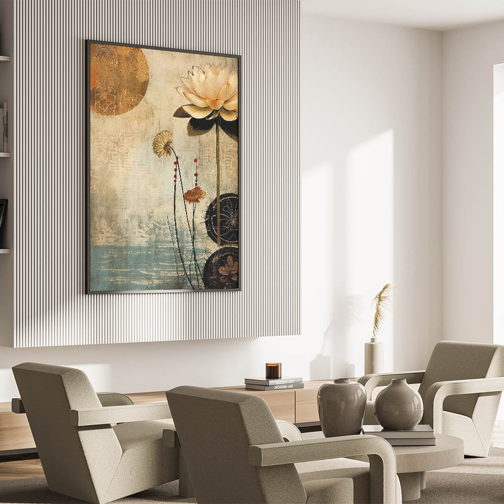 Embrace the elegance of vintage-inspired floral art with this serene lotus design, set against a background of calming beige and blue tones. Part of the Abstract Florals Collection, this piece captures the beauty of nature with a modern twist. The soft color palette and delicate detailing make it a versatile addition to any room, blending artistic expression with natural charm.