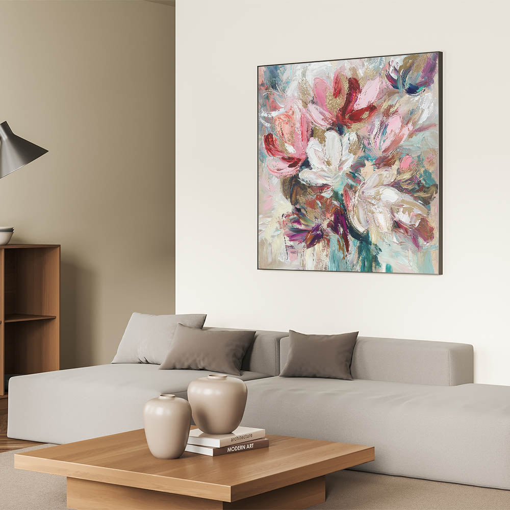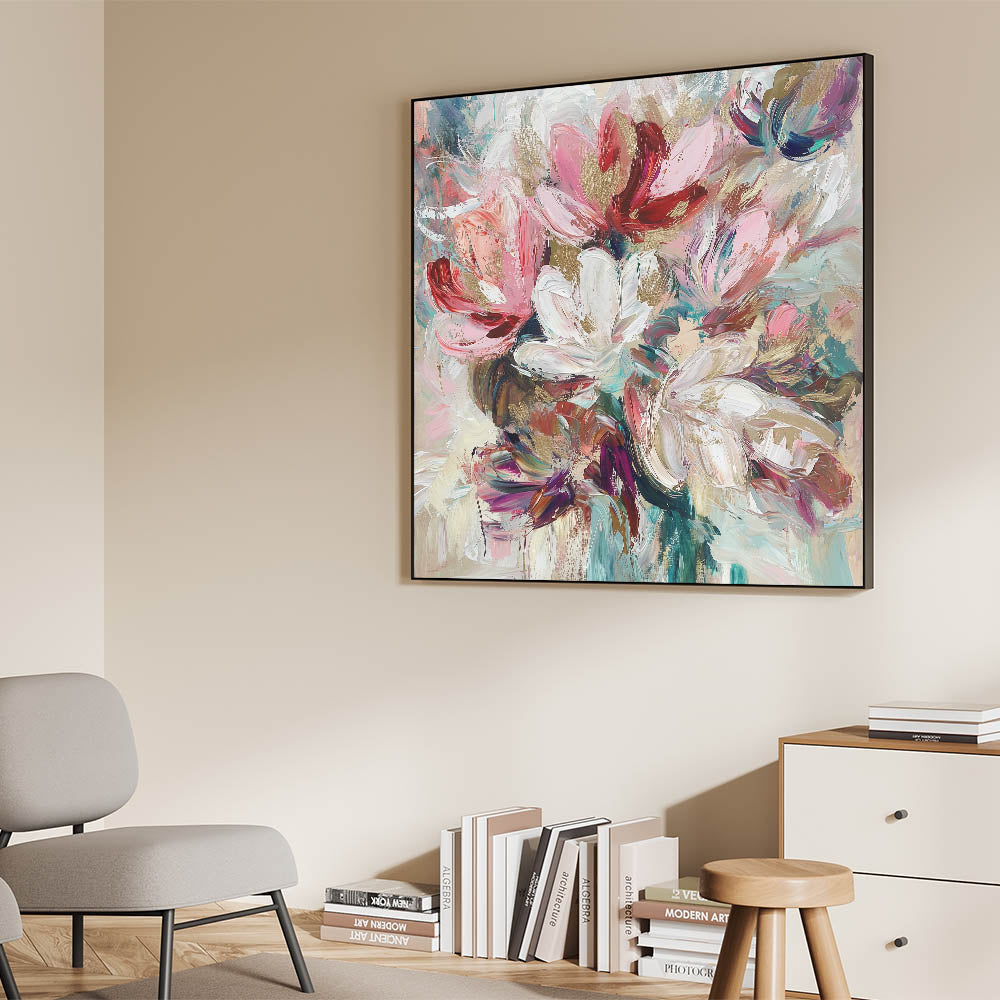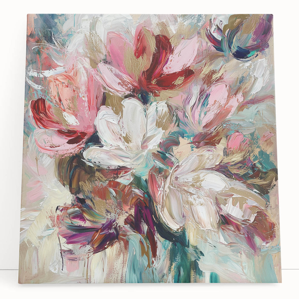 Bring timeless beauty into your space with the Blooming Elegance Abstract Floral Wall Art. This captivating design showcases a bouquet of abstract flowers in delicate shades of pink, white, burgundy, and soft teal. The expressive brushstrokes and harmonious color palette create a sense of movement and charm, making it a perfect addition to modern, classic, or boho-inspired interiors.