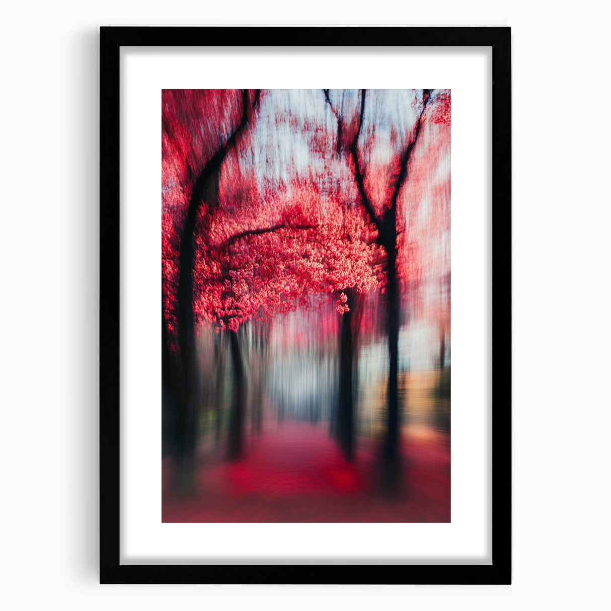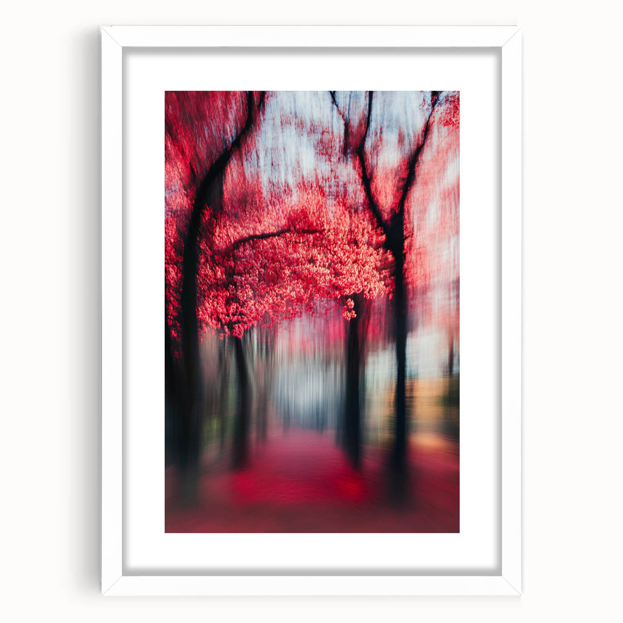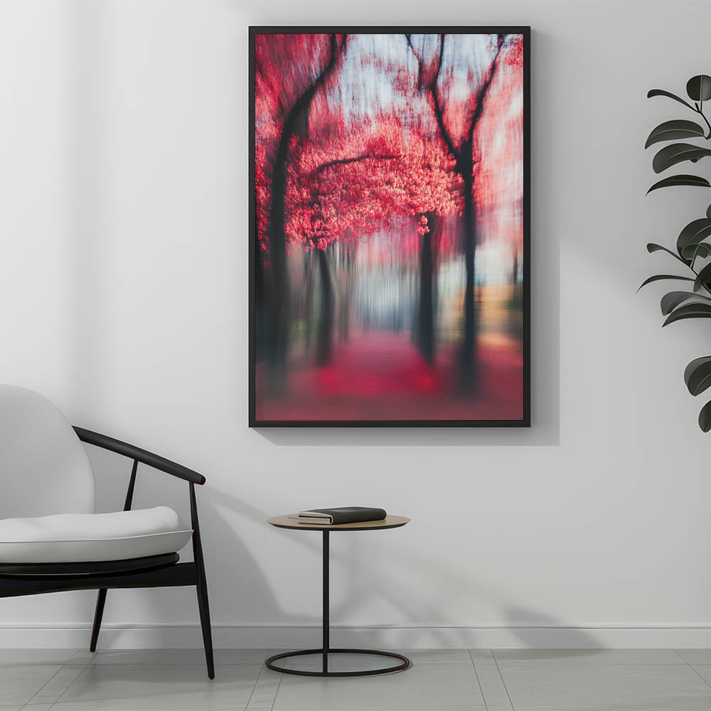 Step into a surreal dreamscape with this mesmerizing fine art photography limited edition print. Featuring a breathtaking forest bathed in vivid red hues, this image captures movement and depth through an artistic motion blur effect.