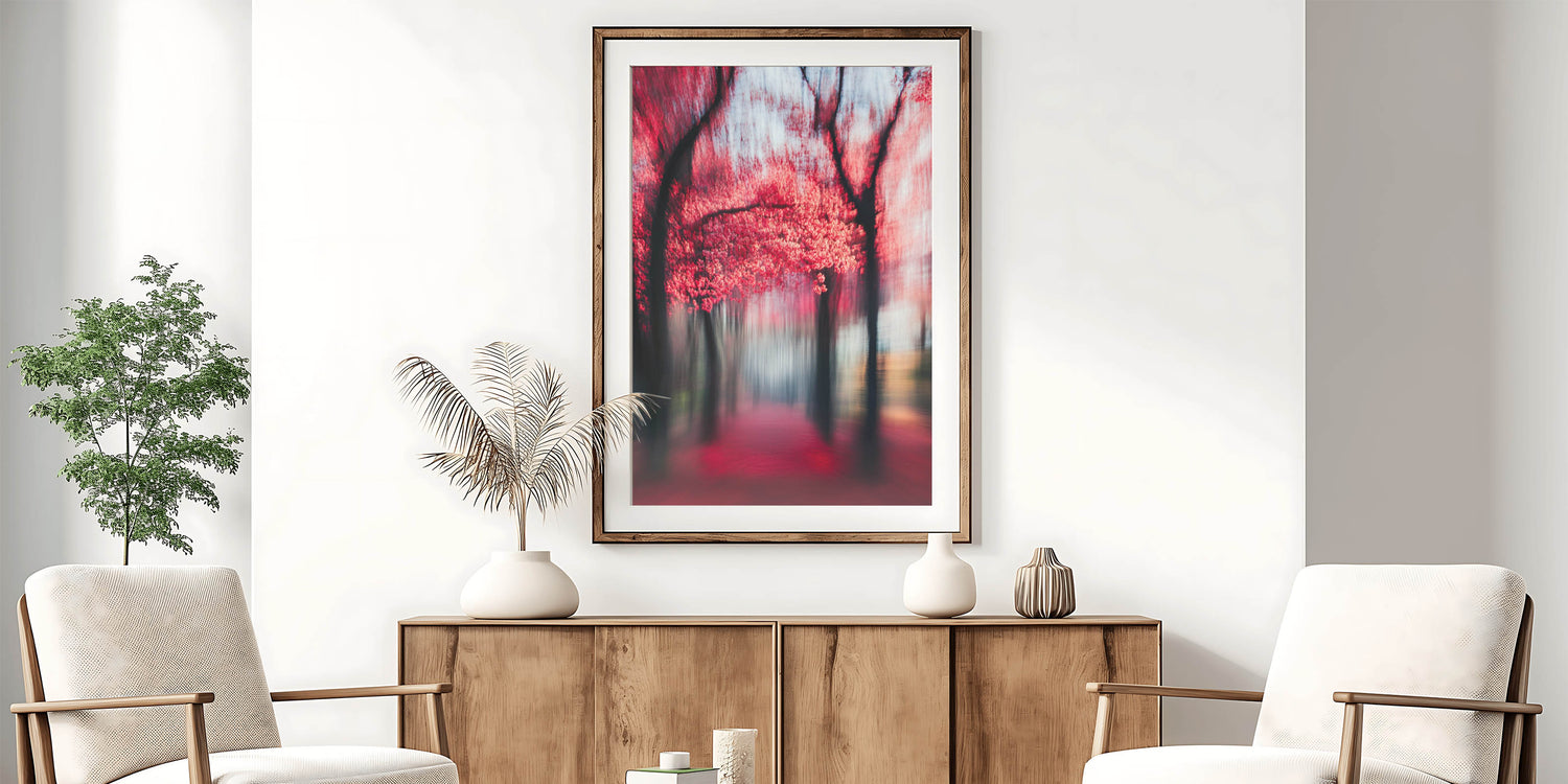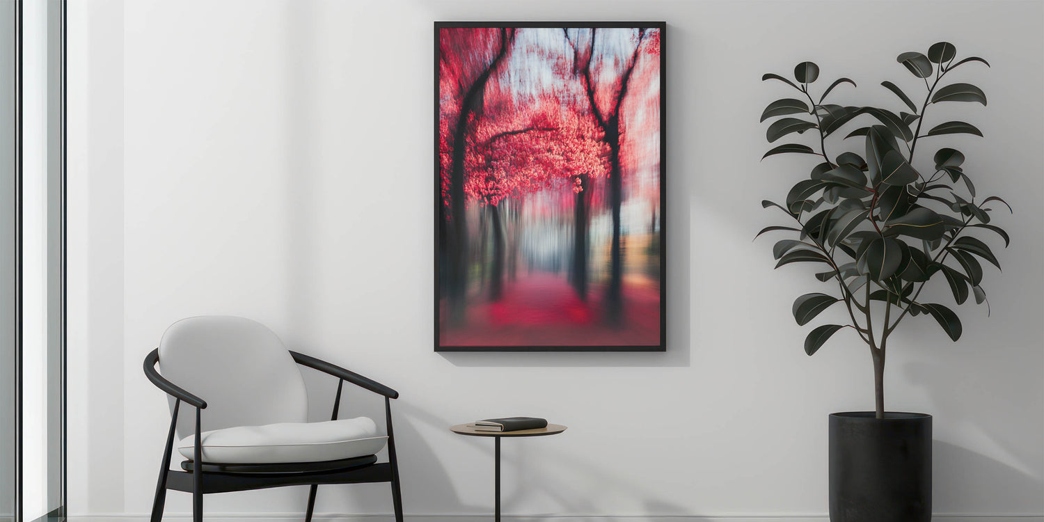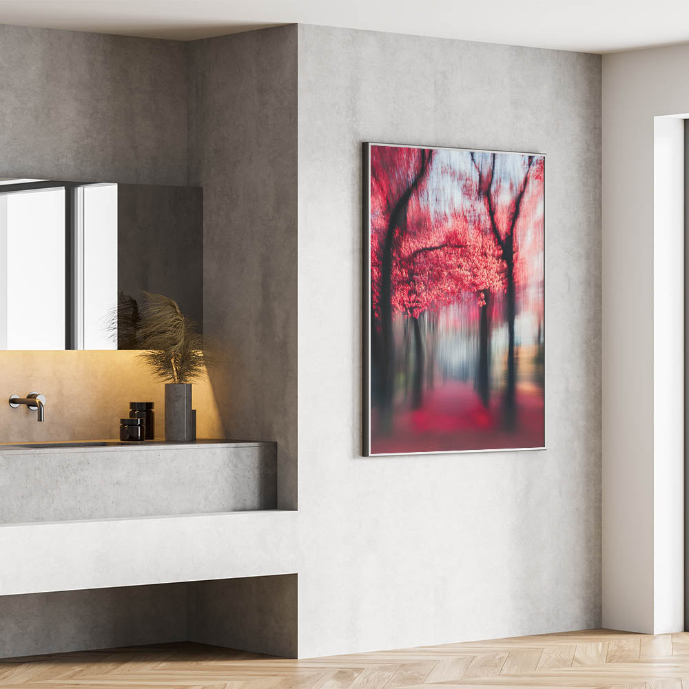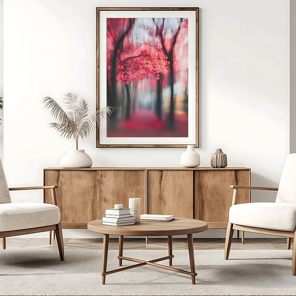 Step into a surreal dreamscape with this mesmerizing fine art photography limited edition print. Featuring a breathtaking forest bathed in vivid red hues, this image captures movement and depth through an artistic motion blur effect.