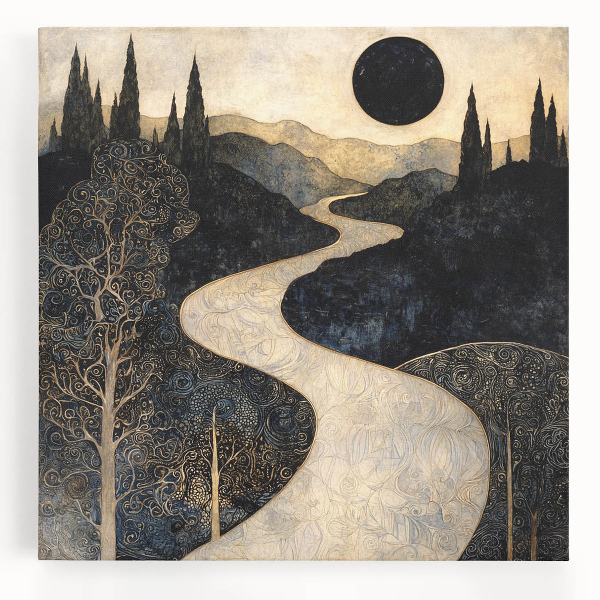 Immerse yourself in the allure of this abstract floral artwork for home decor, featuring an enchanting celestial landscape with intricate golden patterns and deep black tones. This modern flower abstract painting captures the mystery of a winding golden river beneath an eclipsed sun, evoking a dreamlike and elegant atmosphere. A stunning addition to contemporary interiors, this contemporary botanical canvas print blends fine details with bold contrasts for a truly captivating piece.