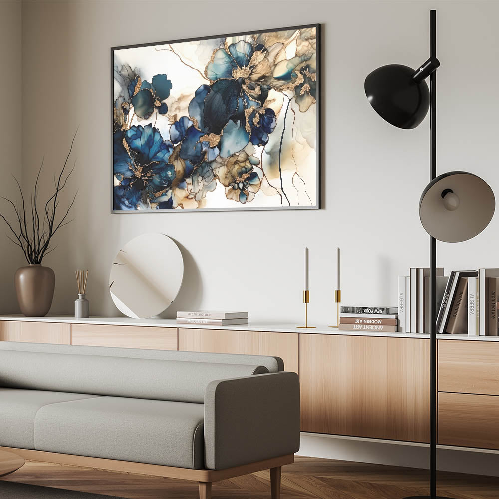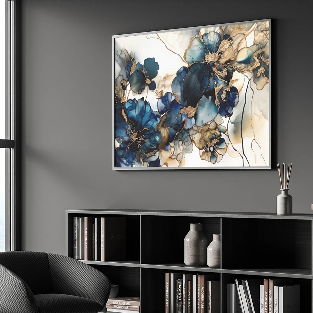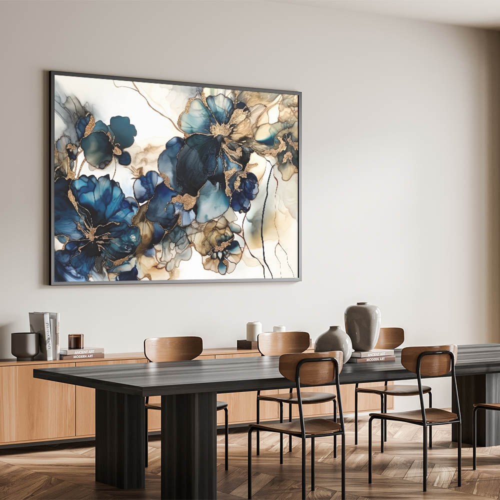 Enhance your space with this Colorful Abstract Floral masterpiece, a captivating addition to any decor. This Artistic Flower Design features bold navy and teal flowers with luxurious gold accents, creating a mesmerizing visual impact. The fluid lines and deep colors make this artwork a standout choice for contemporary spaces that crave elegance and artistic flair.