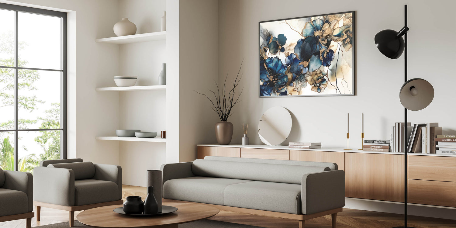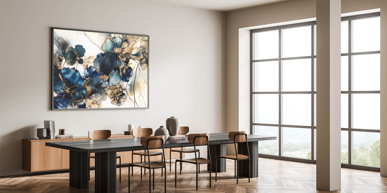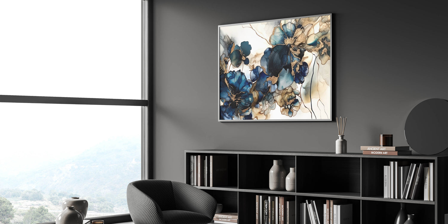 Enhance your space with this Colorful Abstract Floral masterpiece, a captivating addition to any decor. This Artistic Flower Design features bold navy and teal flowers with luxurious gold accents, creating a mesmerizing visual impact. The fluid lines and deep colors make this artwork a standout choice for contemporary spaces that crave elegance and artistic flair.
