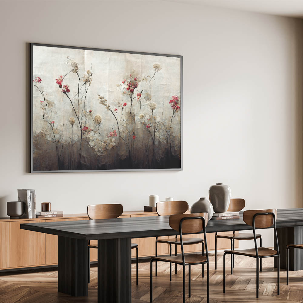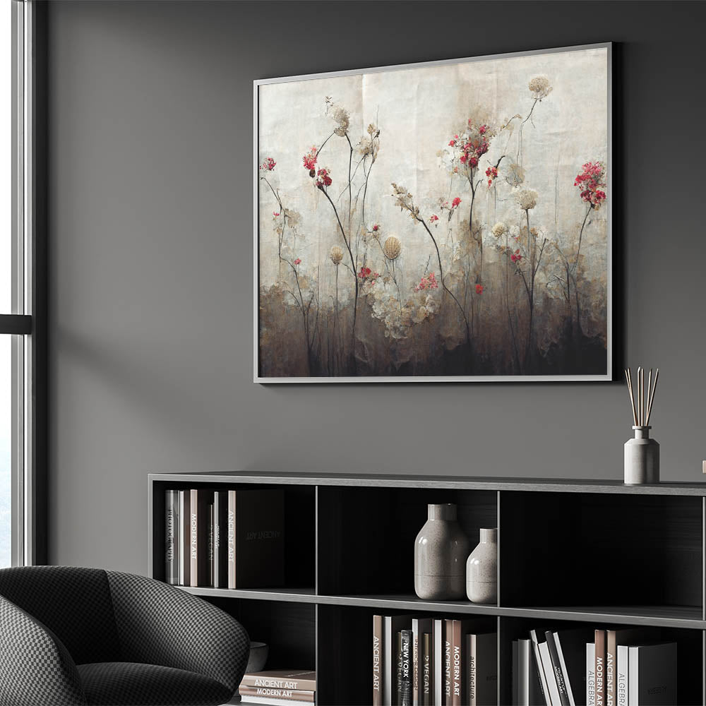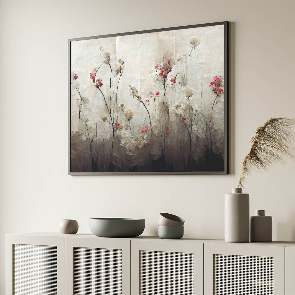 Bring a vibrant touch of nature into your space with this "Colorful Abstract Florals" artwork, showcasing stunning red and cream blossoms rising from an earthy background. The bold red flowers stand out beautifully against the subtle beige tones, creating a captivating contrast that adds warmth and elegance to any room. This floral abstract captures the essence of natural beauty and contemporary art, making it a striking piece for your living room, bedroom, or office.