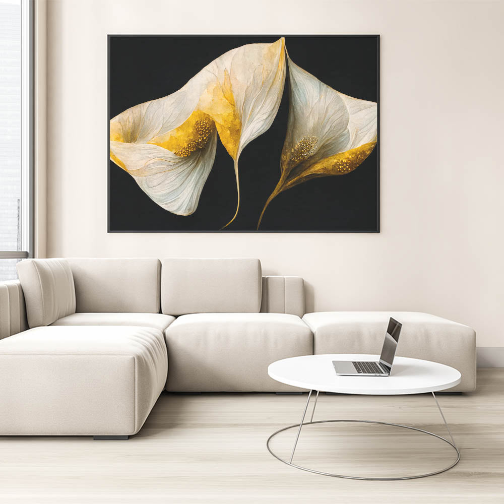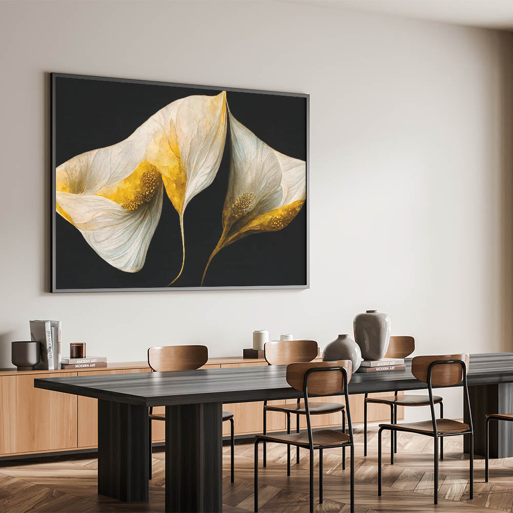 Brighten your space with this stunning colorful abstract floral canvas art featuring elegant yellow and white calla lilies. The vivid contrast between the vibrant yellow hues and the soft white petals creates a striking composition against the dark background, making it an eye-catching piece for any room. This artwork combines contemporary style with botanical beauty, adding warmth and sophistication to any decor.