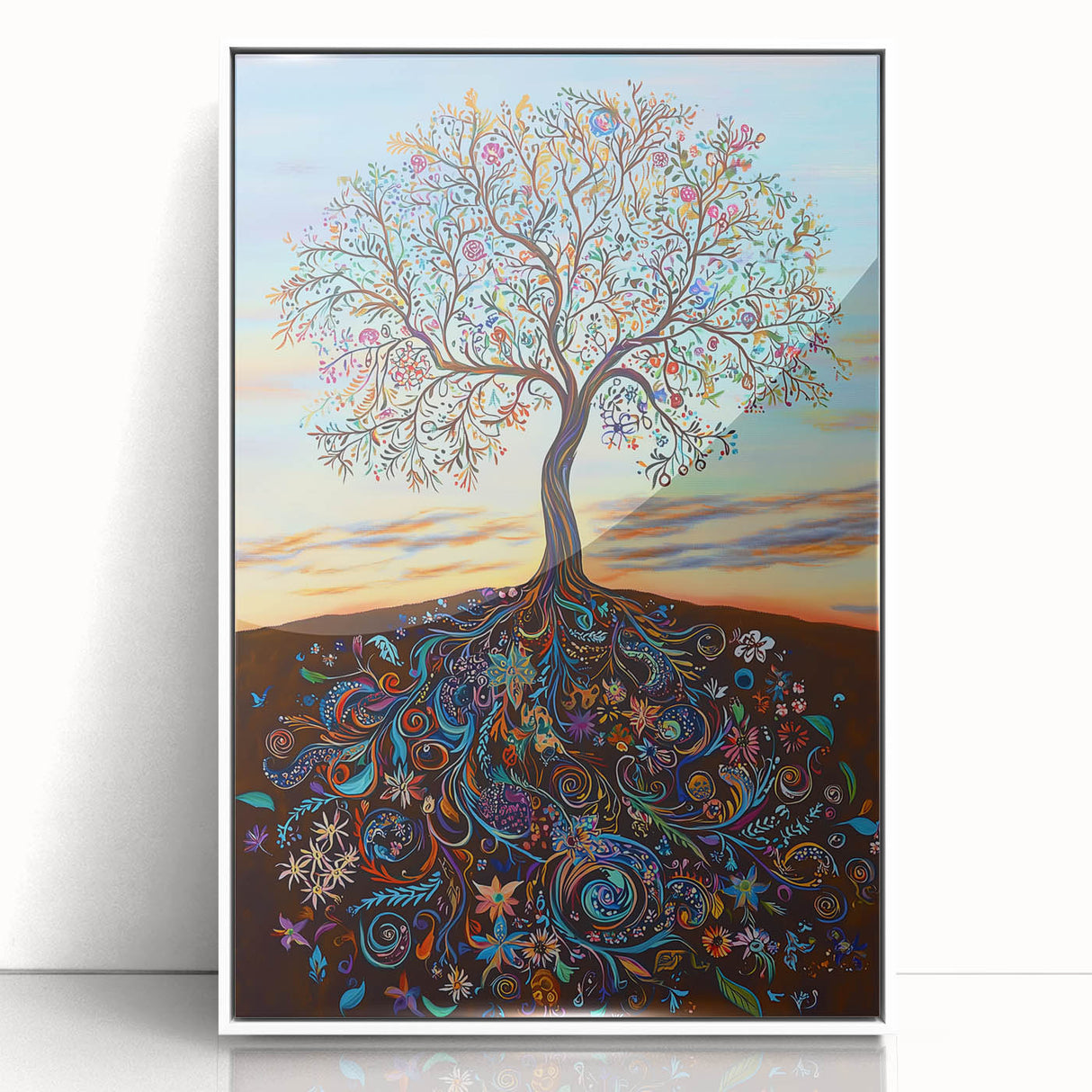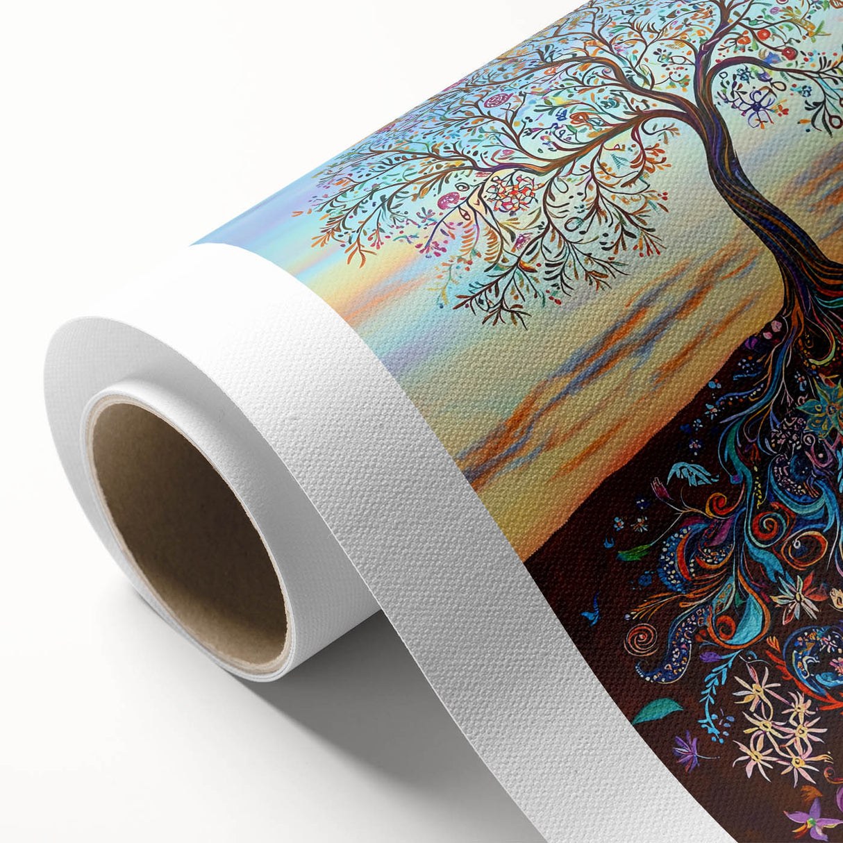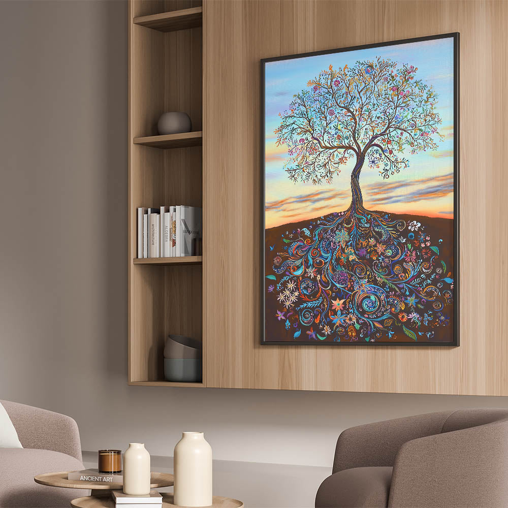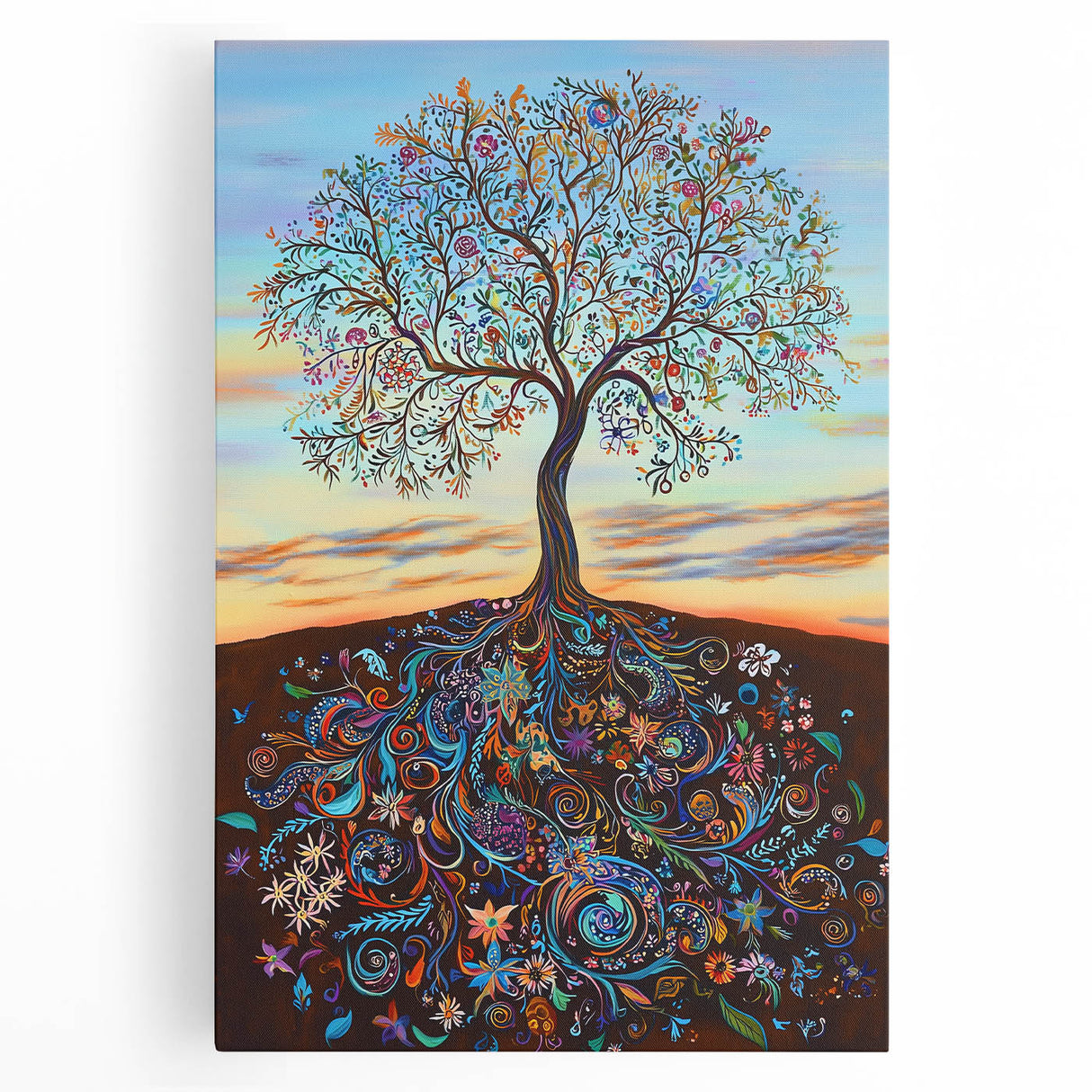 Celebrate the beauty of life and nature with this vibrant abstract tree artwork. This stunning piece features an intricately detailed tree with swirling, colorful roots that connect the soil to the sky, symbolizing growth and harmony. The branches burst with lively colors, from soft blues and greens to radiant oranges and purples, creating an energetic and captivating display.