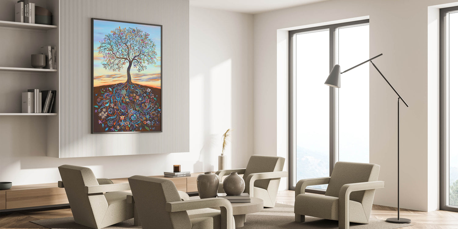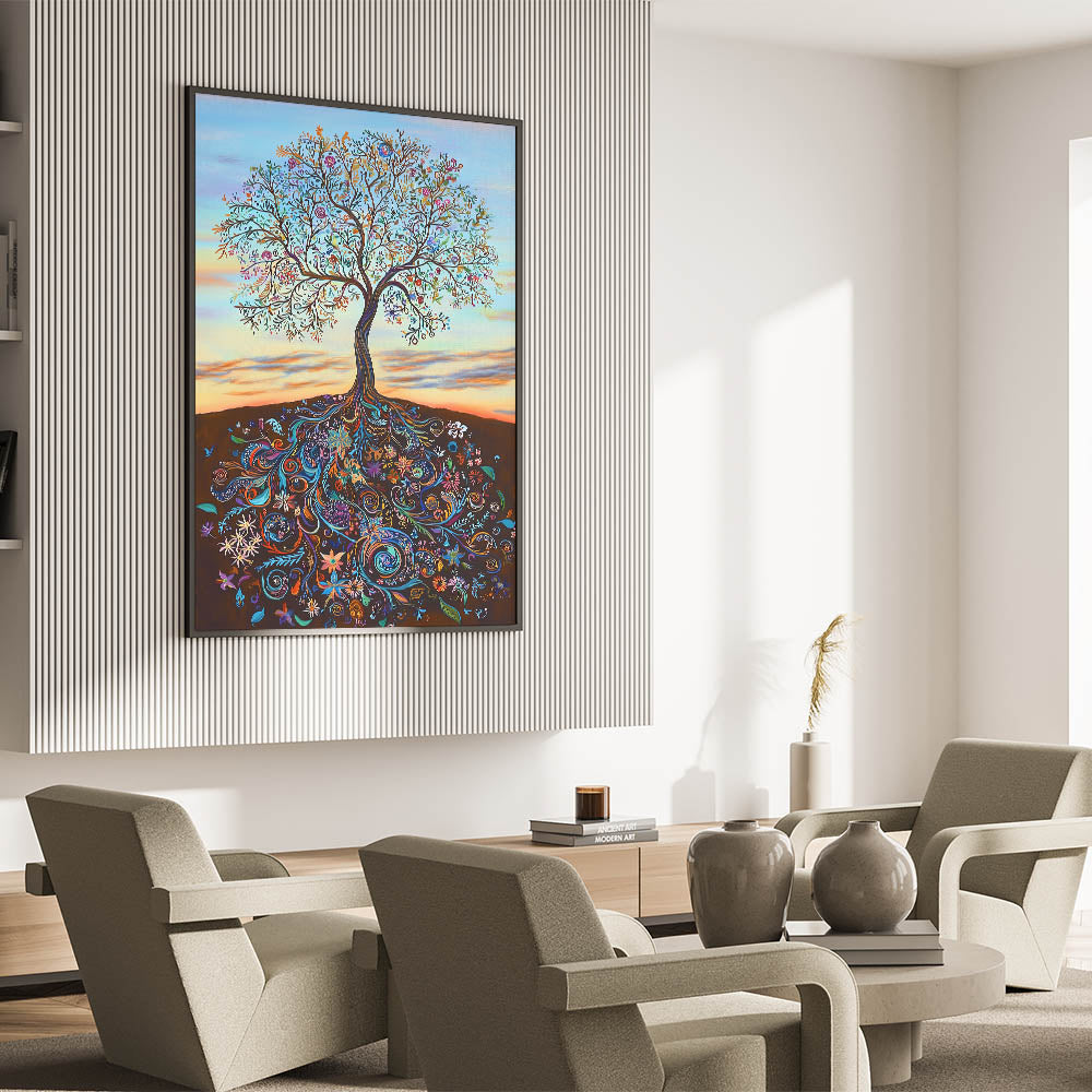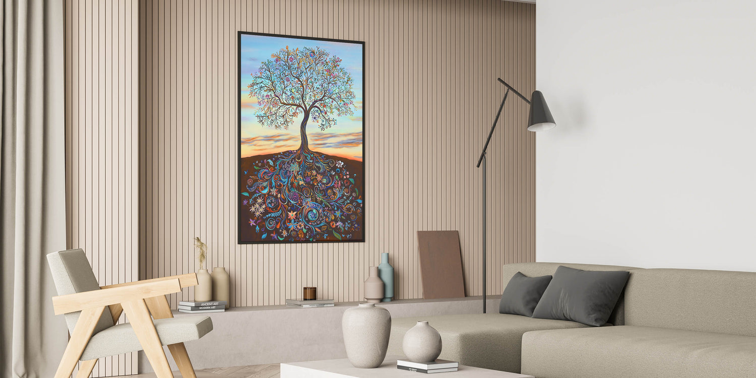 The warm gradient background, evoking a serene sunset, enhances the tree's vibrant details, making it an eye-catching centerpiece for any room. Perfect for those who love bold and meaningful art, this piece complements modern, bohemian, and eclectic interiors alike.