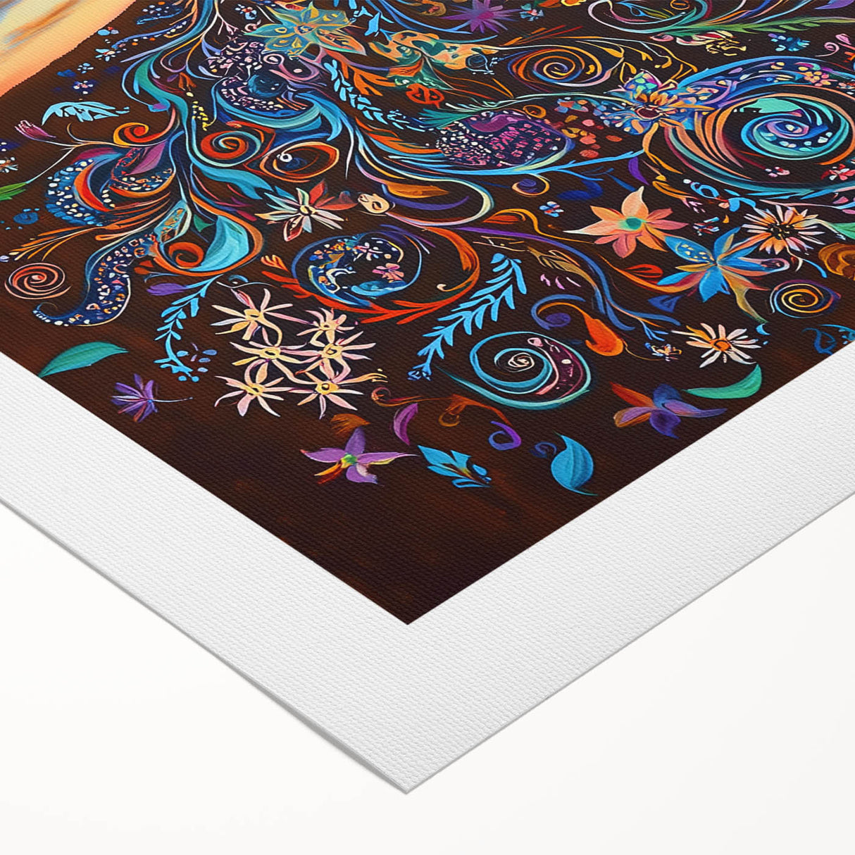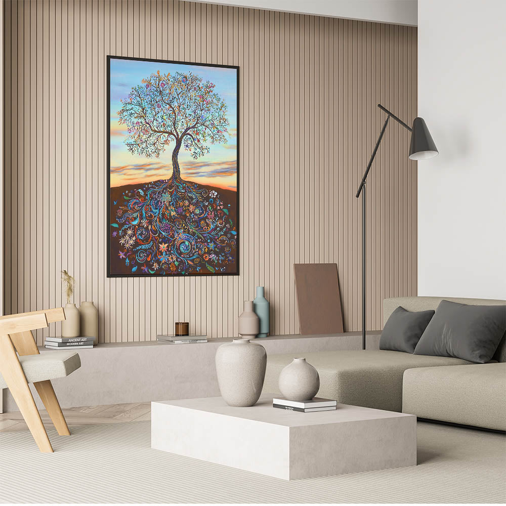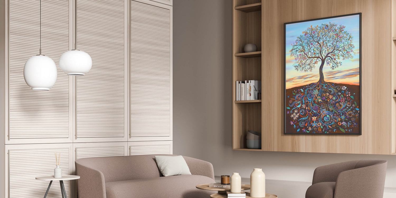 The warm gradient background, evoking a serene sunset, enhances the tree's vibrant details, making it an eye-catching centerpiece for any room. Perfect for those who love bold and meaningful art, this piece complements modern, bohemian, and eclectic interiors alike.
