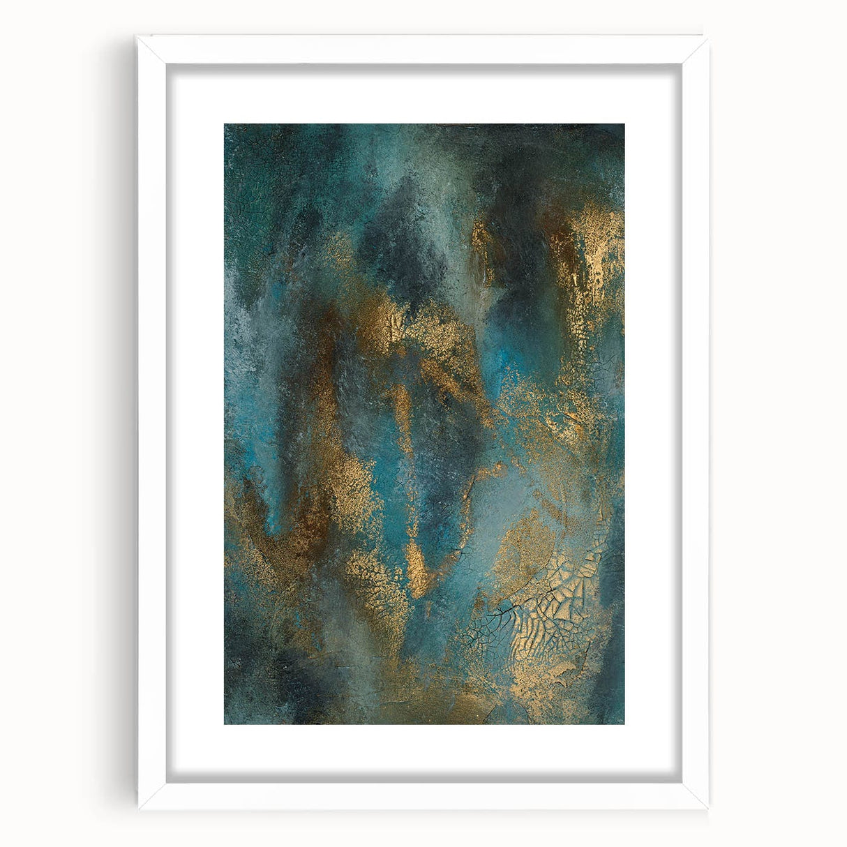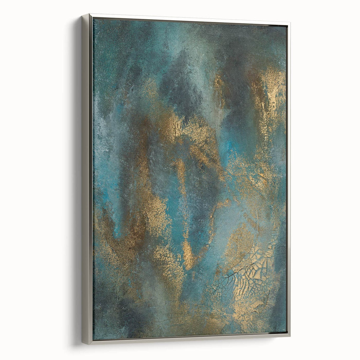Elevate your space with this contemporary abstract art, a stunning blend of deep teal, rich gold, and textured brushwork. This moody modern wall art exudes sophistication with its fluid movement and metallic highlights, creating an elegant yet dramatic visual effect. The dynamic layering of colors adds depth, making this abstract wall art a captivating focal point in any modern interior.
