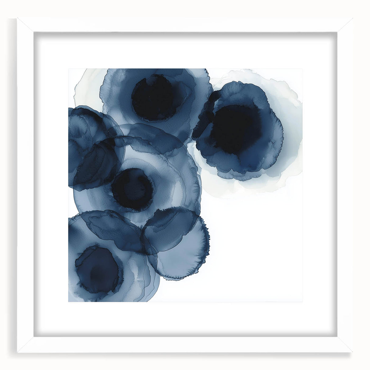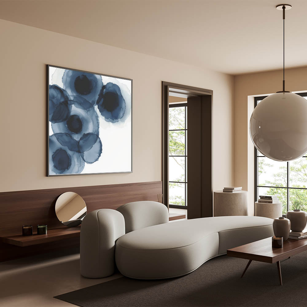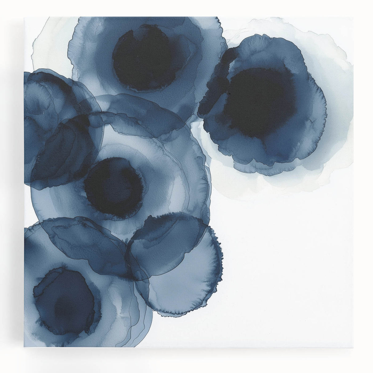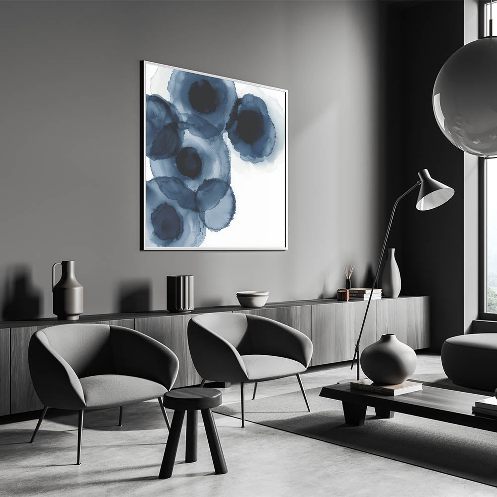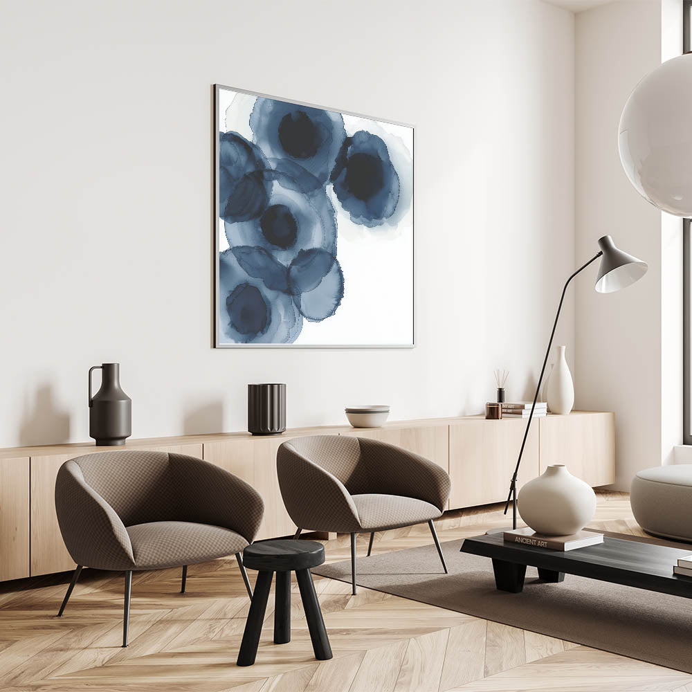 Transform your space with this contemporary abstract canvas showcasing deep navy and layered ink-style shapes. The translucent, circular forms float across a clean white background, offering a sense of calm movement and modern sophistication. A perfect fit for lovers of modern design and serene minimalist spaces.