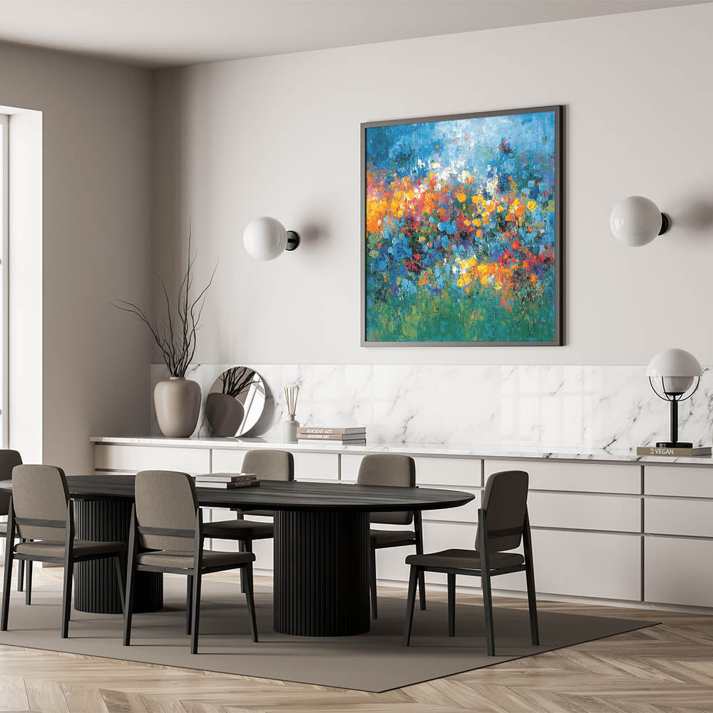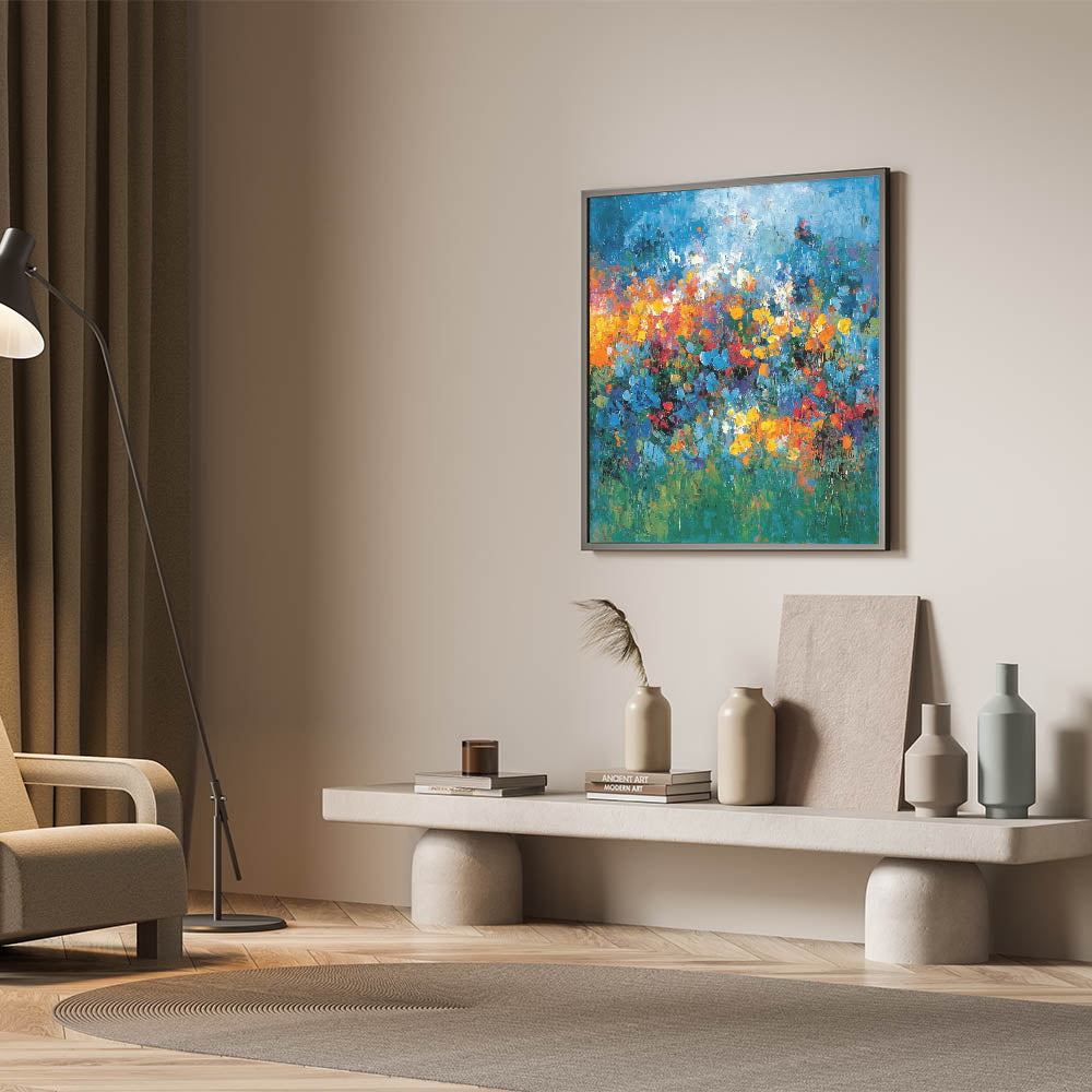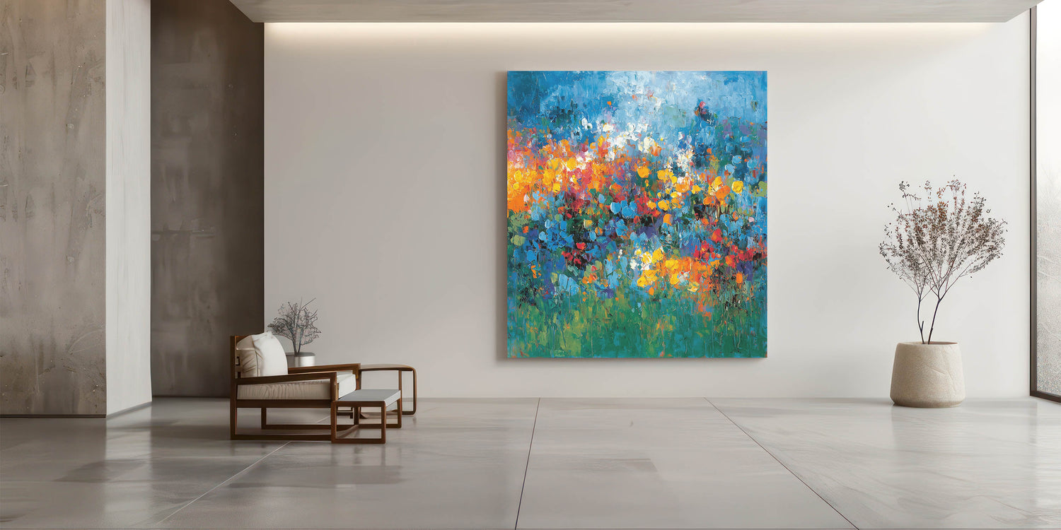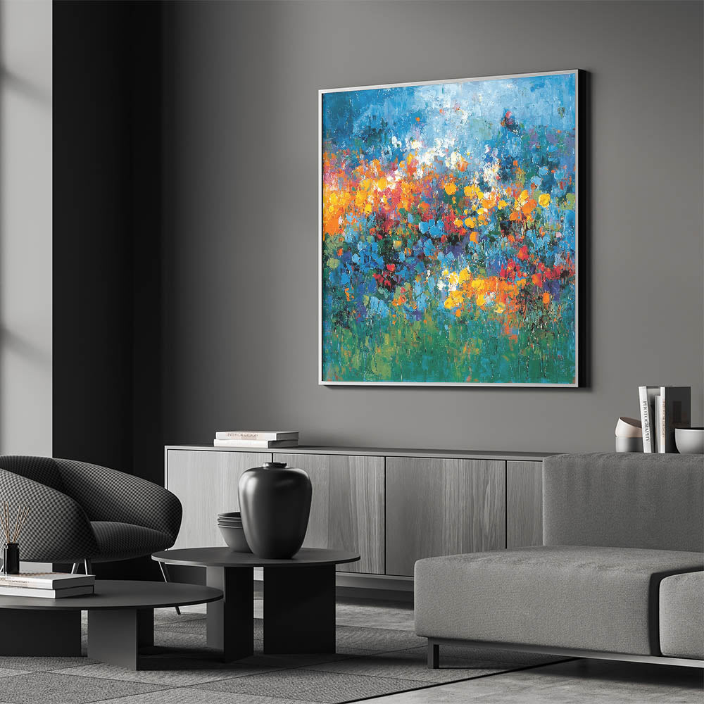 Brighten your walls with this joyful and colorful contemporary abstract canvas. Inspired by fields of wildflowers in full bloom, this piece bursts with life through layers of vibrant blue, orange, green, and yellow. The expressive brushwork and layered texture capture the spirit of nature with a modern artistic edge. Perfect for interiors that crave color and personality.
