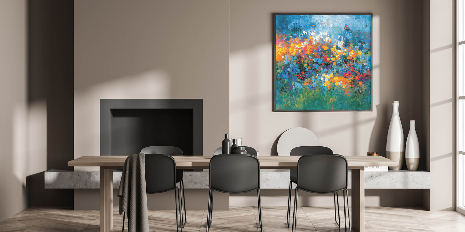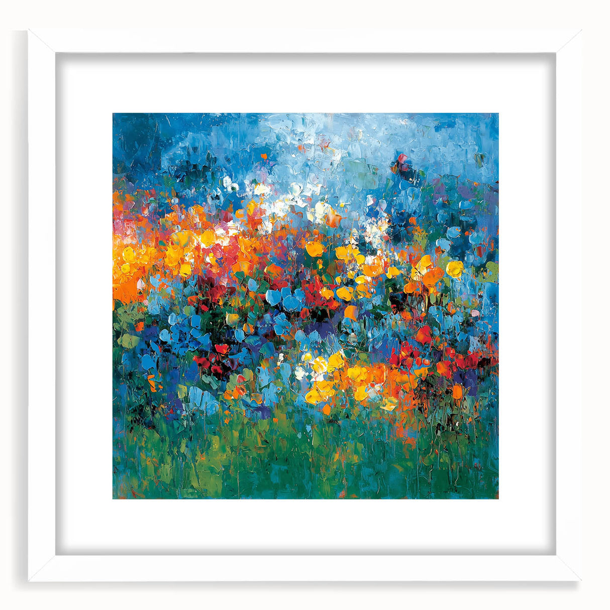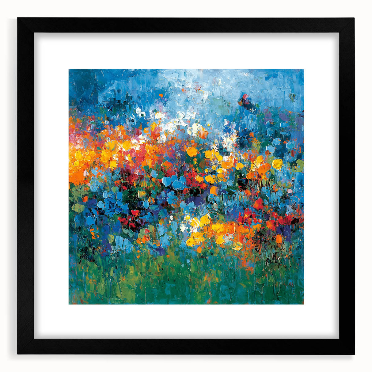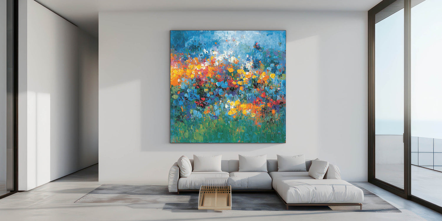 Brighten your walls with this joyful and colorful contemporary abstract canvas. Inspired by fields of wildflowers in full bloom, this piece bursts with life through layers of vibrant blue, orange, green, and yellow. The expressive brushwork and layered texture capture the spirit of nature with a modern artistic edge. Perfect for interiors that crave color and personality.