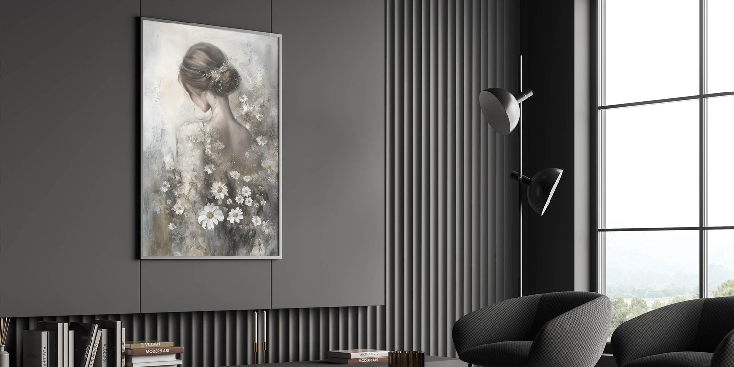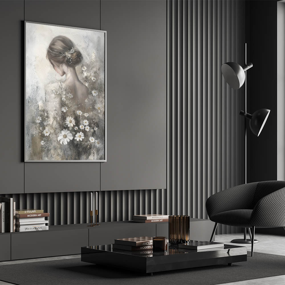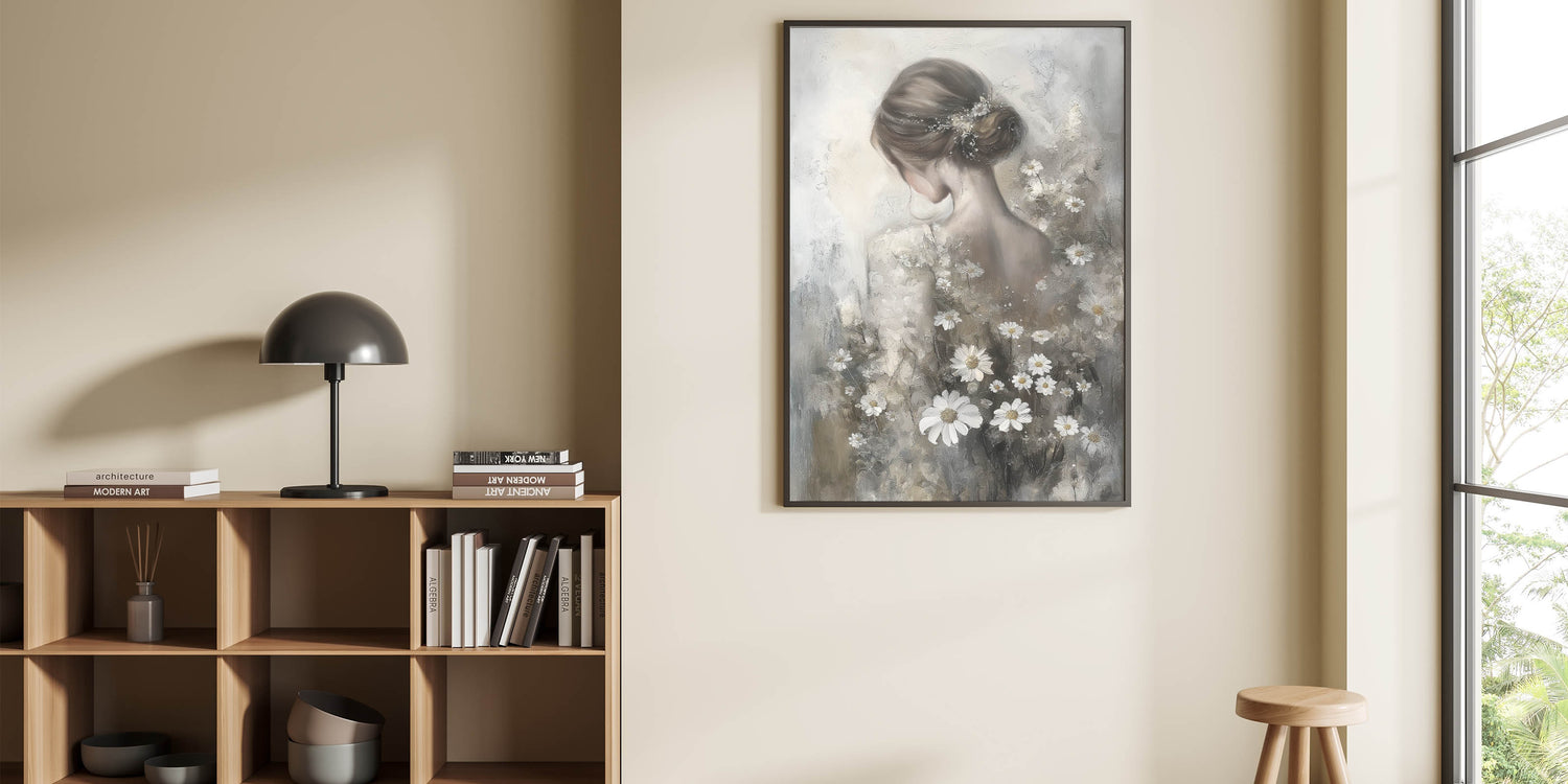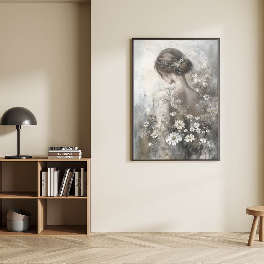 Infuse your space with elegance and tranquility through this Contemporary Figurative Canvas Art, featuring a serene depiction of a woman surrounded by delicate daisies. The soft neutral palette of beige, cream, and white exudes timeless sophistication, making it a perfect addition to any minimalist or classic interior.