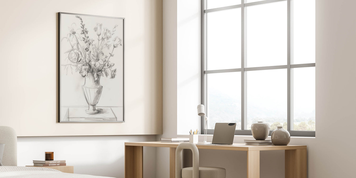 Enhance your space with this exquisite Contemporary Flower Print, an elegant depiction of floral artistry. Featuring a delicate arrangement of blooming flowers in a minimalist vase, this artwork captures the essence of modern abstract florals. Its subtle lines and timeless appeal make it a versatile addition to any room.