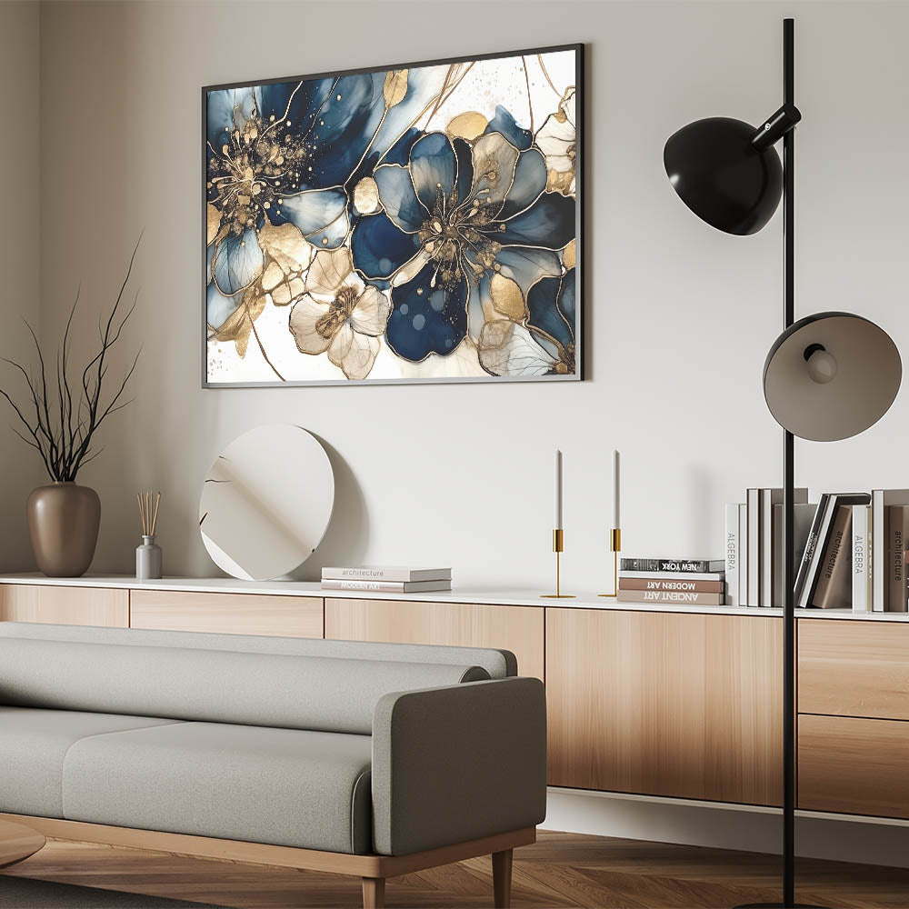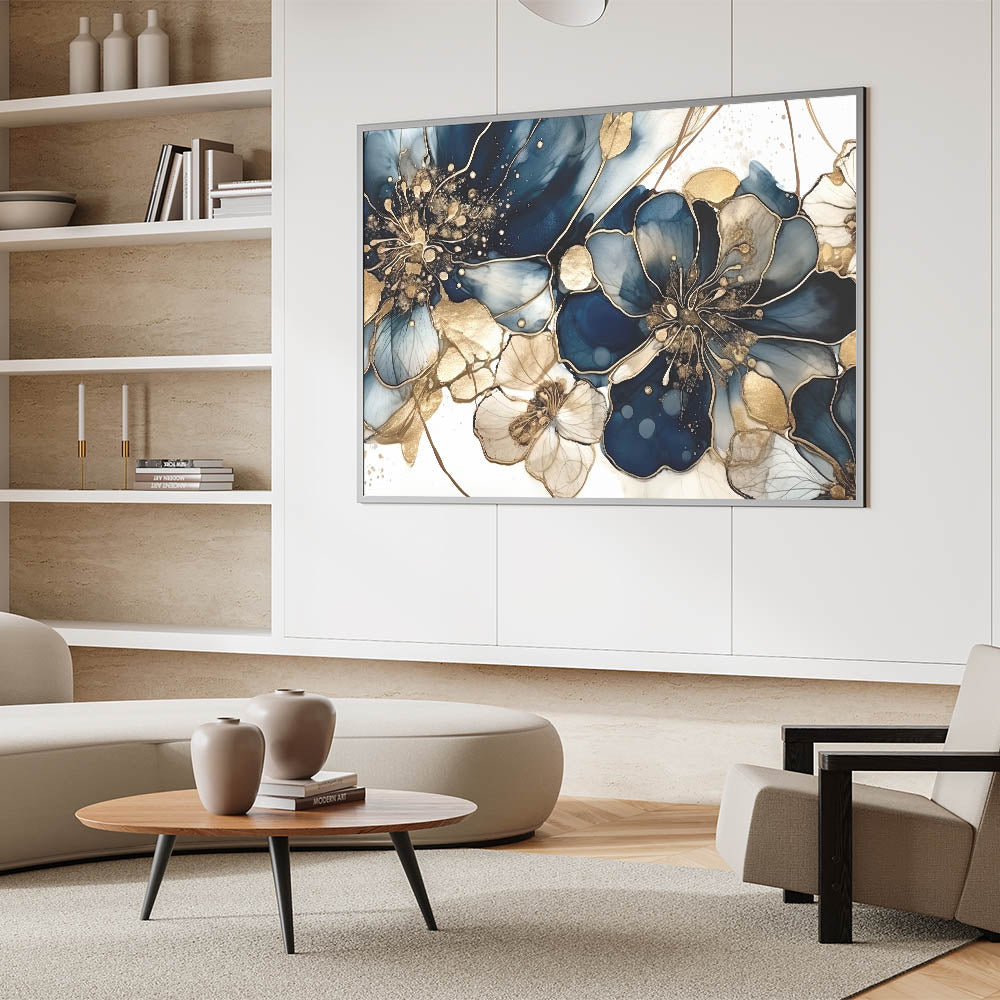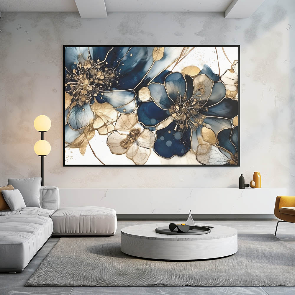 Transform your space with this luxurious floral abstract canvas featuring deep navy blue and gold hues. This modern artwork combines intricate floral patterns with a shimmering, sophisticated palette, creating a breathtaking blend of elegance and style. Each bloom is designed to captivate, with delicate details that make this piece an eye-catching focal point for any room.