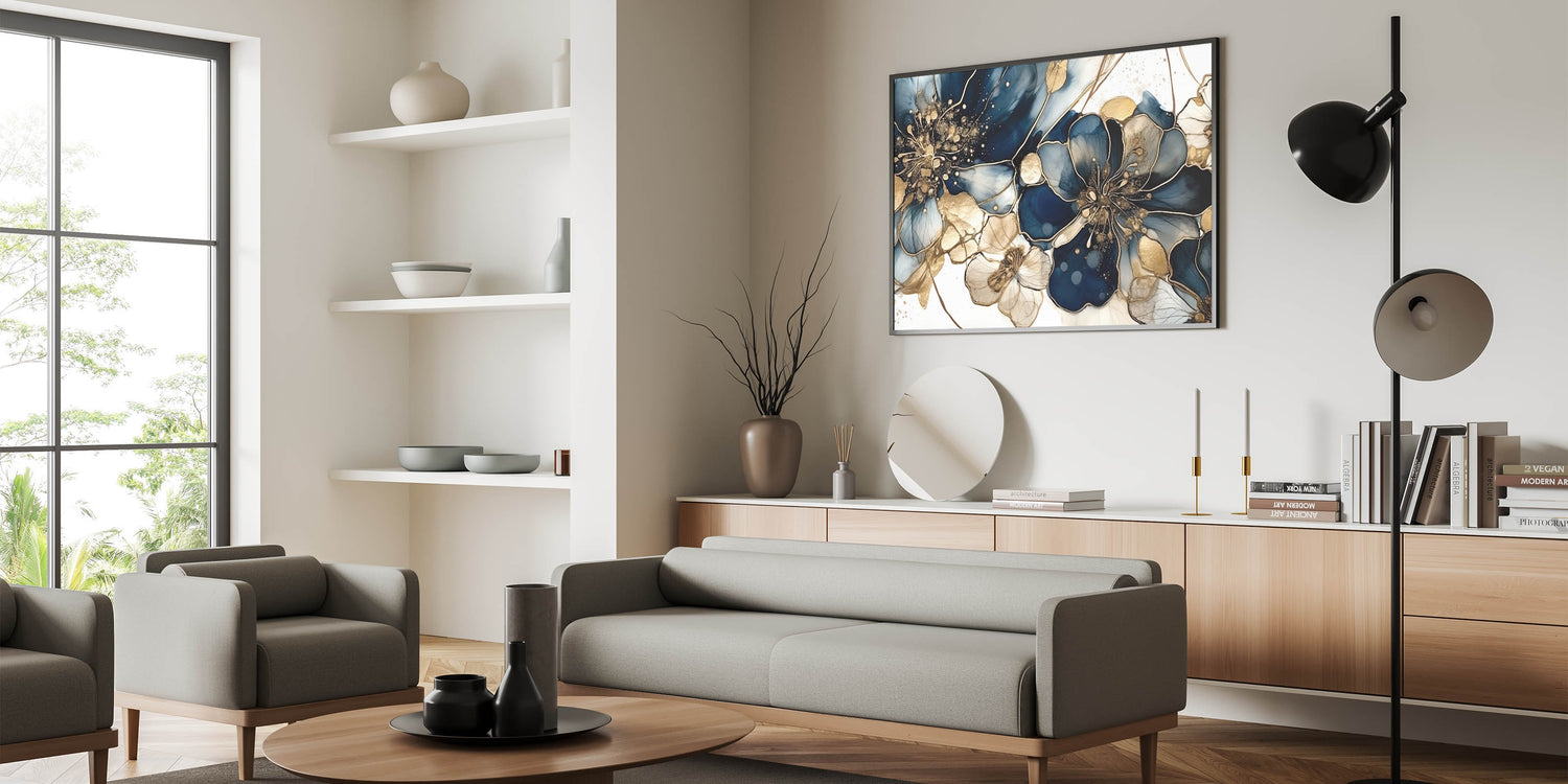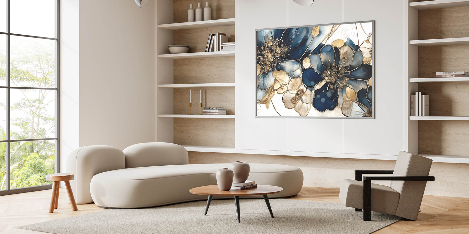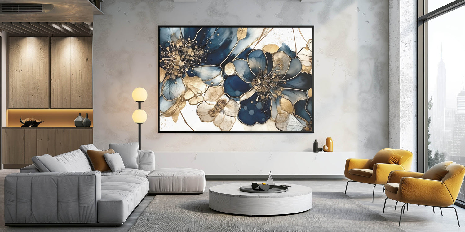 Transform your space with this luxurious floral abstract canvas featuring deep navy blue and gold hues. This modern artwork combines intricate floral patterns with a shimmering, sophisticated palette, creating a breathtaking blend of elegance and style. Each bloom is designed to captivate, with delicate details that make this piece an eye-catching focal point for any room.