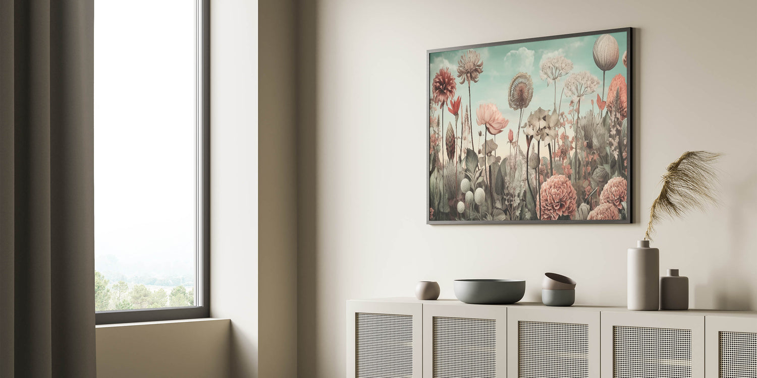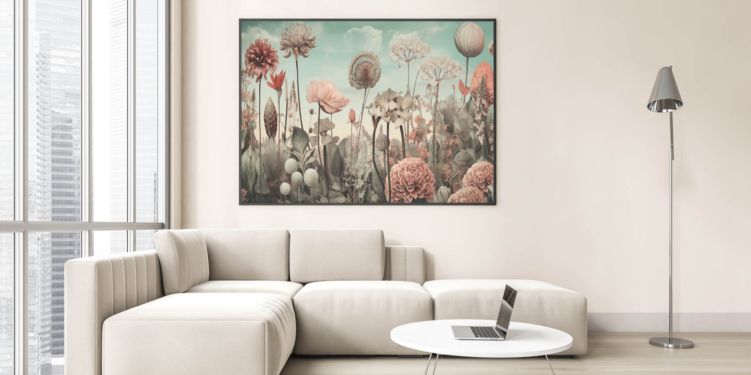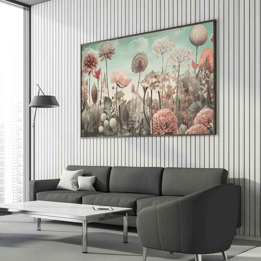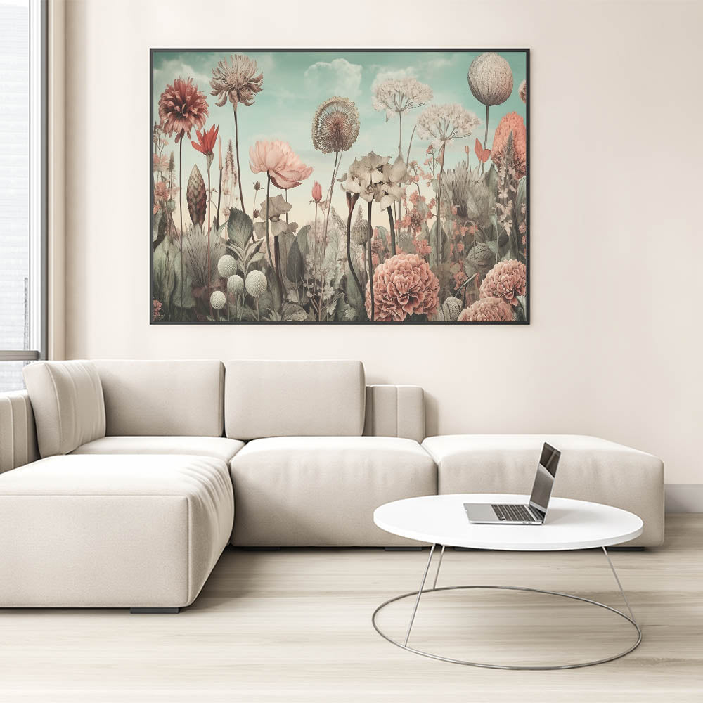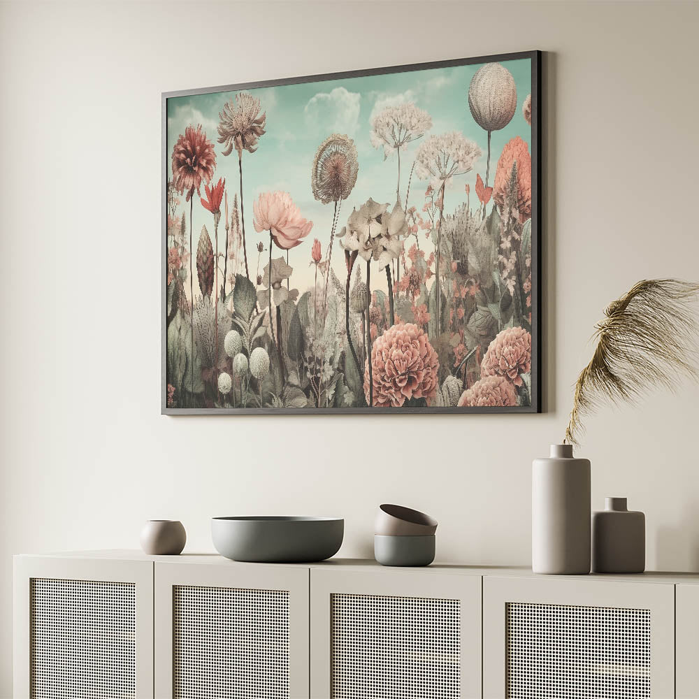 This enchanting contemporary flower print captures a garden filled with pastel-hued wildflowers against a soft sky. Featuring intricate blooms in shades of blush, coral, and green, this artwork brings the beauty of nature indoors. The subtle details and gentle color palette make it ideal for adding a serene, timeless charm to both modern and classic interiors.