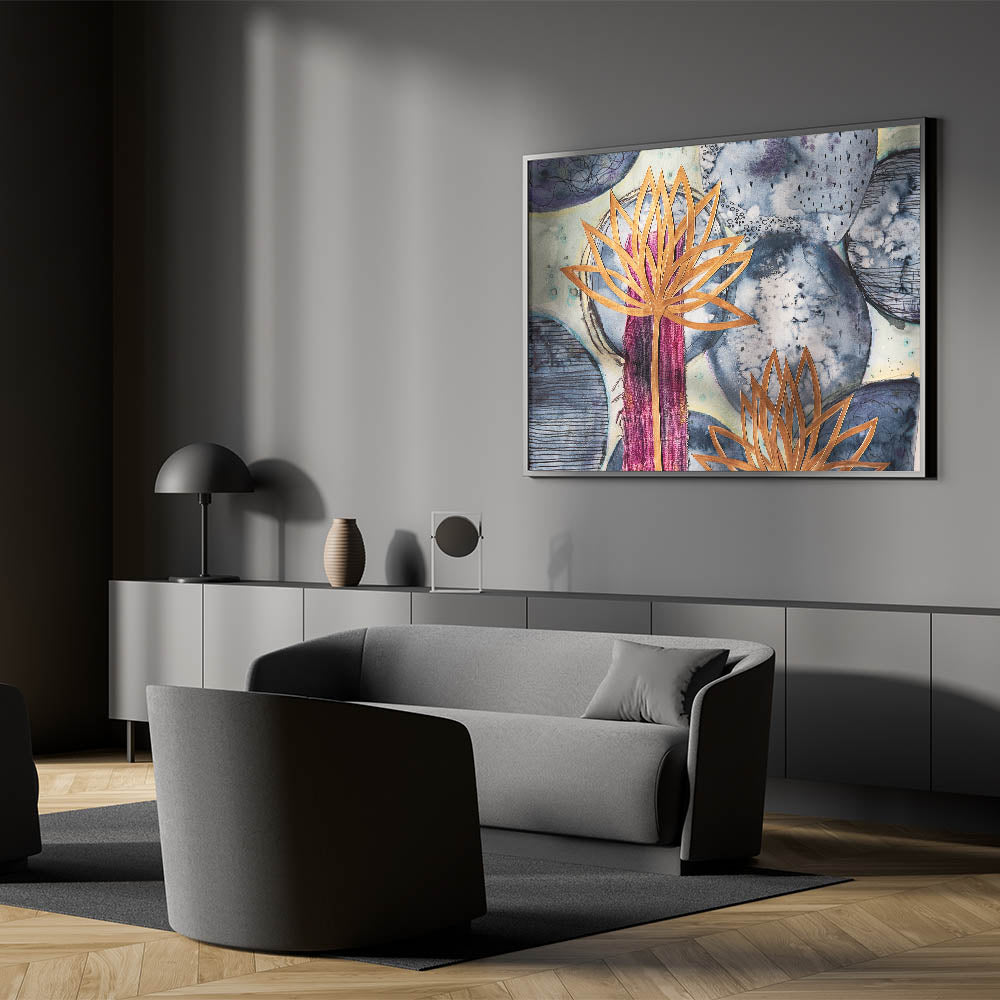 High-quality abstract art prints with gold floral overlays and bold color blends