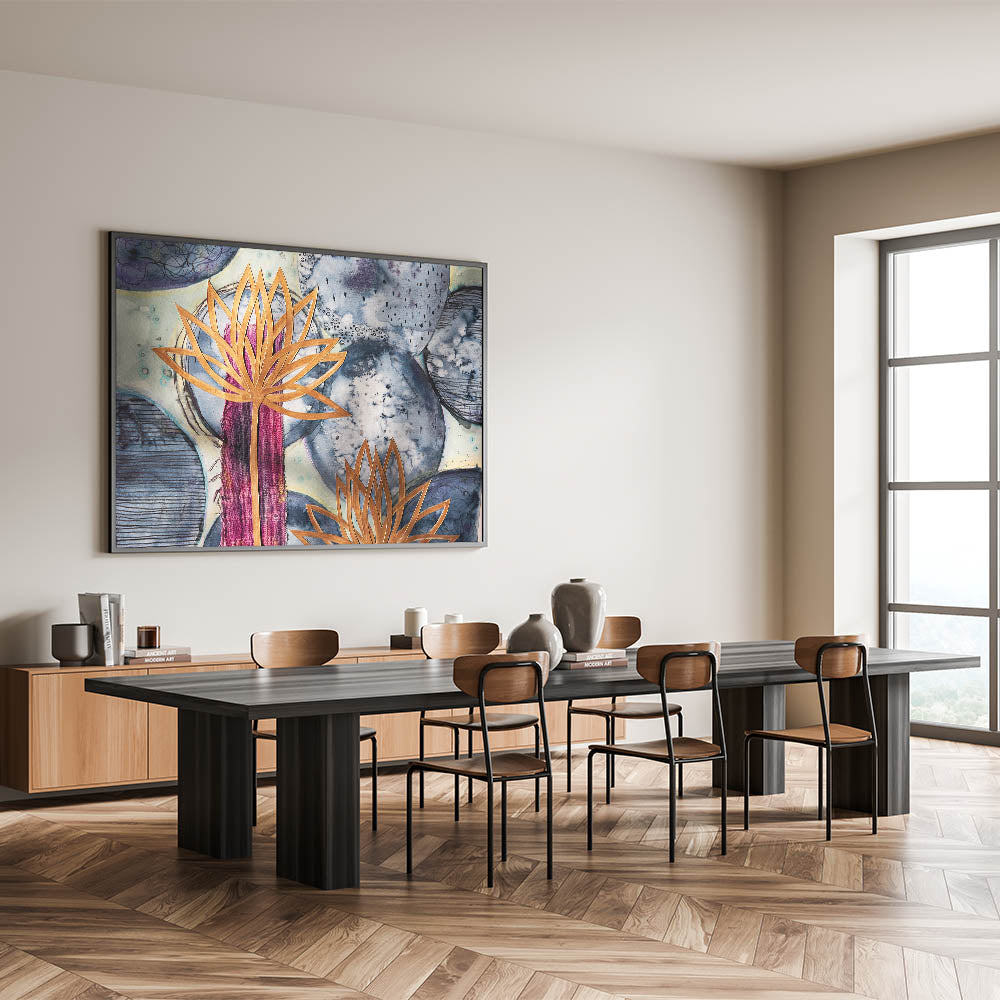 Bring an artistic fusion of texture and symbolism into your space with this Contemporary Framed Abstract Art. Featuring golden lotus outlines layered over deep blue, violet, and magenta mixed-media textures, this piece radiates modern elegance with cultural depth. It’s an ideal choice for eclectic, bohemian, or spiritually inspired interiors.