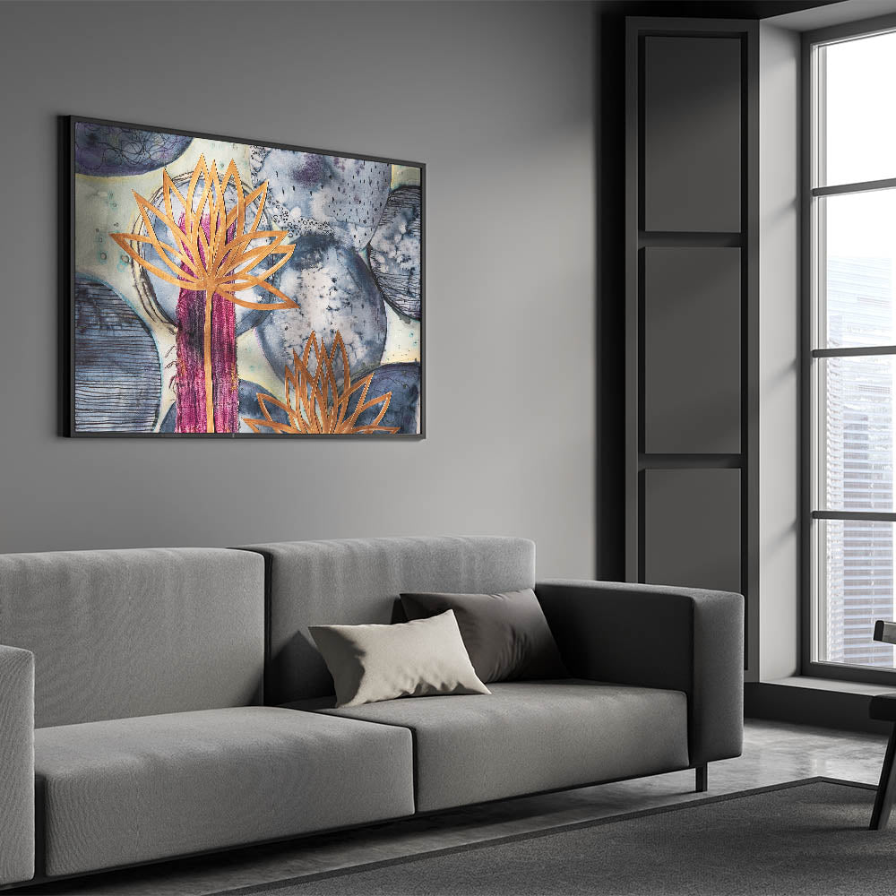 Contemporary Framed Abstract Art – Gold Lotus Over Blue Textures