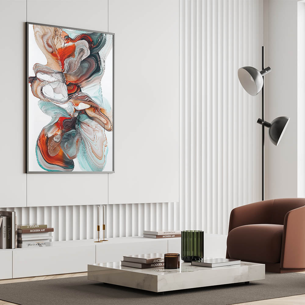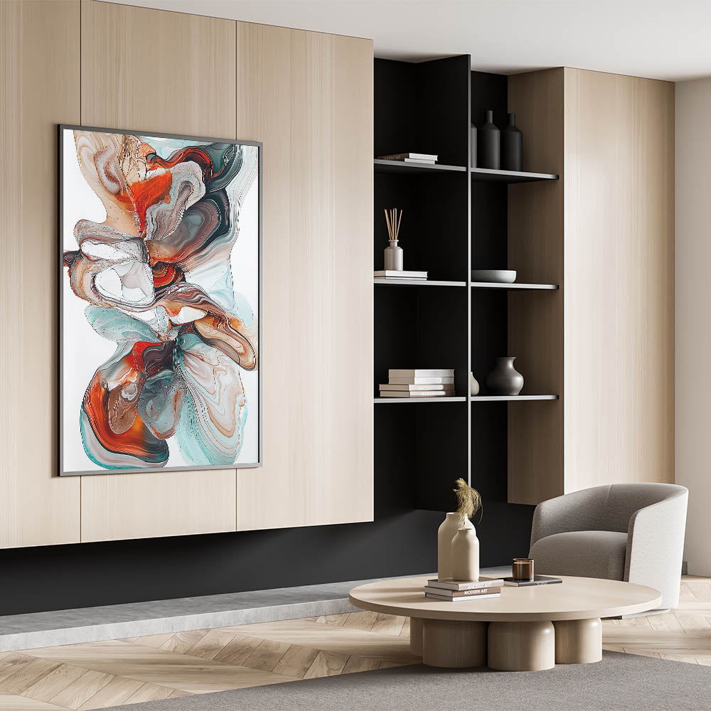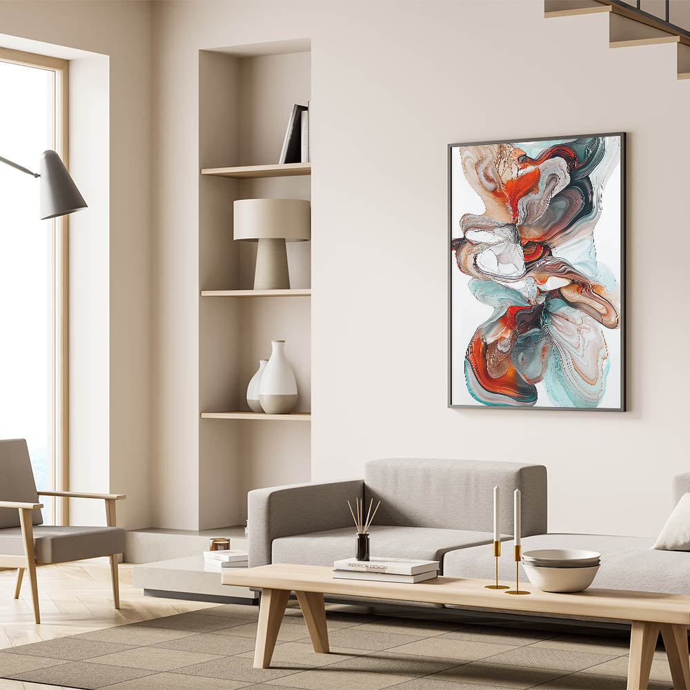 Bring a sense of movement and harmony to your space with this contemporary minimalist abstract art. This captivating design features flowing organic patterns in rich hues of burnt orange, teal, cream, and deep brown. The fluid composition creates a dynamic yet calming effect, making it a perfect addition to modern or bohemian-inspired interiors.