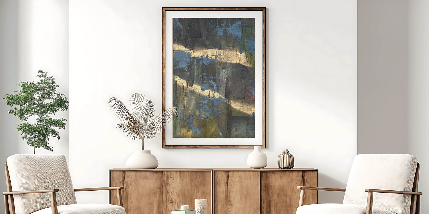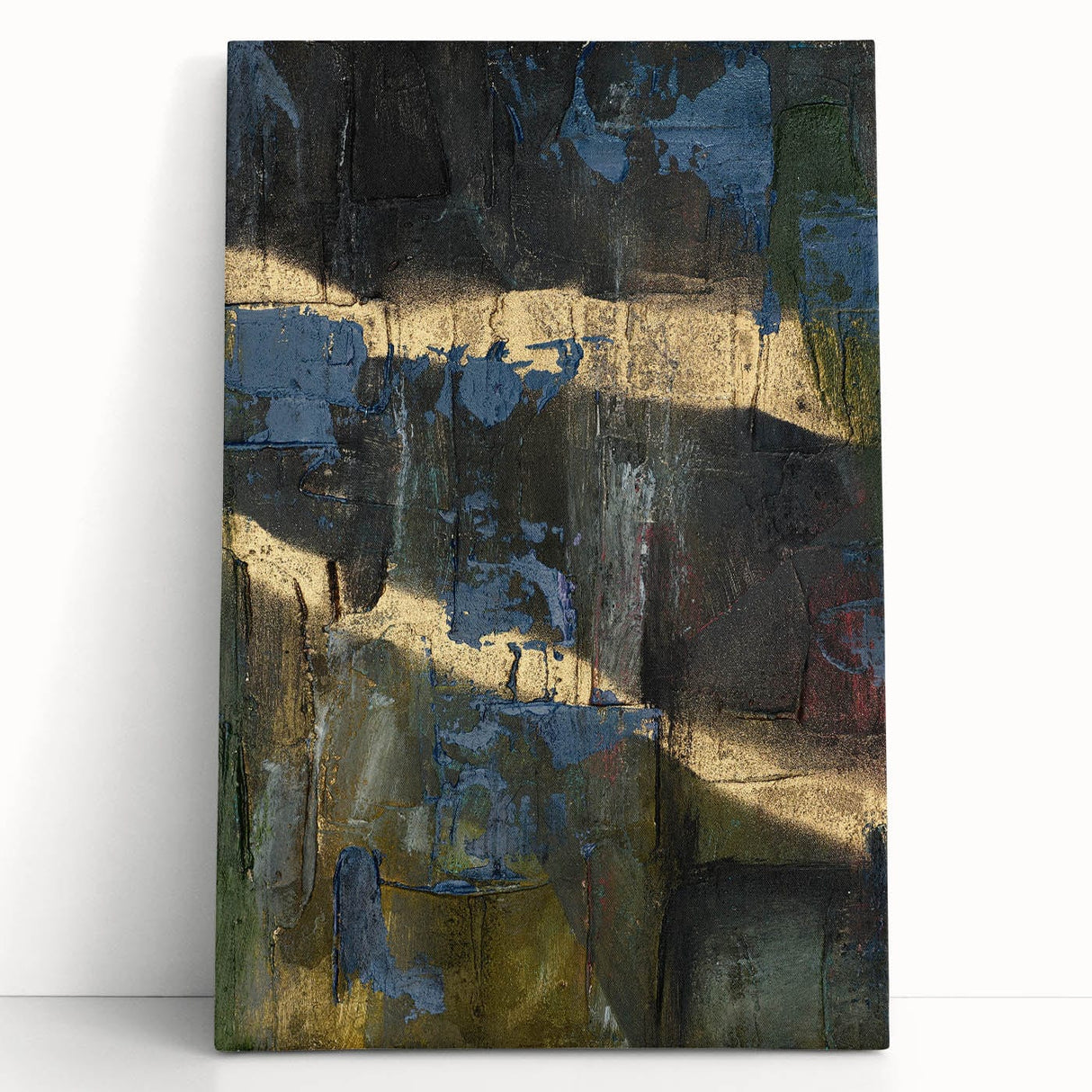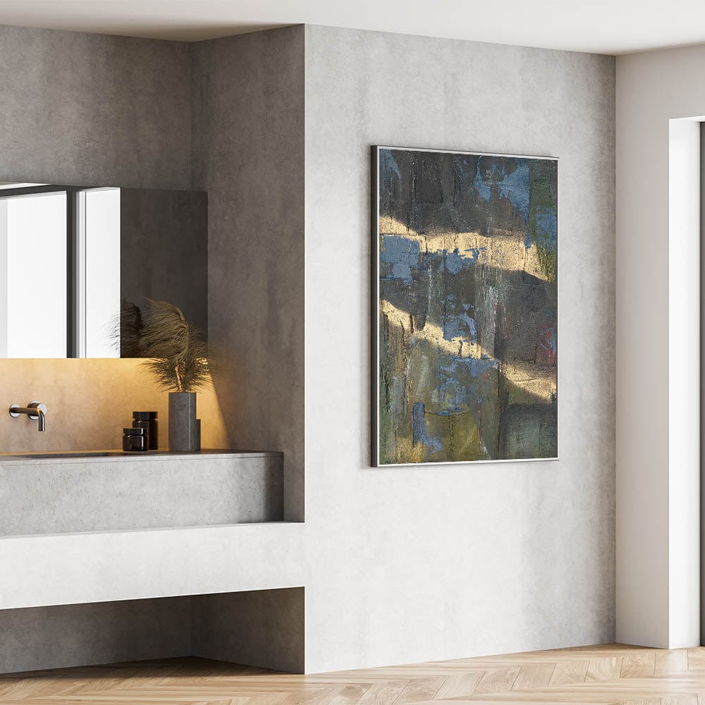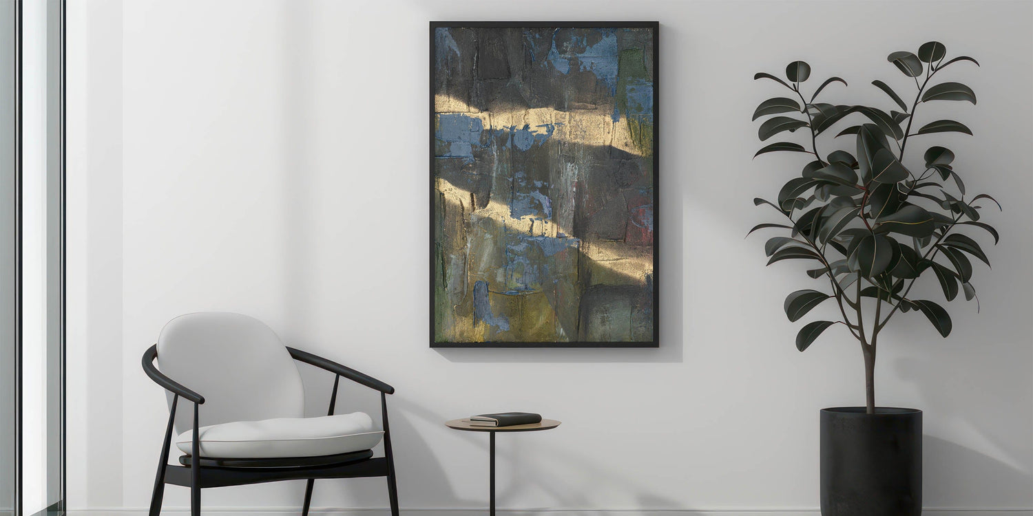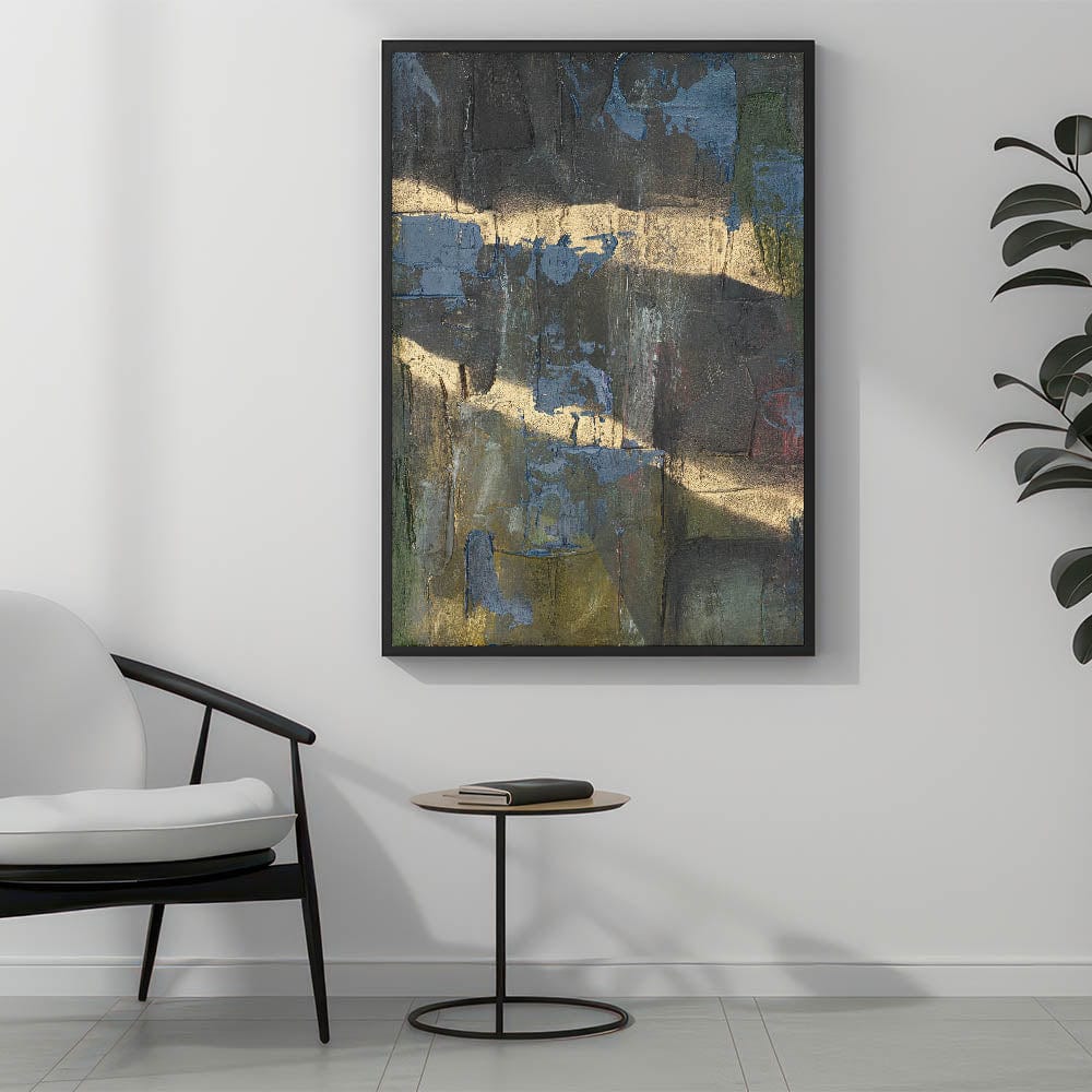 Add depth and drama to your space with this moody modern wall art, a striking fusion of black, deep blue, and gold textures. This abstract wall art features a raw and expressive composition, with layered textures and metallic highlights that create a sense of movement and mystery. The bold contrast between dark hues and shimmering gold makes this piece an ideal statement for contemporary and modern interiors.