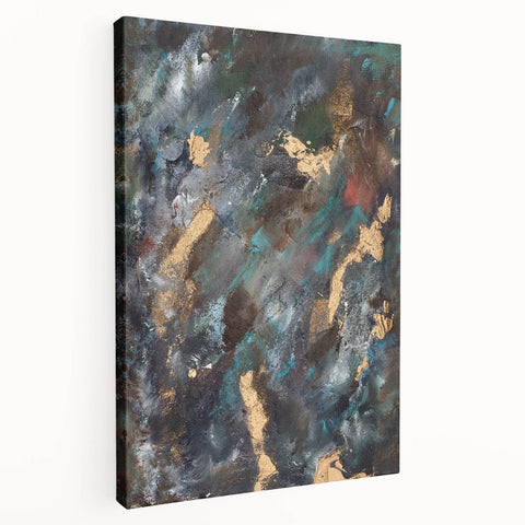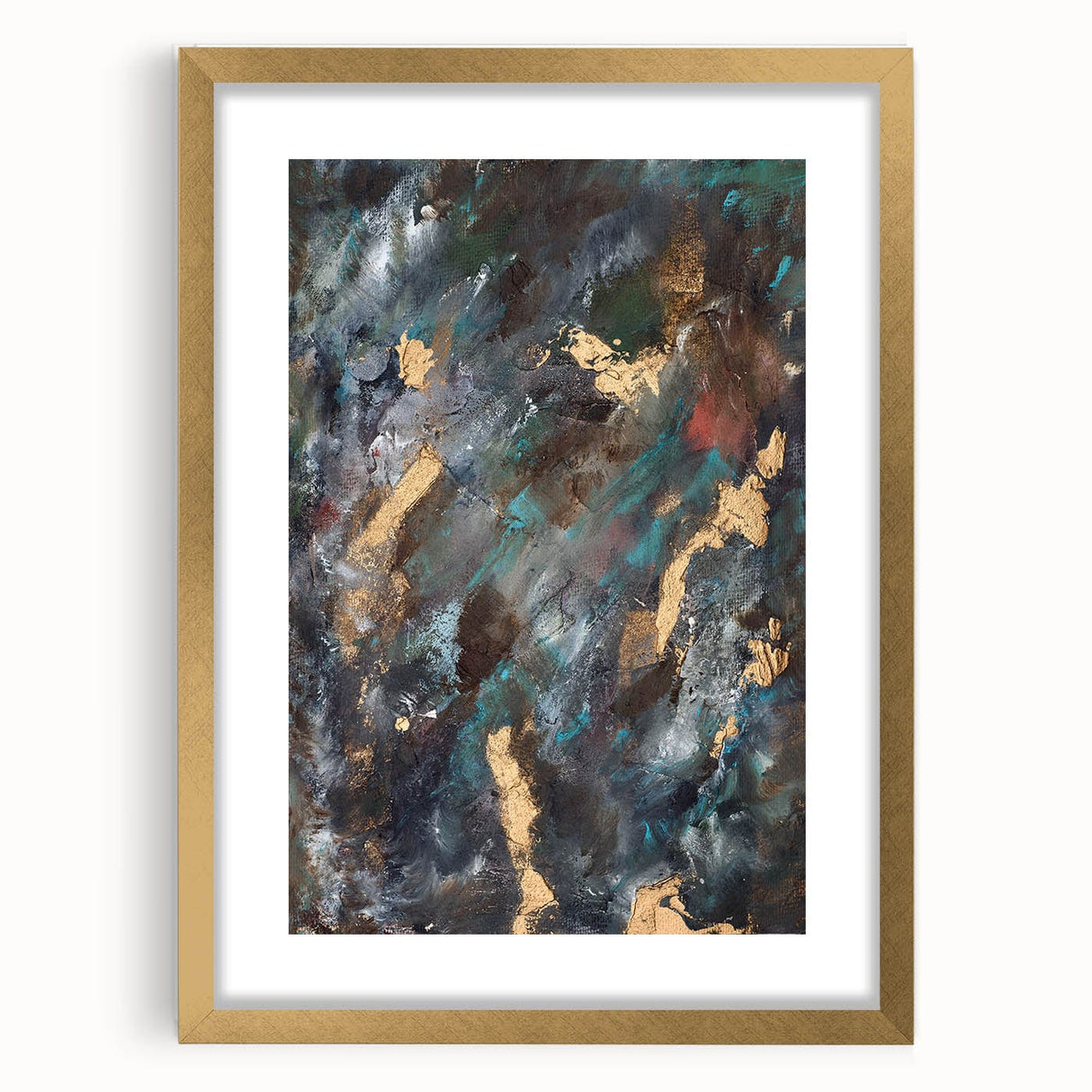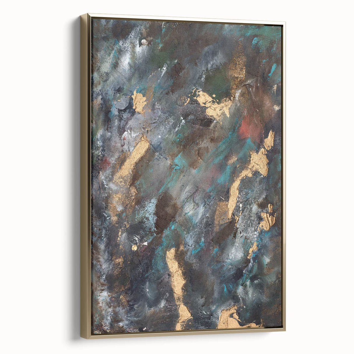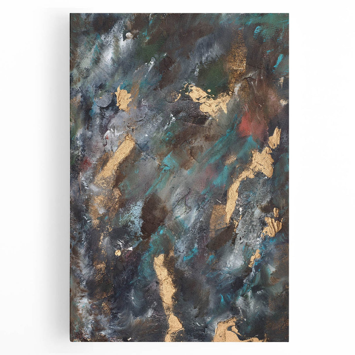 Dark Moody Modern Wall Art - Abstract Black, Teal & Gold Painting