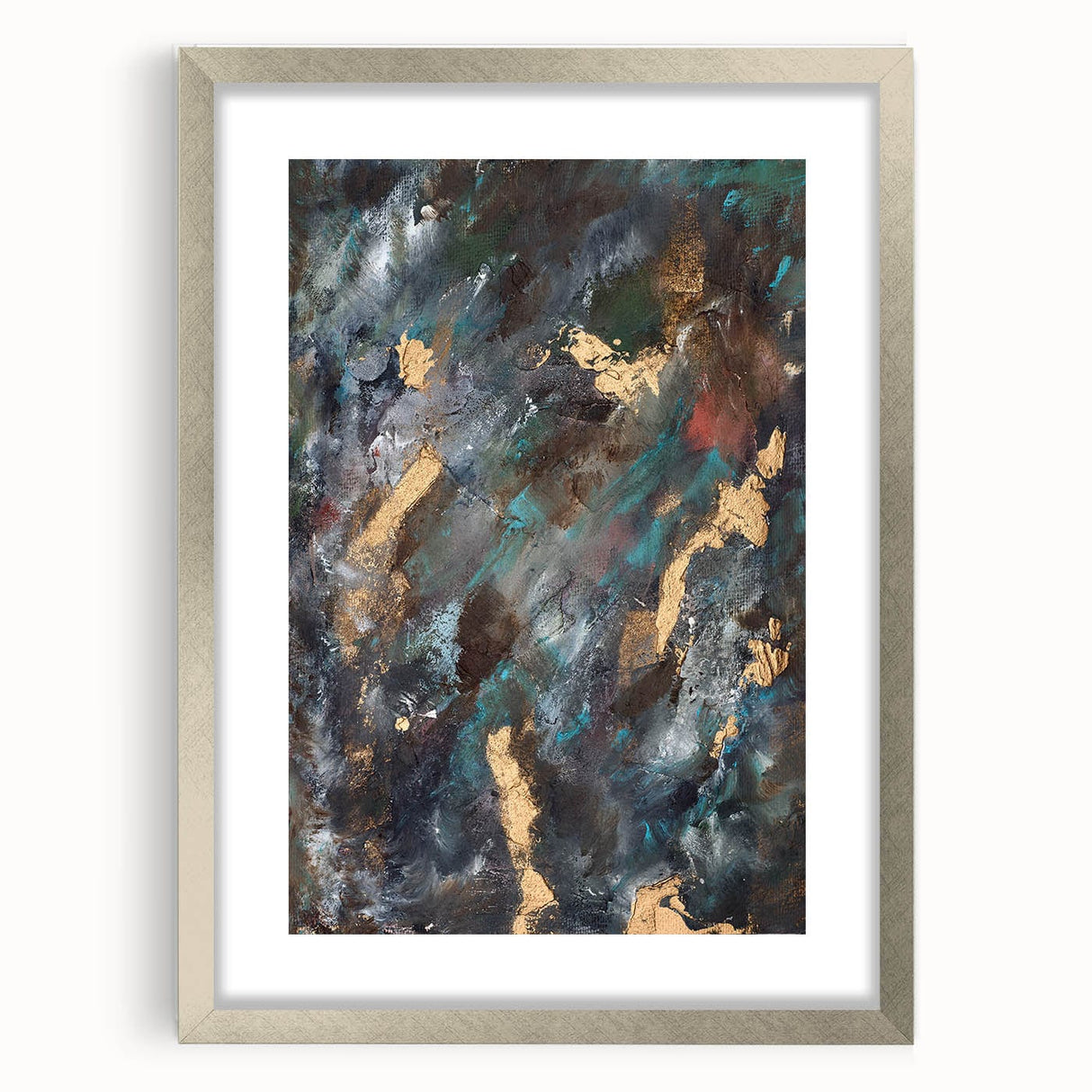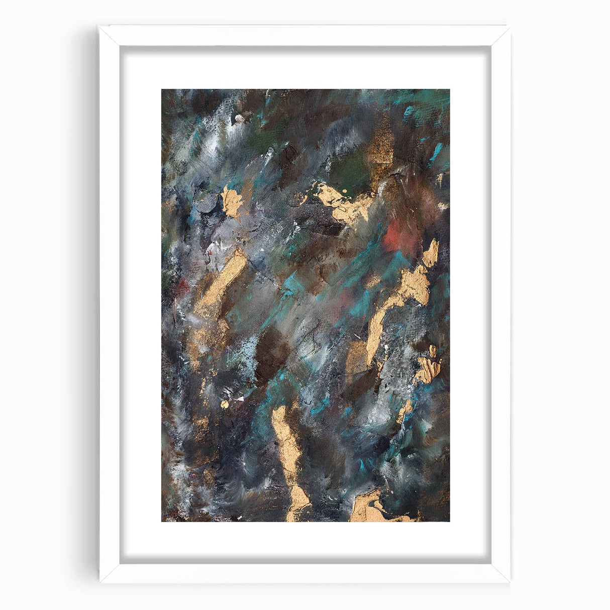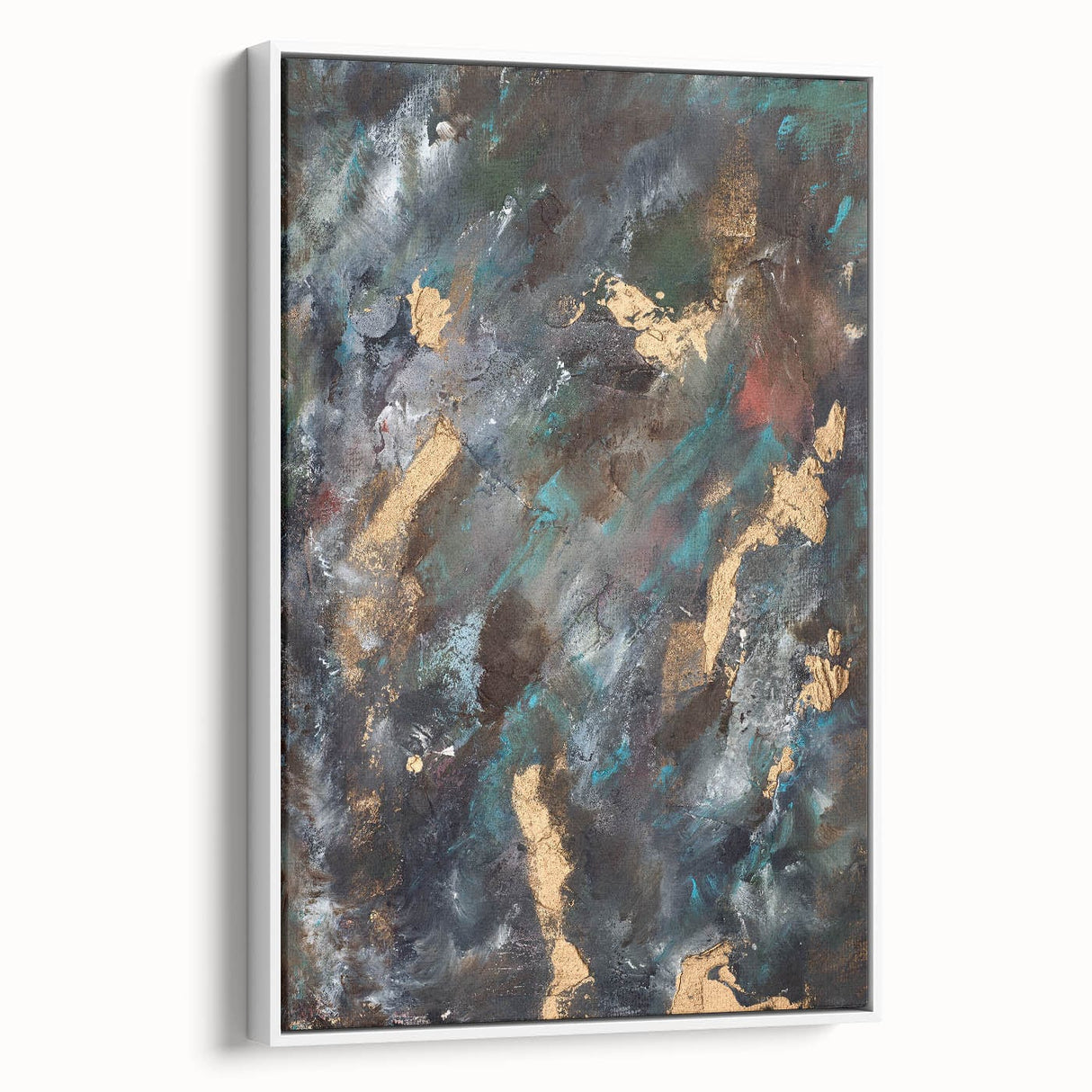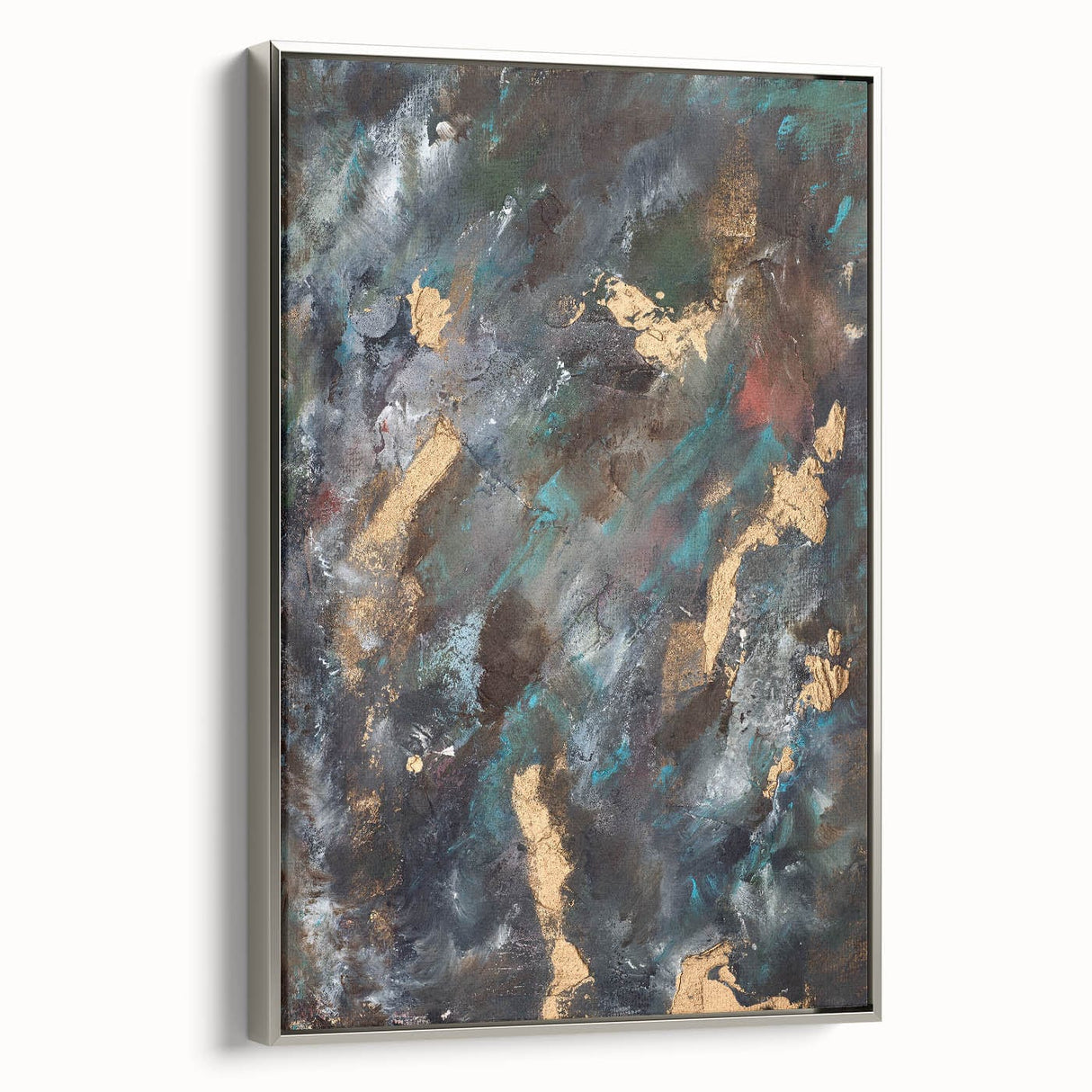 Dark Moody Modern Wall Art - Abstract Black, Teal & Gold Painting