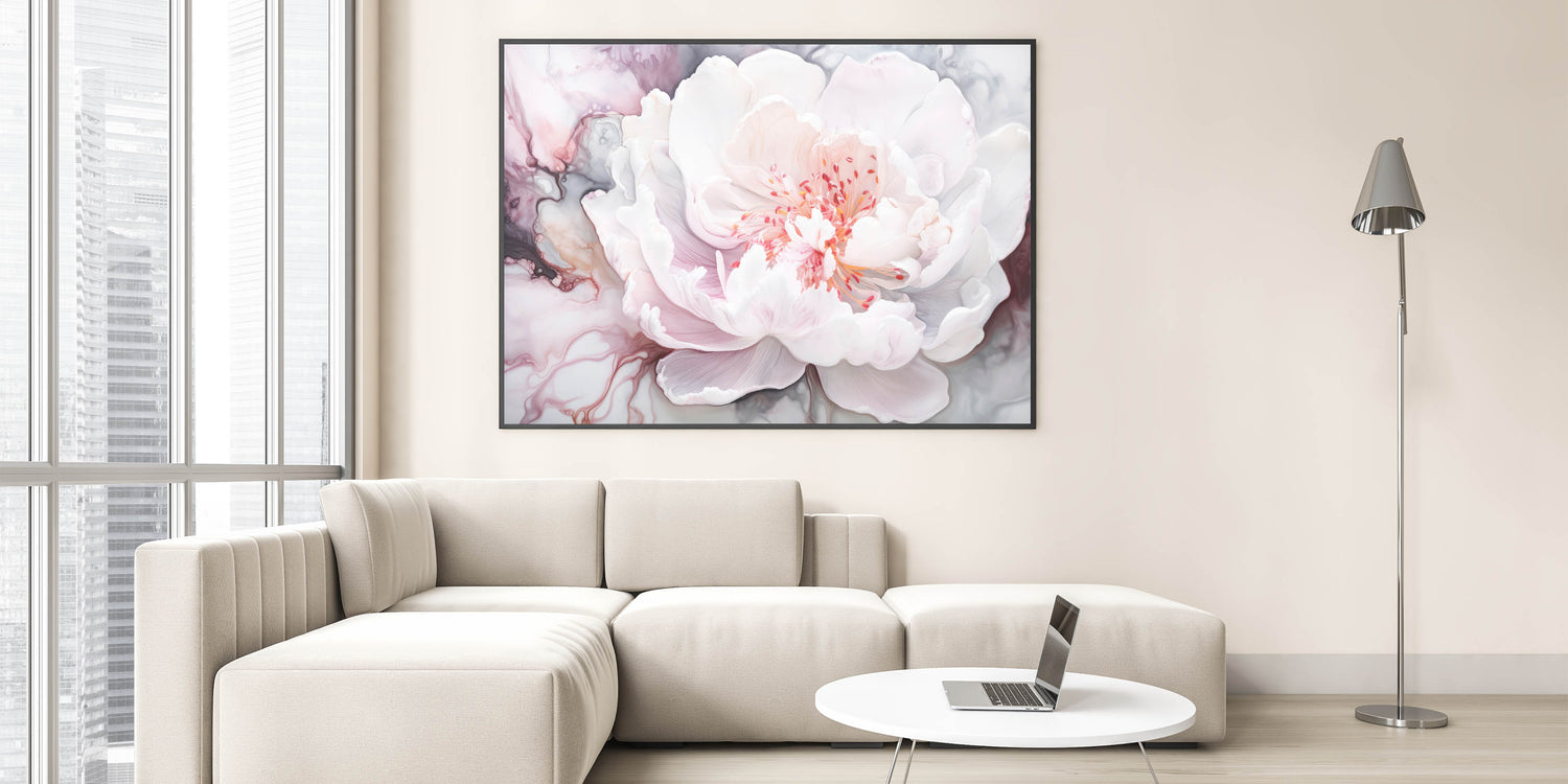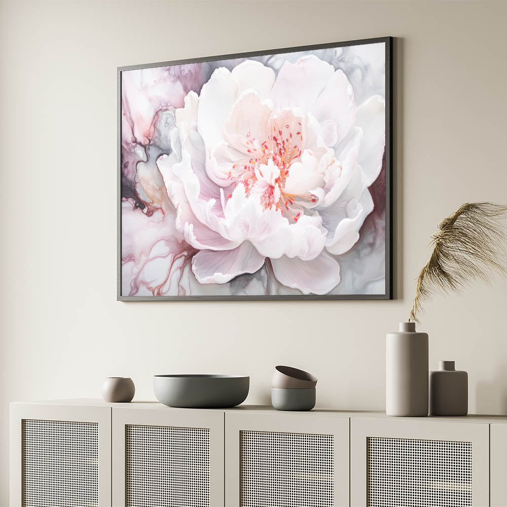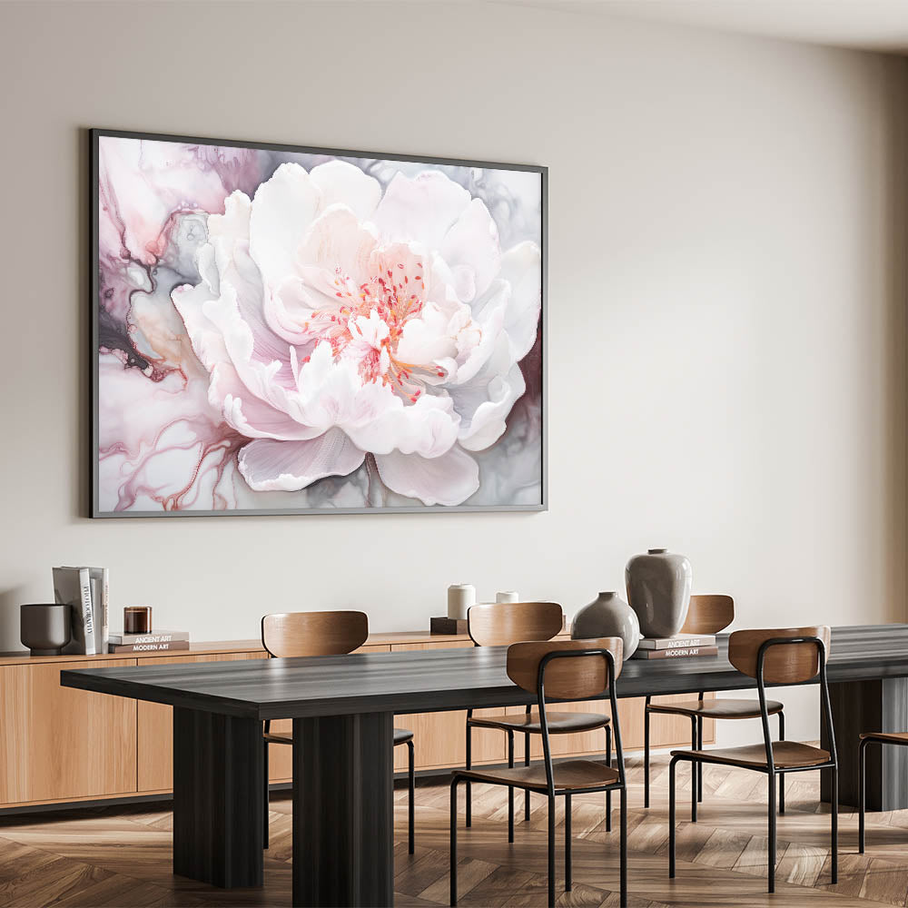Enhance your space with the ethereal beauty of this abstract floral art, showcasing a delicately rendered white peony. The soft hues of blush pink and gentle white are elegantly contrasted against swirling abstract patterns in shades of gray, creating a serene and sophisticated visual. Perfectly blending modern artistry with timeless floral elegance, this piece is a stunning centerpiece for any interior.