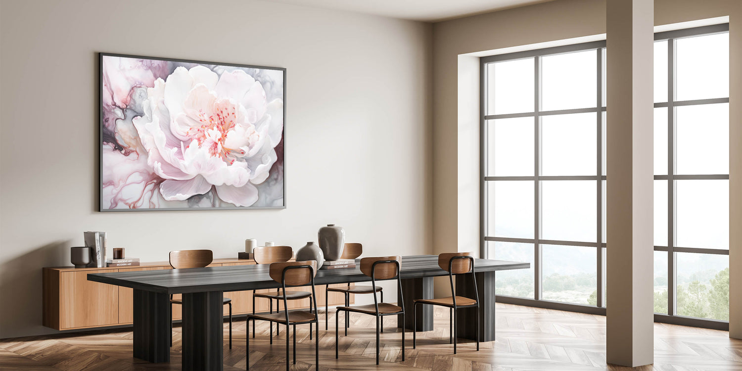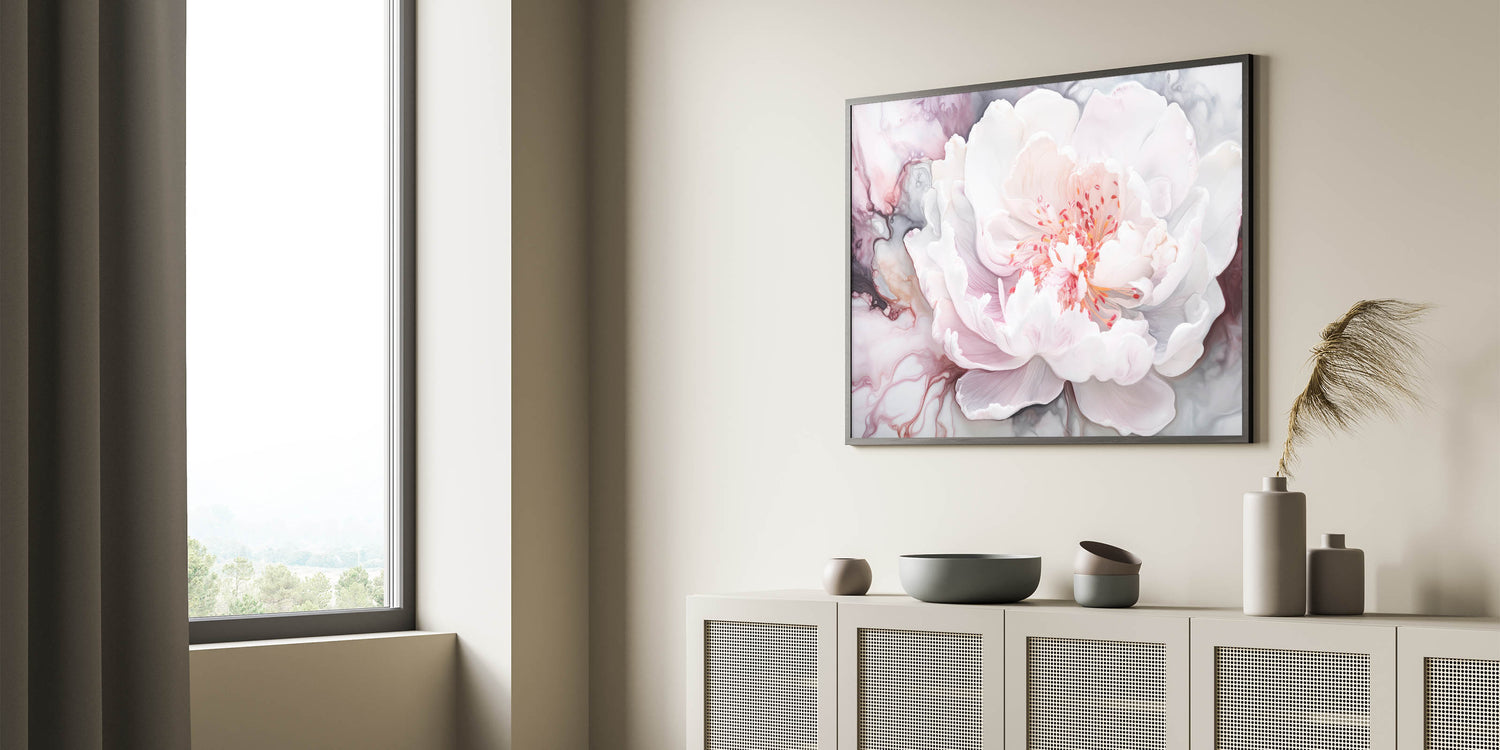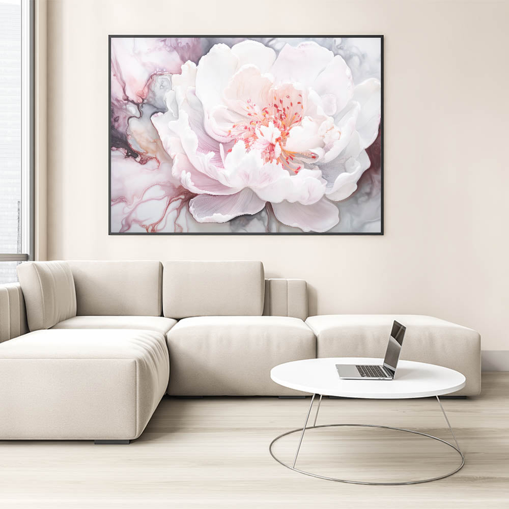Enhance your space with the ethereal beauty of this abstract floral art, showcasing a delicately rendered white peony. The soft hues of blush pink and gentle white are elegantly contrasted against swirling abstract patterns in shades of gray, creating a serene and sophisticated visual. Perfectly blending modern artistry with timeless floral elegance, this piece is a stunning centerpiece for any interior.