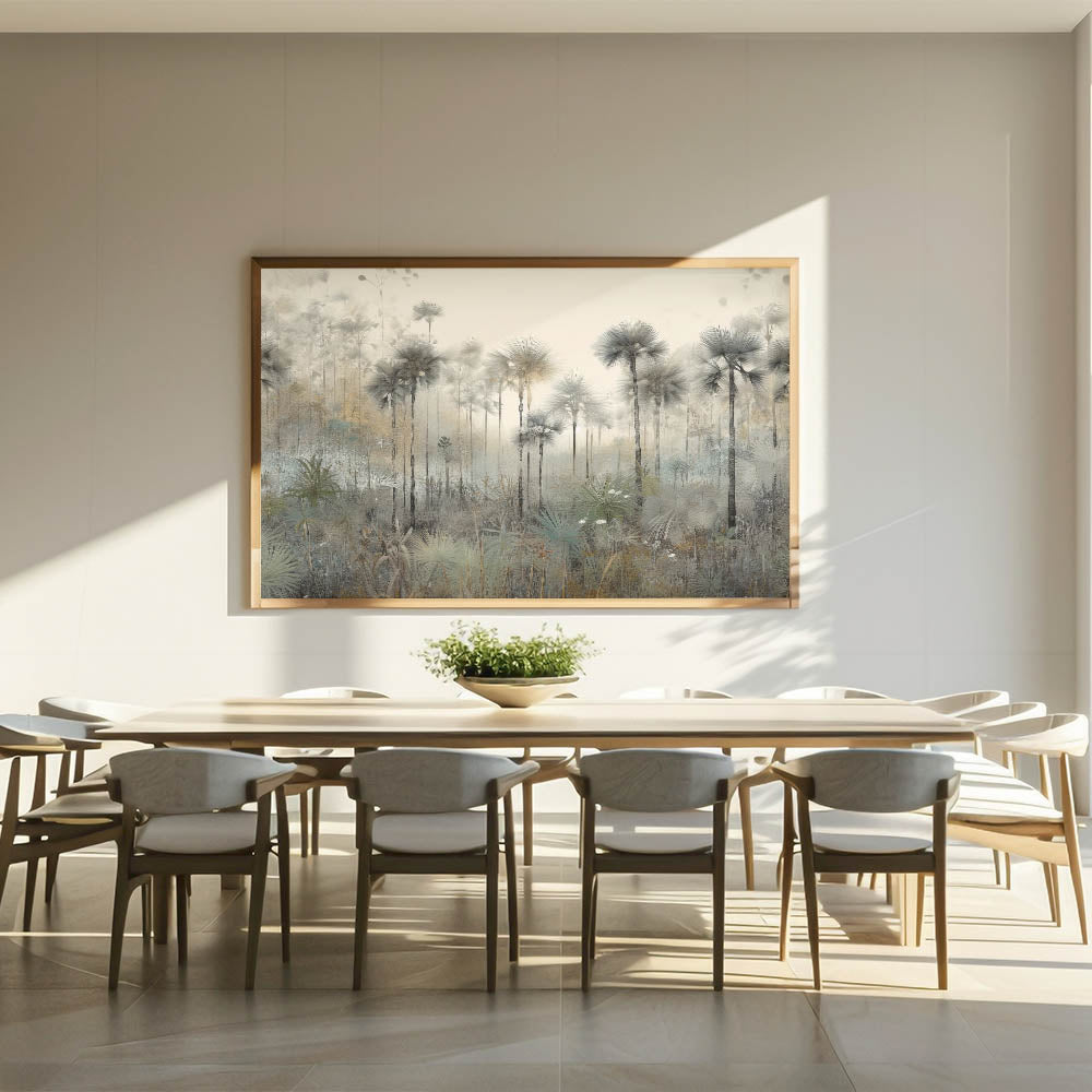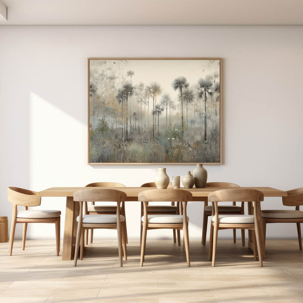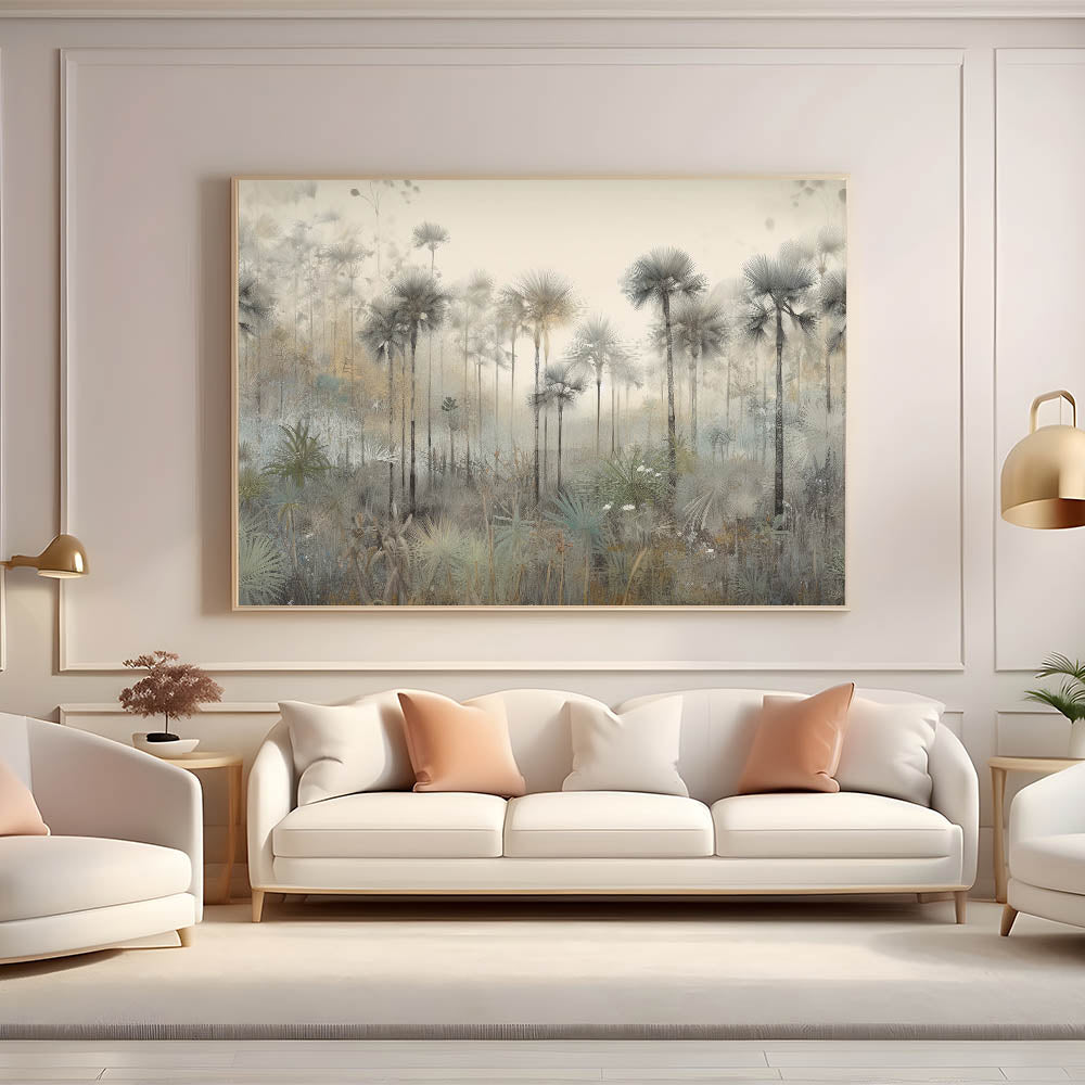 Immerse yourself in the tranquil beauty of this dreamy forest landscape art, featuring tall palm trees shrouded in mist. The subtle tones of green, gray, and beige evoke a serene, ethereal atmosphere, perfect for bringing a touch of nature’s calm into your home. This piece combines realism and abstraction, making it ideal for contemporary, bohemian, and nature-inspired interiors.