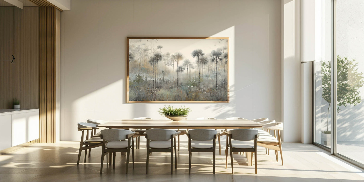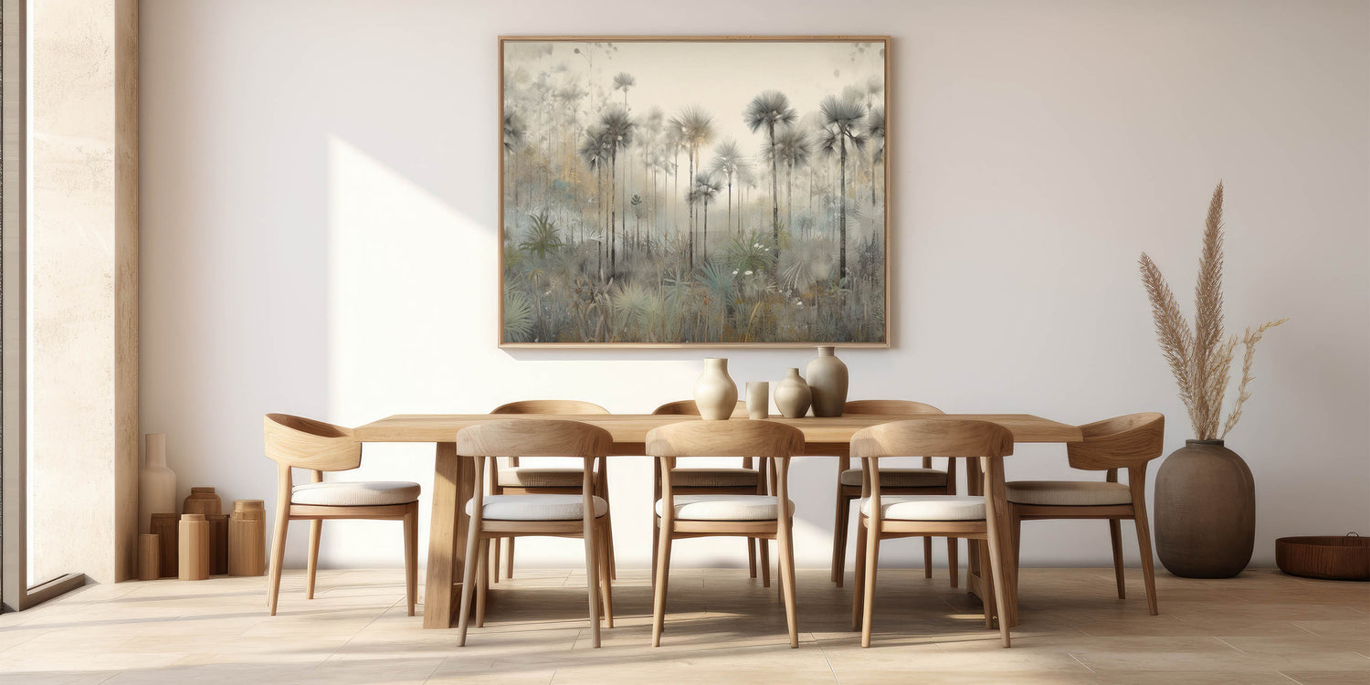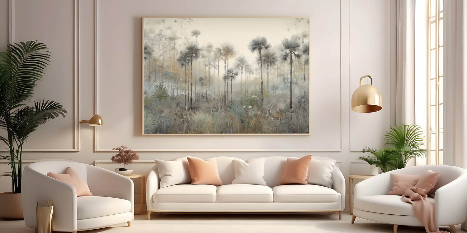 Immerse yourself in the tranquil beauty of this dreamy forest landscape art, featuring tall palm trees shrouded in mist. The subtle tones of green, gray, and beige evoke a serene, ethereal atmosphere, perfect for bringing a touch of nature’s calm into your home. This piece combines realism and abstraction, making it ideal for contemporary, bohemian, and nature-inspired interiors.
