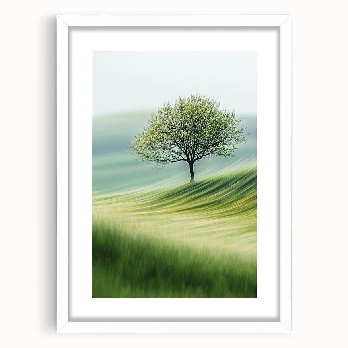 Immerse yourself in nature’s tranquility with this exquisite fine art photography print. A lone tree stands gracefully amidst rolling green hills, enveloped in a soft motion blur effect that enhances the sense of movement and serenity.