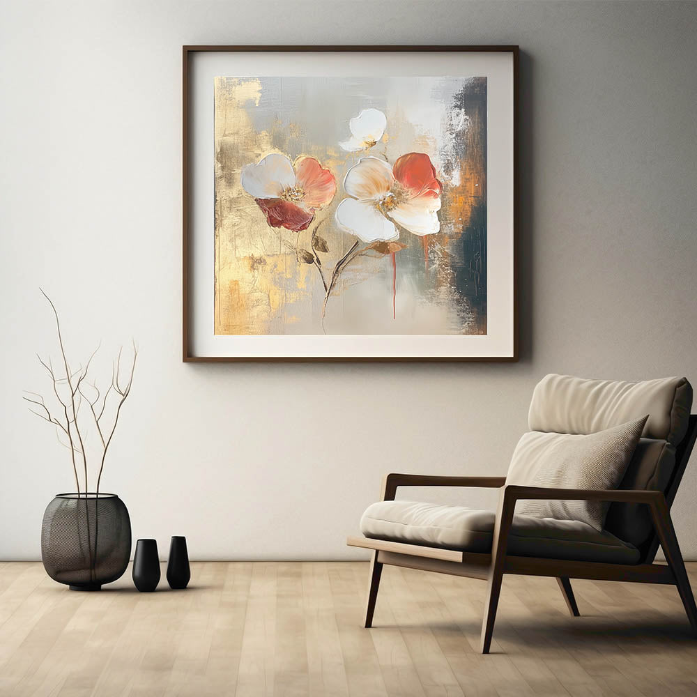 Enhance your home decor with this abstract floral artwork for home decor, featuring bold brushstrokes and rich textures in gold, red, and soft white. This modern flower abstract painting showcases a captivating blend of warm hues, adding depth and sophistication to any space. The luxurious gold accents and organic floral details make this piece a stunning contemporary botanical canvas print for those who appreciate art with elegance.