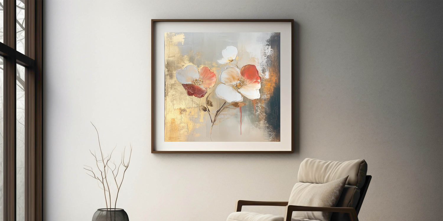- High-quality abstract floral art on canvas available in multiple sizes and materials
