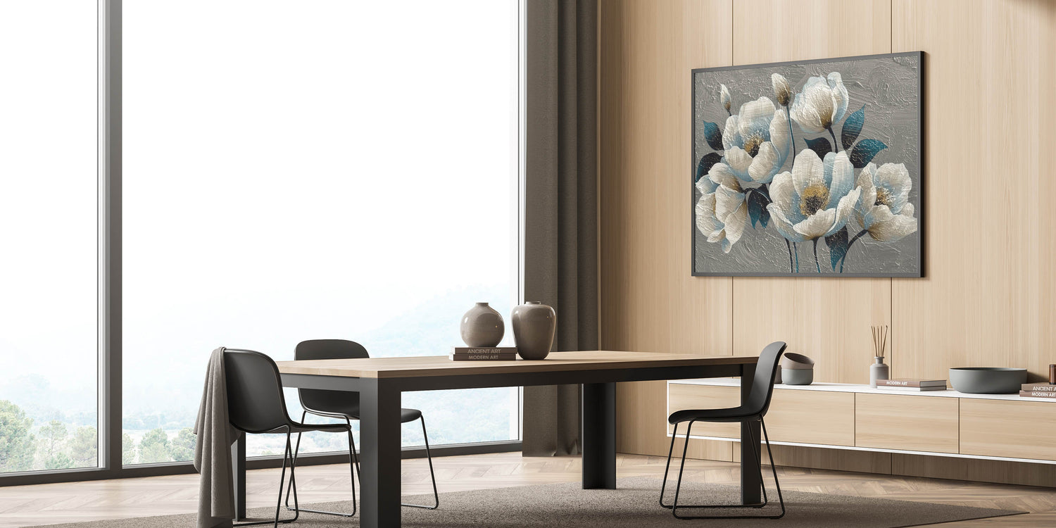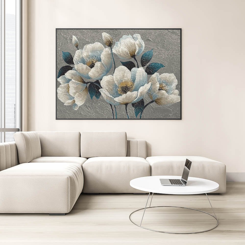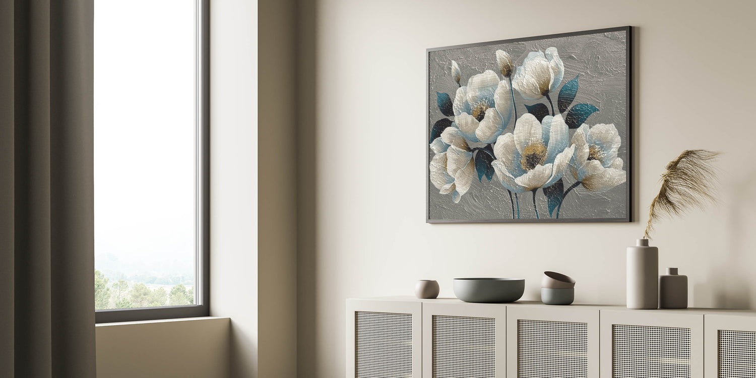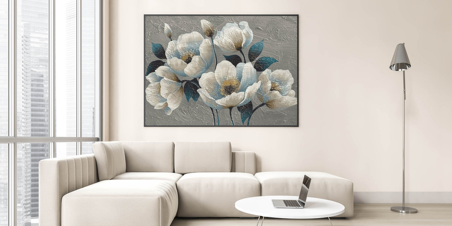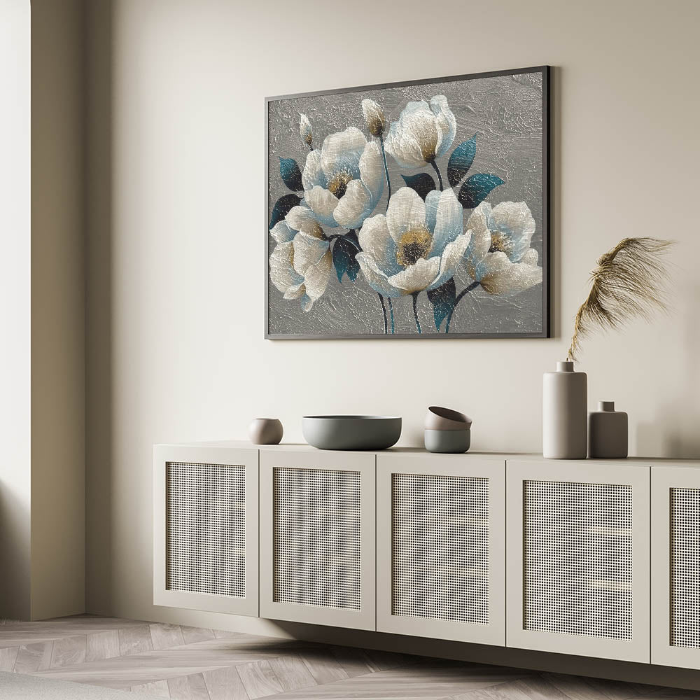 Bring a touch of elegance and sophistication to your decor with this "Elegant Floral Abstract Canvas," featuring a stunning combination of teal and cream blossoms. This textured artwork captures the delicate beauty of flowers with a modern abstract twist, showcasing rich, layered petals and deep, contrasting leaves. The intricate texture adds depth and dimension, making it an eye-catching focal point for any room.