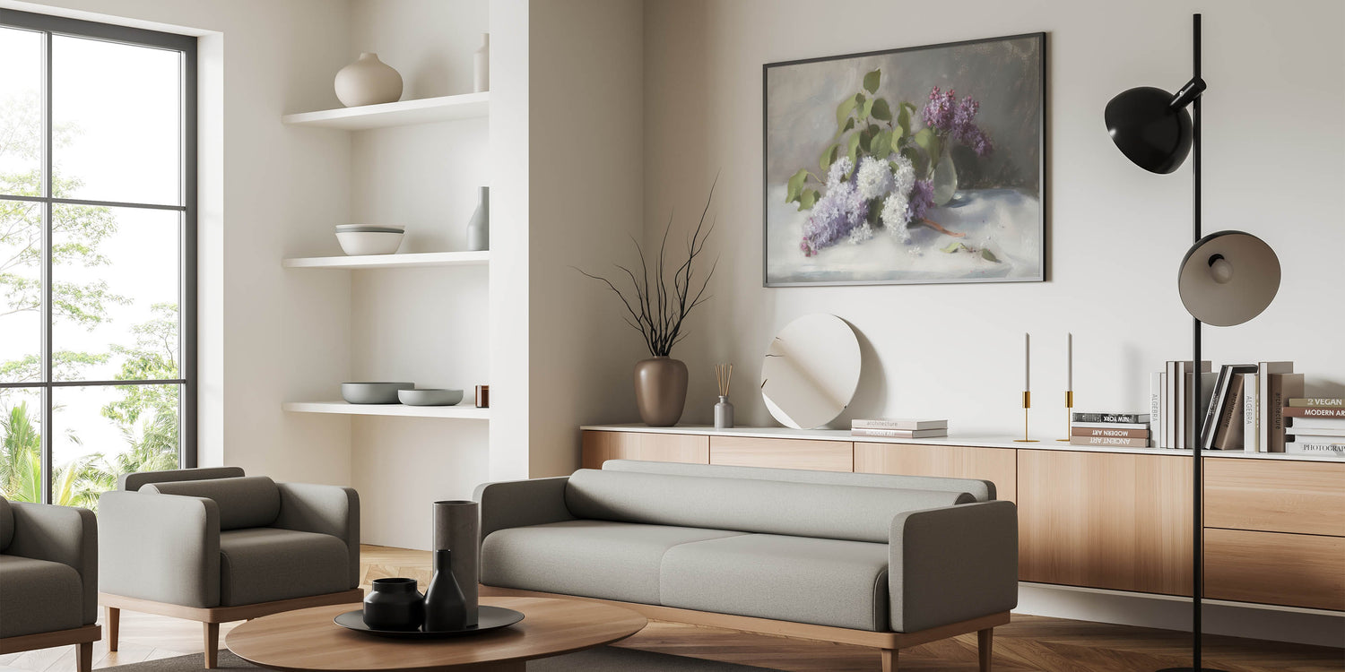 - Timeless Design: A sophisticated composition of lilac, white, and green tones against a muted backdrop.
