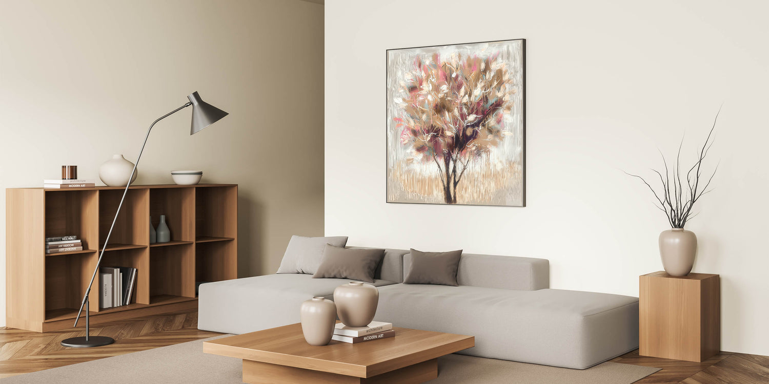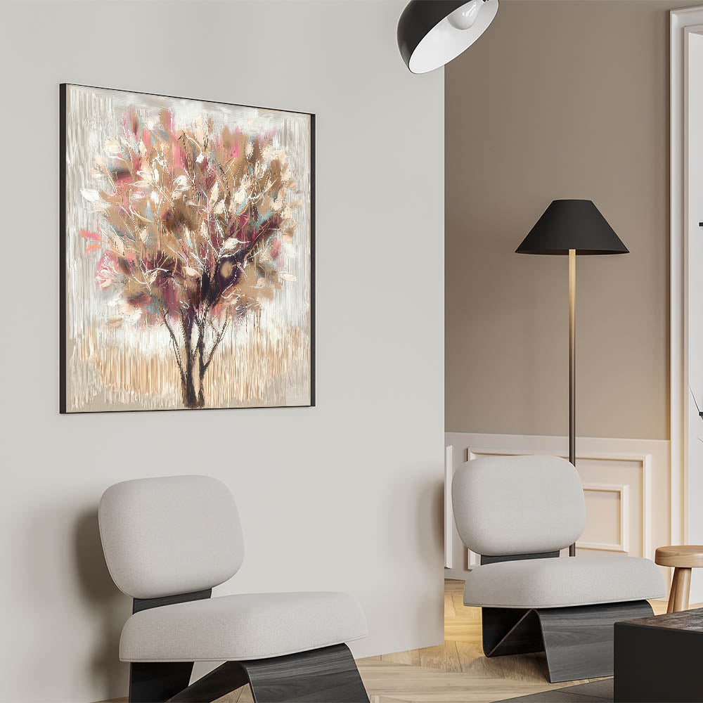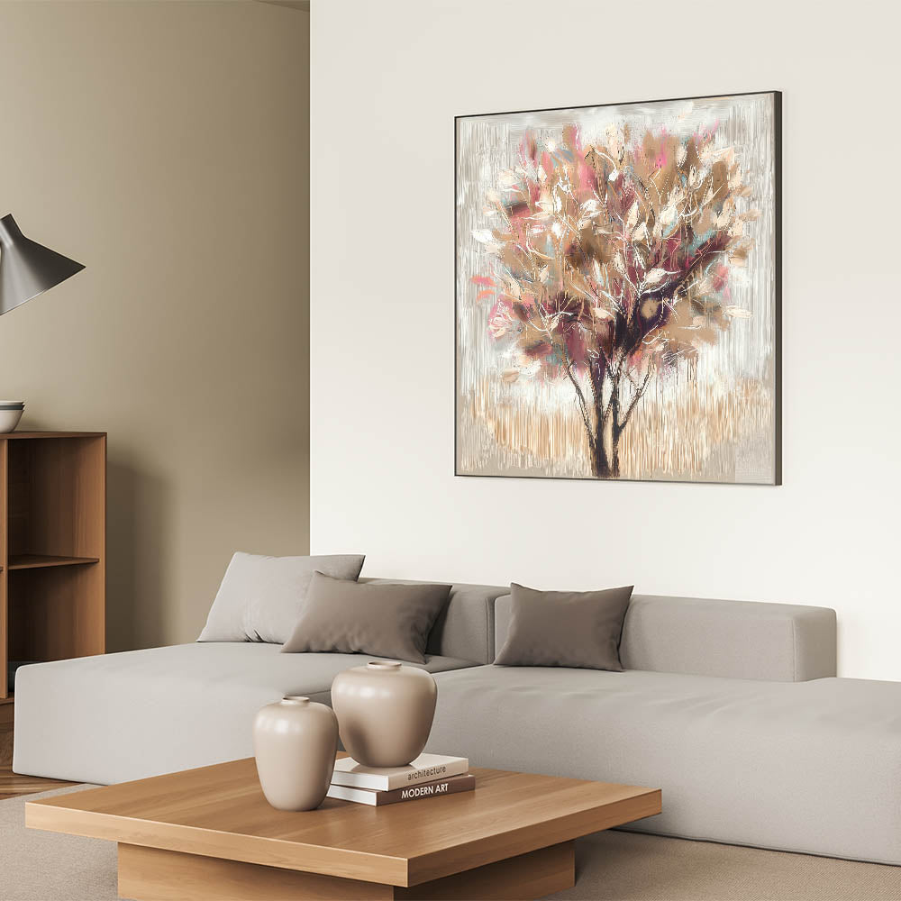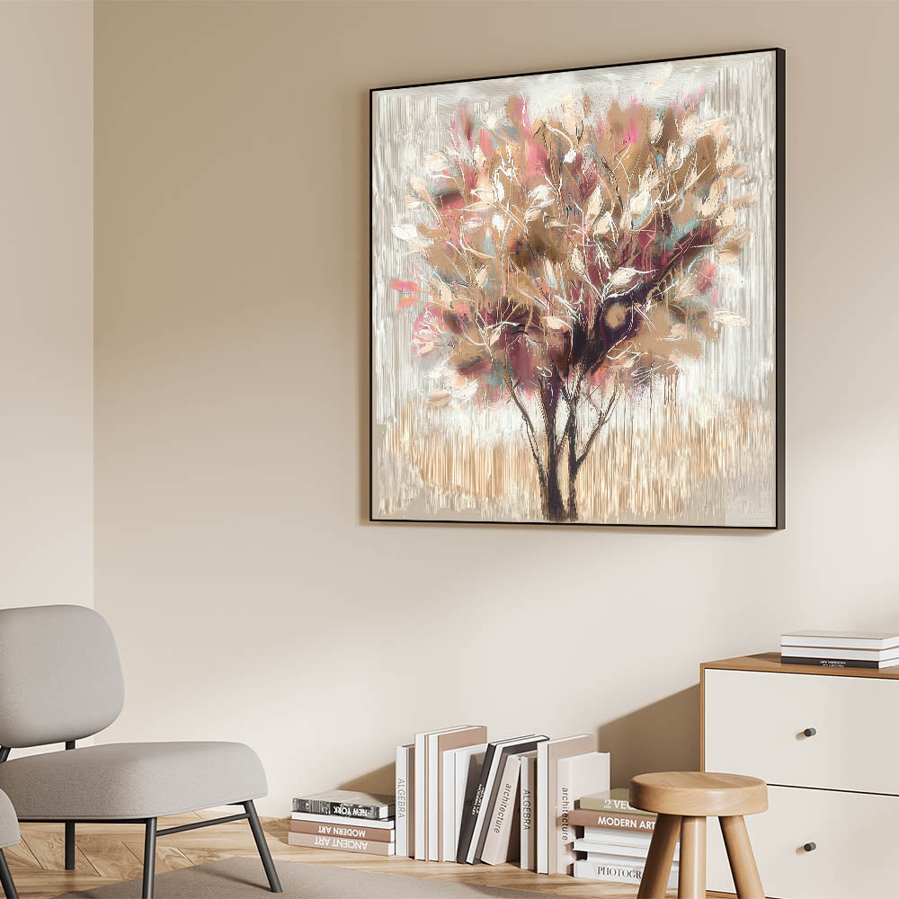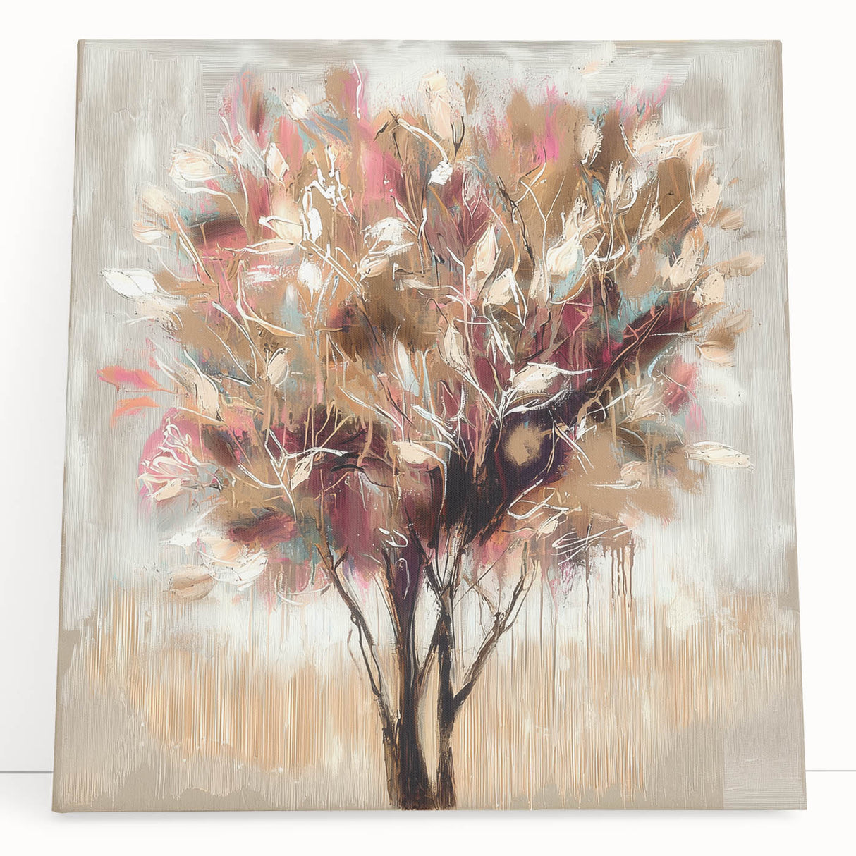 Transform your interior with this Elegant Tree Abstract Art, a graceful depiction of nature's beauty rendered in soft, soothing tones. This artwork showcases a tree adorned with delicate leaves in blush pink, creamy white, and earthy beige hues, set against a muted background. The blend of soft brushstrokes and subtle textures evokes a feeling of serenity, making it a perfect piece for modern and minimalist spaces.